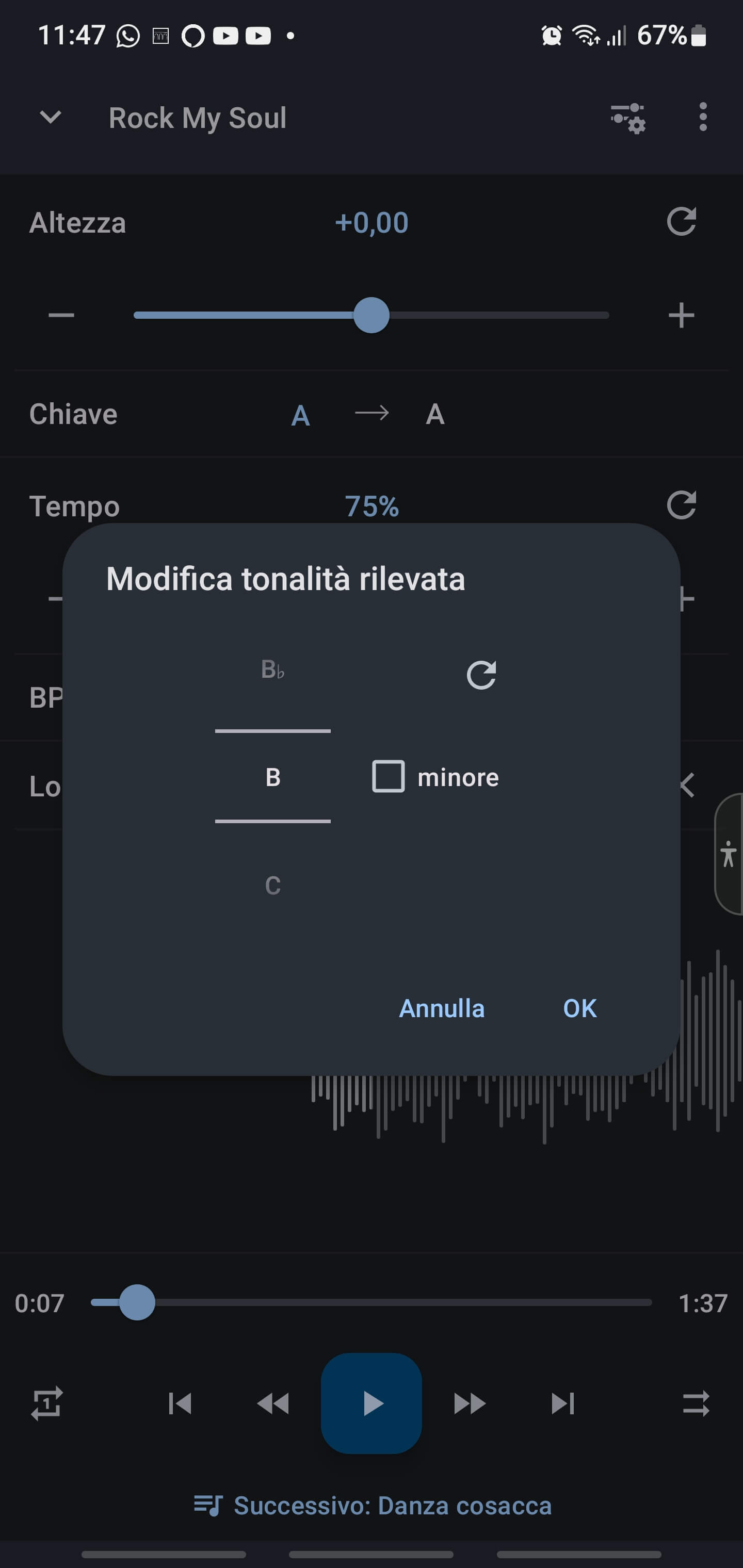 Un’app che trovo funzioni benissimo (se uno accetta di essere interrotto ogni tanto da una pubblicità, risulta anche completamente gratuita!) è Music Speed Changer che, contrariamente a quanto uno sarebbe portato a pensare dal suo nome, ha ben più funzionalità rispetto al solo consentire di modificare la velocità di esecuzione di un brano! Apparentemente si presenta come un consueto player di brani mp3 consentendo una ricerca/esecuzione dei brani in base al titolo/autore/album. Però, effettuando il play di un brano, viene aperta una finestra che presenta diverse opzioni che permettono, ad esempio, di modificare il tempo di esecuzione (mostrandone il BPM), l’altezza, la chiave, la messa in loop di tutto o di parte del brano…: diverse sono le possibili funzionalità mostrate nella pagina su cui si può agire per modificare temporaneamente l’esecuzione del brano scelto e queste dipendono dalla scelta (anche personalizzabile) che uno effettua a livello di configurazione dell’app (agendo sull’icona in alto a dx a forma di equalizzatore/rondella di configurazione): si noti che le configurazioni impostate permangono nel tempo fin quando uno non la modifica, per cui uno se la ritrova riaprendo l’app e/o eseguendo anche altri brani. Nel seguito mostro alcuni screenshot che mostrano alcune delle funzionalità attivabili e personalizzabili: