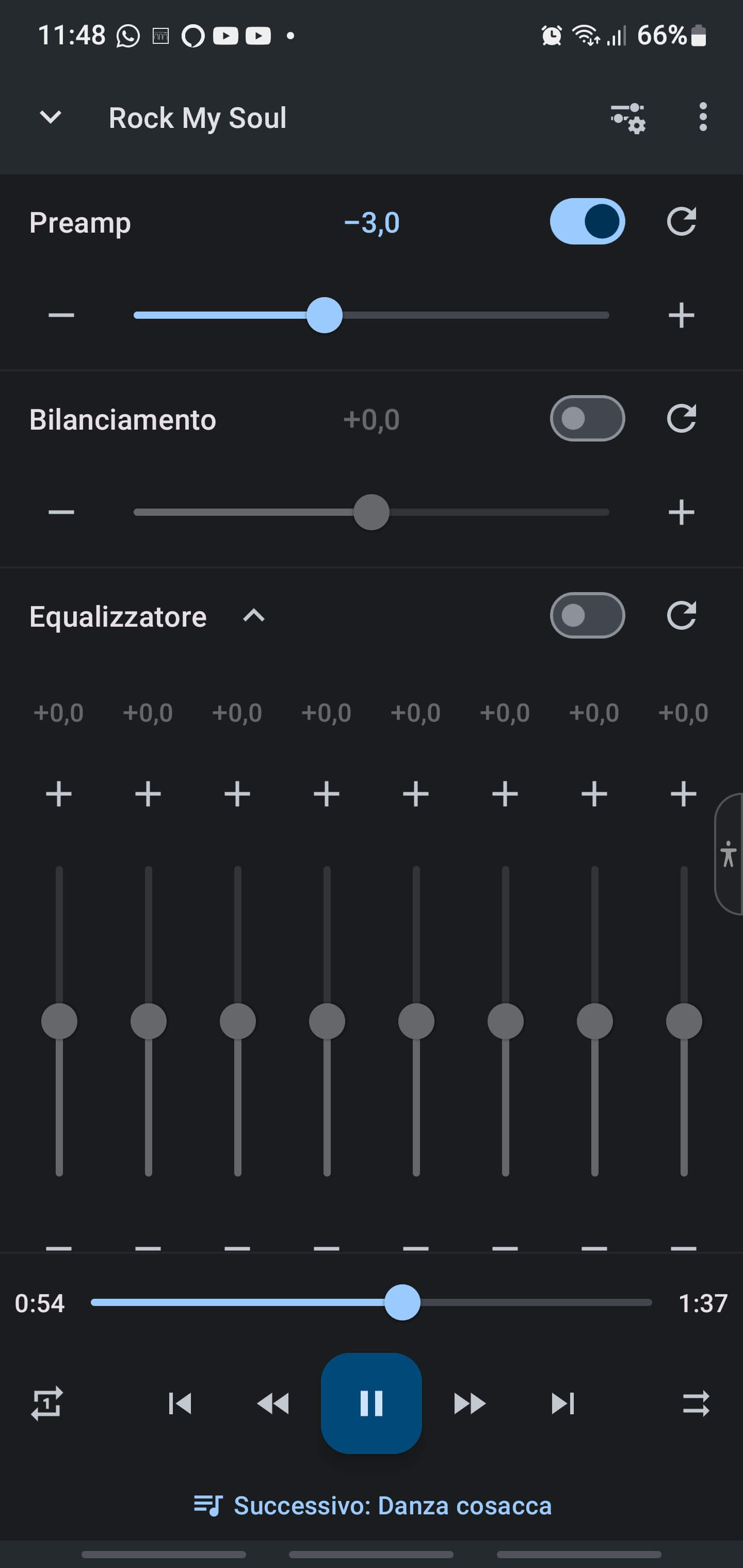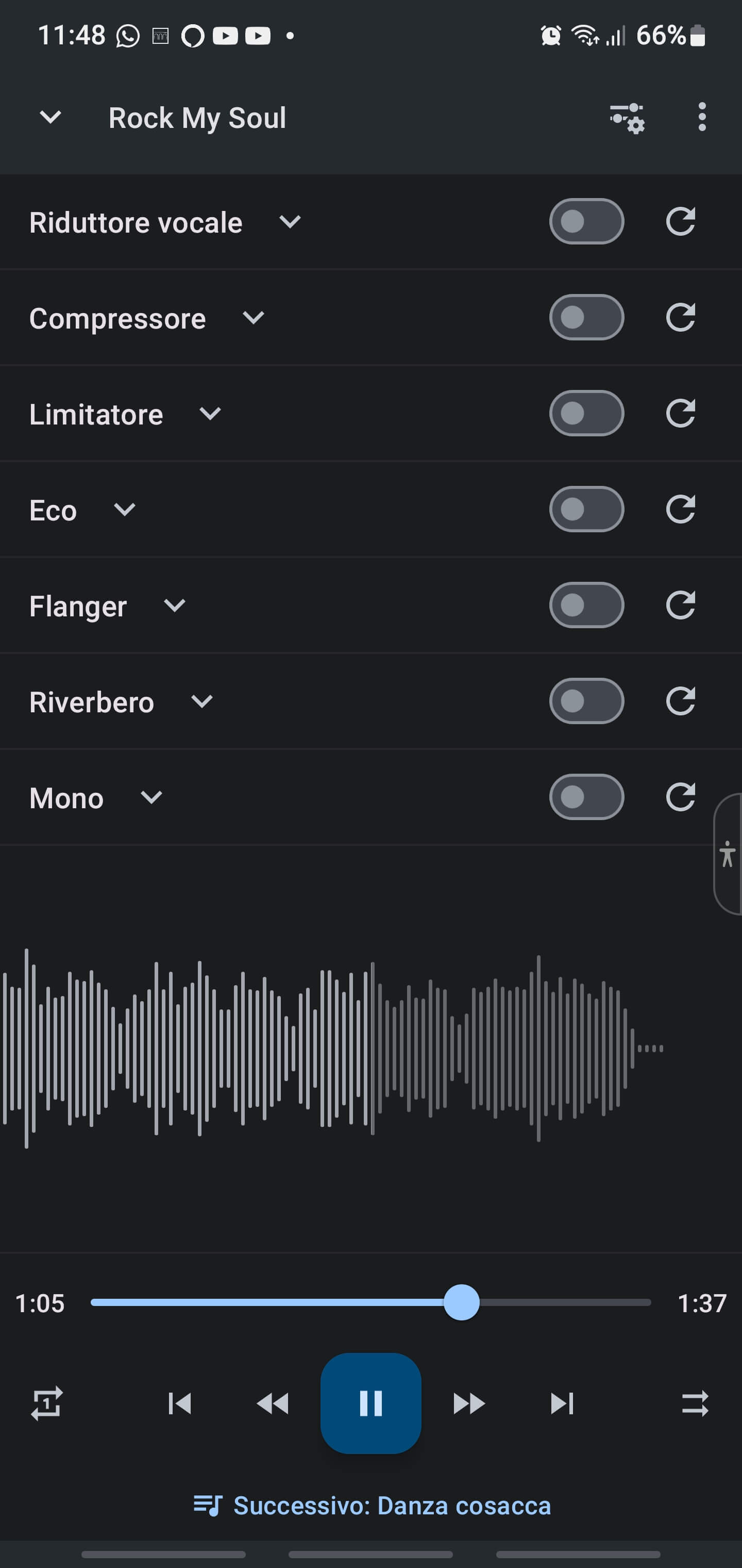 A chi non l’avesse ancora notato vedendo gli screenshot che ho messo, ci tengo a evidenziare che tra le molteplici funzionalità, quest’app ne presenta alcune davvero particolari come il Separatore di brani: consente, dopo opportuna sua elaborazione dell’audio indicato, di separare i brani nei singoli strumenti (voci, batteria, basso, pianoforte e accompagnamento) e permette poi di regolare indipendentemente il volume di ciascuno di essi.
