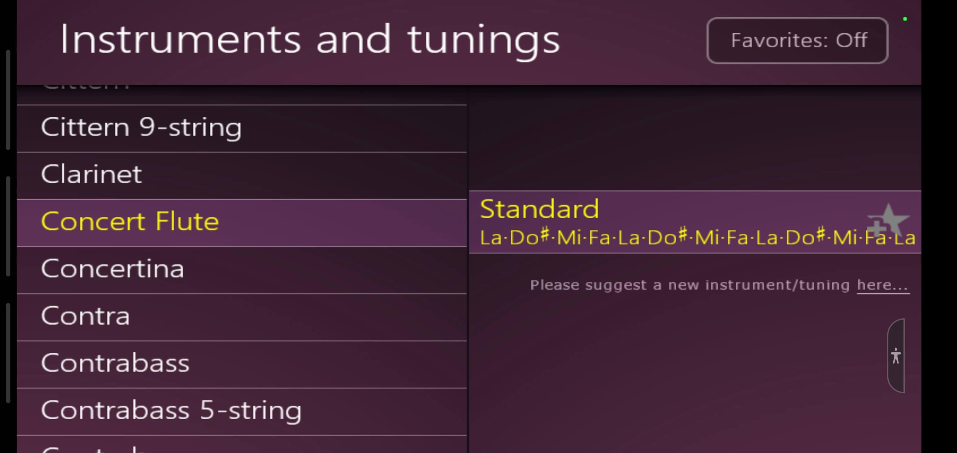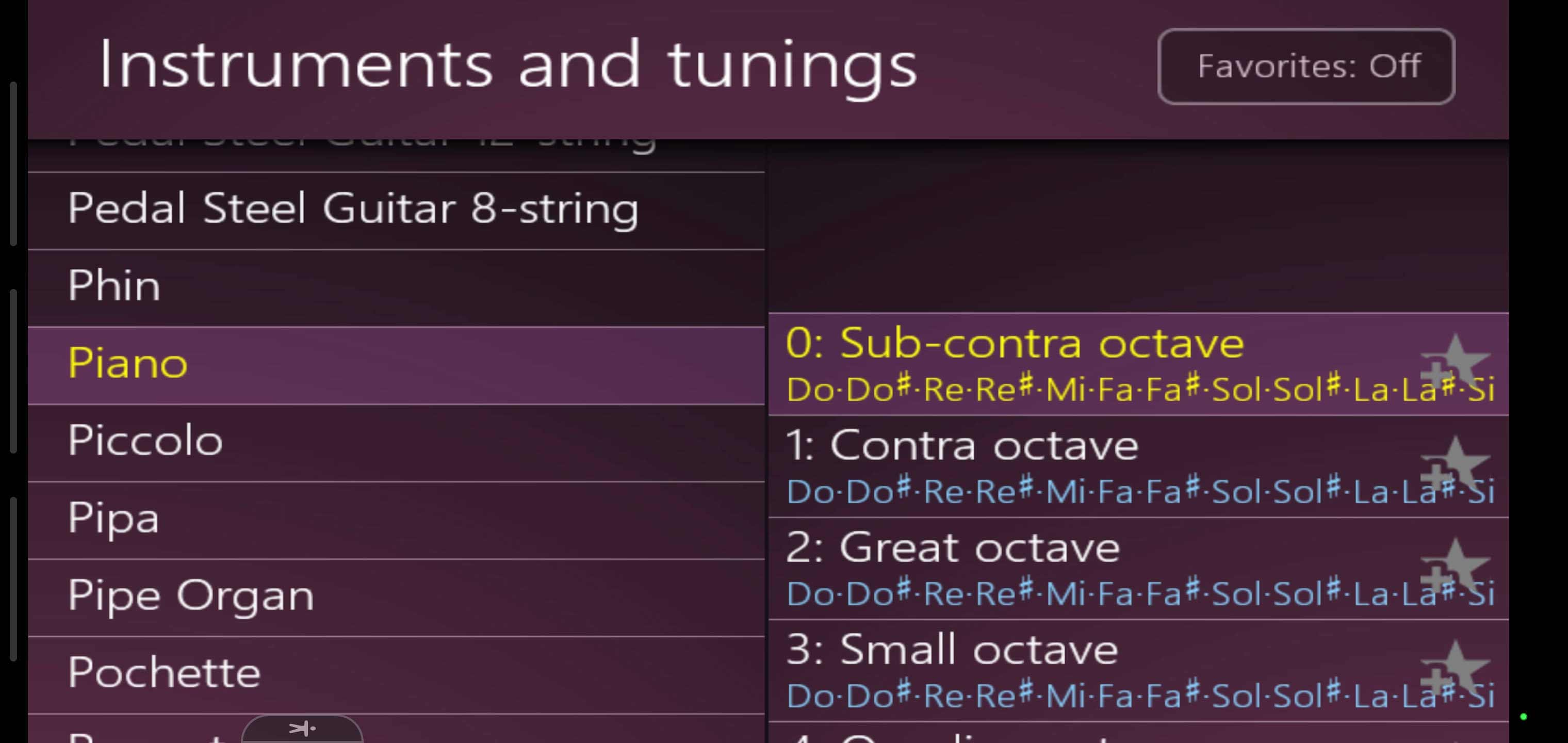 In breve, consente di scegliere la tipologia di strumento da accordare tra molteplici presenti (a corda, a fiato e a tastiera) con la possibilità di scelta di accordature anche non standard. Si può poi impostare un sottoinsieme di strumenti/accordature come Favorites, in modo da poter visualizzare un elenco più contenuto all’utilizzatore che ben difficilmente dovrà accordare le decine e decine di strumenti disponibili! 😳