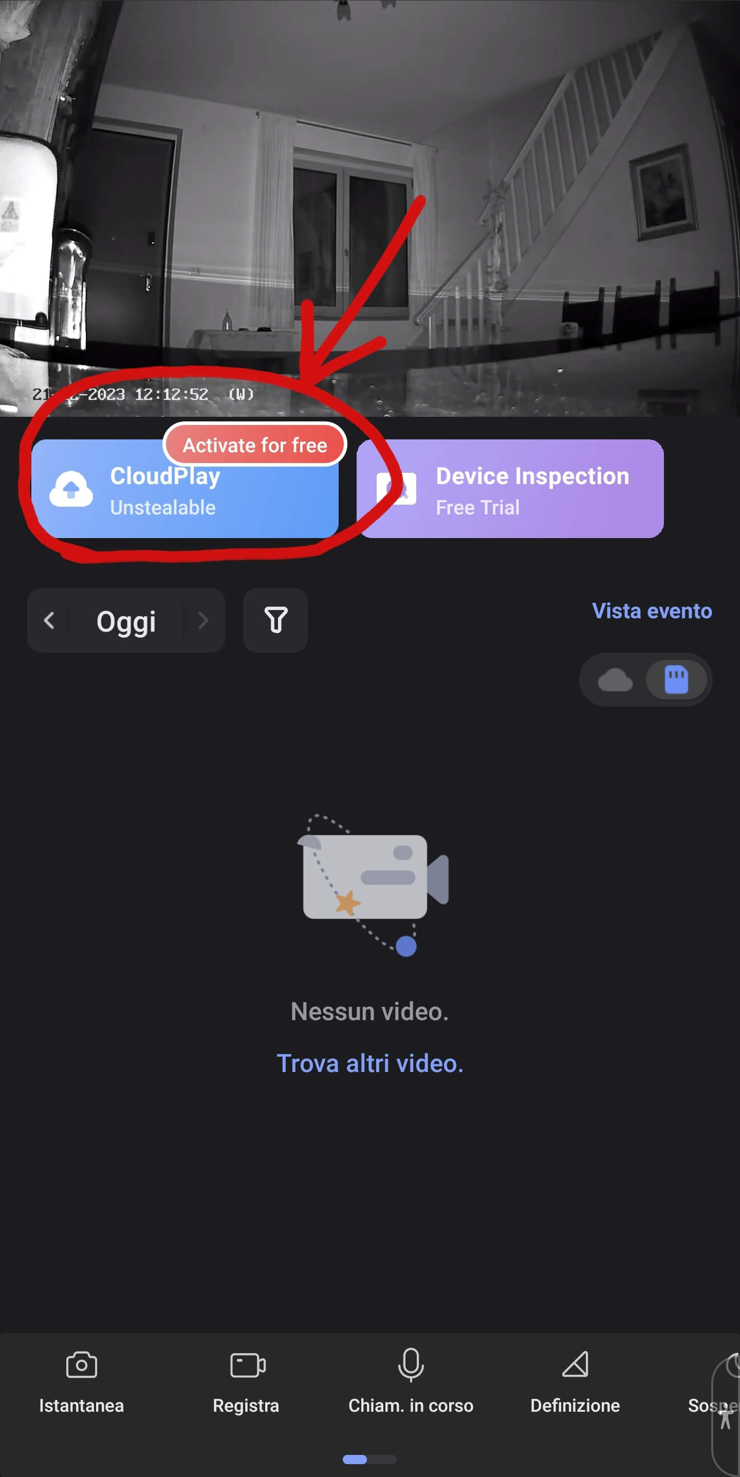 Nel seguito i passaggi necessari per attivare la funzionalità di memorizzazione gratuita su cloud Ezviz per le ultime 24 ore (funzionalità attuslmente disponibile solo per telecamera C3X): se uno non sceglie poi di effettuare un abbonamento effettivo per avere una memorizzazione per tempi maggiori, il servizio continua a rimanere gratuito per sempre. Ovviamente questa funzionalità è associata a ciascuna telecamera e, se uno ne ha più di una, la si può attivare eventualmente anche solo per alcune. Quindi, basta premere sul pulsante azzurro CloudPlay quando si è nella modalità di visualizzazione per la telecamera di cui si vuole configurare anche questa tipologia di memorizzazione dei video, o anche andare a scegliere la visualizzazione degli eventi memorizzati su cloud anzichè quelli presenti su memoria locale agendo sull’interruttore cloud-memoria (presente a destra sotto la ripresa, indicato in figura con la scritta 1 in rosso). Si deve poi premere Abbonati con 24 ore di cronologia video per sempre: questo può insospettire ingiustamente l’utilizzatore e io stesso ho interpellato l’assistenza per ricevere delucidazioni a tale proposito (forse sarebbe stato meglio chiamare diversamente quel pulsante in quanto uno pensa subito che un abbonamento si debba pagare!). In realtà, ripeto, questo comporta solo una sottoscrizione gratuita alla memorizzazione ultime 24 ore: d’altra parte non viene neppure richiesto di inserire una qualche forma di pagamento per abilitare questa modalità di memorizzazione per 24 ore su Cloud. Poi ovviamente esiste la possibilità di scegliere una memorizzazione su cloud per un tempo maggiore, che prevede la possibilità di poter provare per 7 giorni quel servizio a pagamento che si può interrompere poi in qualsiasi momento, anche prima che uno lo debba effettivamente pagare… ma di questo non parlerò in quanto non l’ho provato personalmente. Comunque penso che la cosa più importante sia assicurarsi la memorizzazione su cloud delle ultime 24 ore, avendo comunque sulla SD locale uno storico di diversi giorni (o settimane qualora uno abbia inserito una SD da 256GB e impostato una memorizzazione non continua, ma attivata solo quando avvengono cambiamenti nelle immagini riprese). Ovviamente la memorizzazione su cloud richiede un’invio di dati su Internet, ma tanto generalmente se uno ha una connessione di rete fissa, quel traffico non costa nulla!
