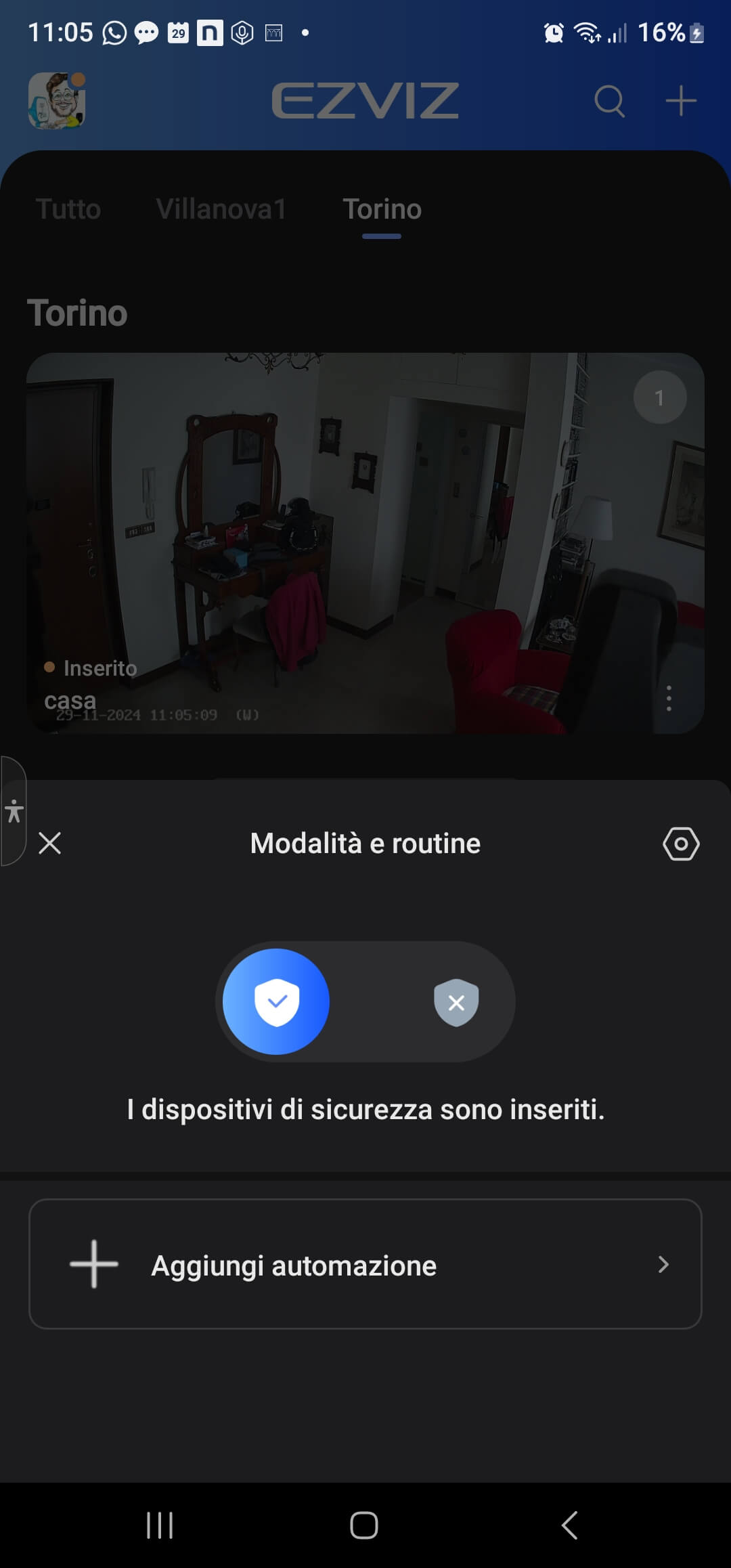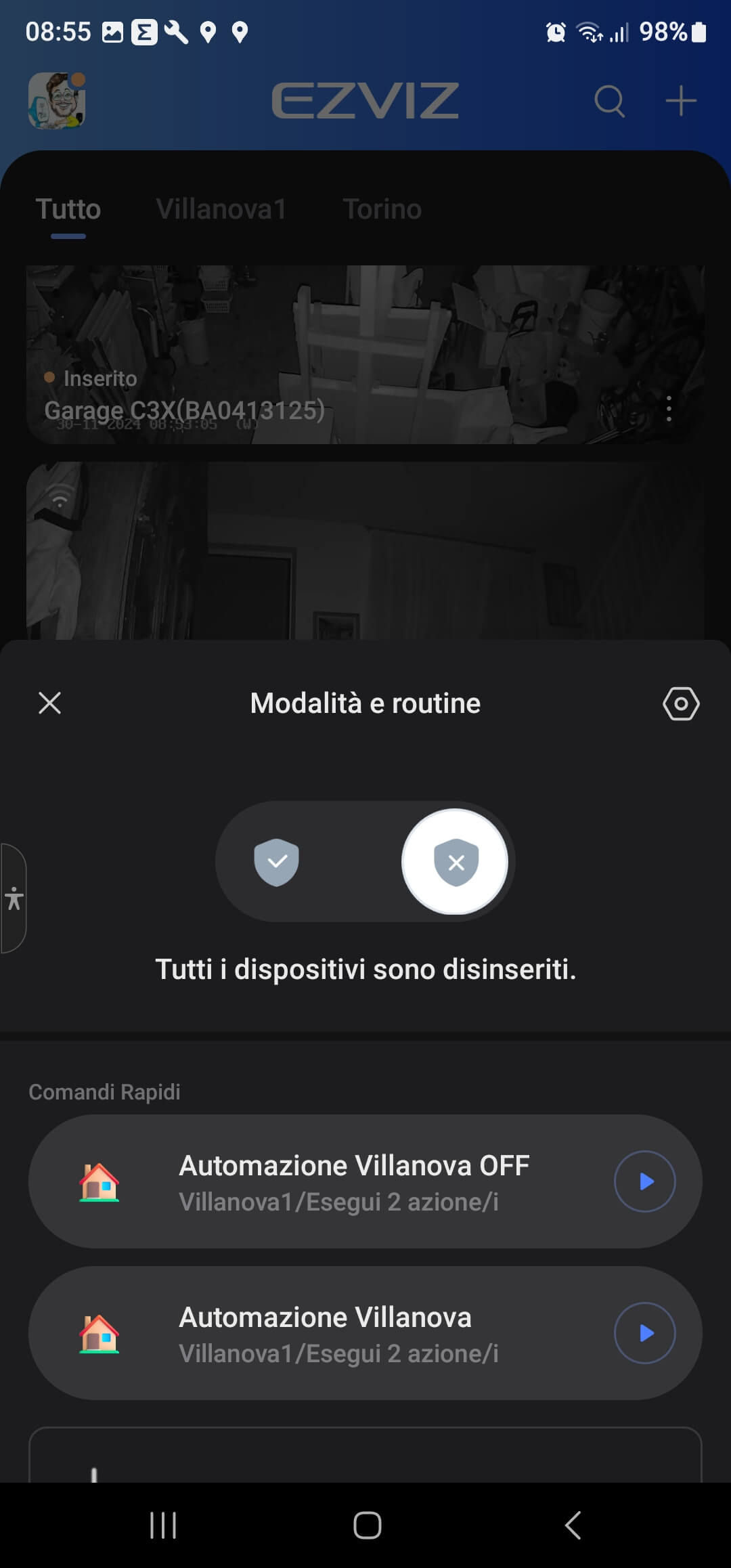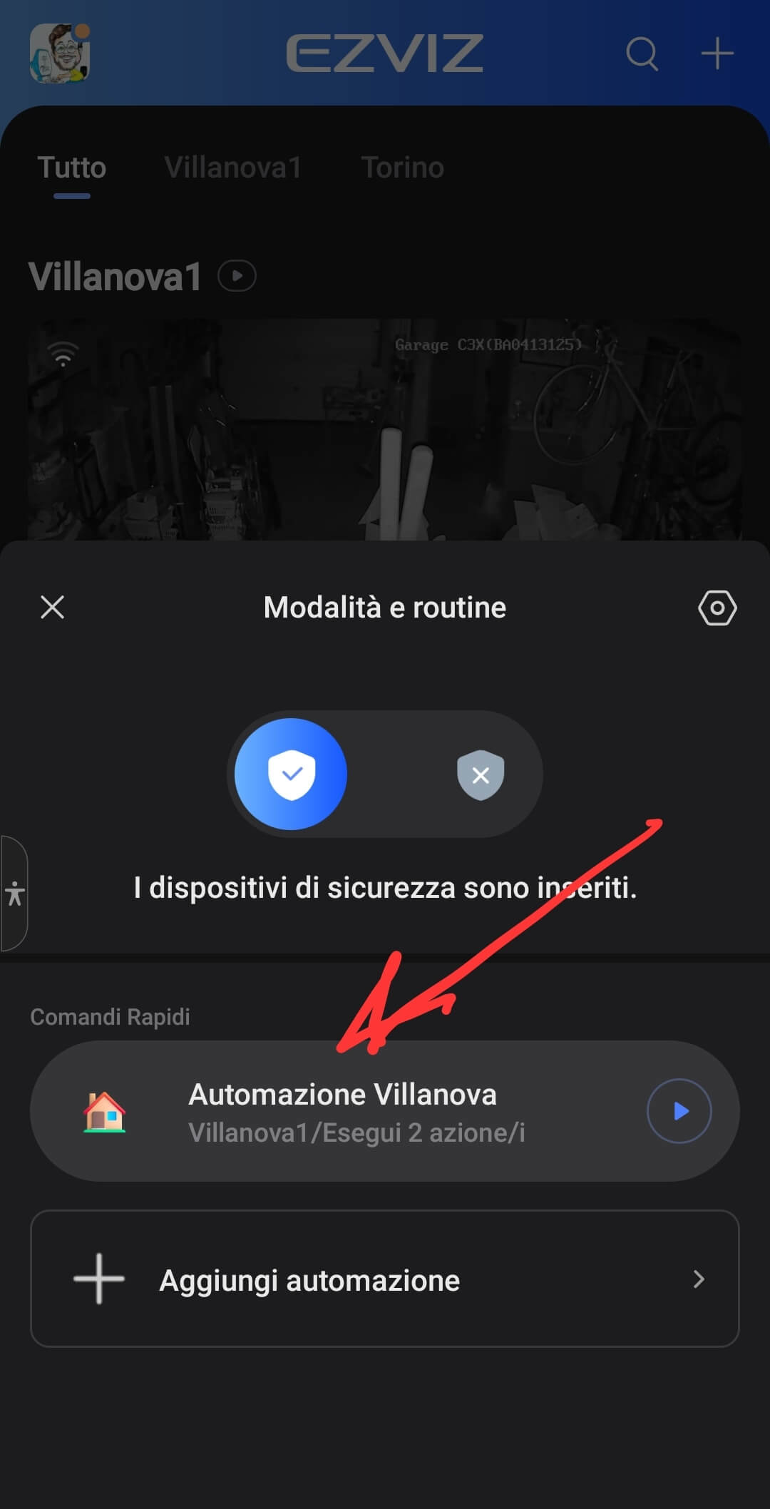 Spesso, però, può tornare utile poter agire complessivamente non su tutte le telecamera, ma solo su un sott’insieme di telecamere, procedura che attualmente non è implementata tramite l’icona di Modalità e routine sulla base del subset selezionato (Tutto, Villanova1 o Torino, nell’esempio): qualunque sia l’insieme di telecamere che uno ha visualizzato, l’azione di ON/OFF dell’allarme agisce su tutte quante! Spero che in prossinmi svipuppi modifichino questo comportamento assai comodo di quell’interruttore…