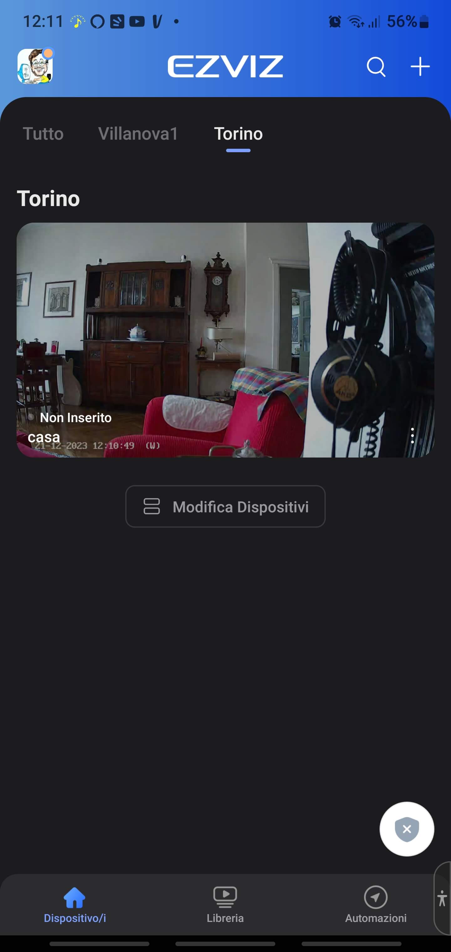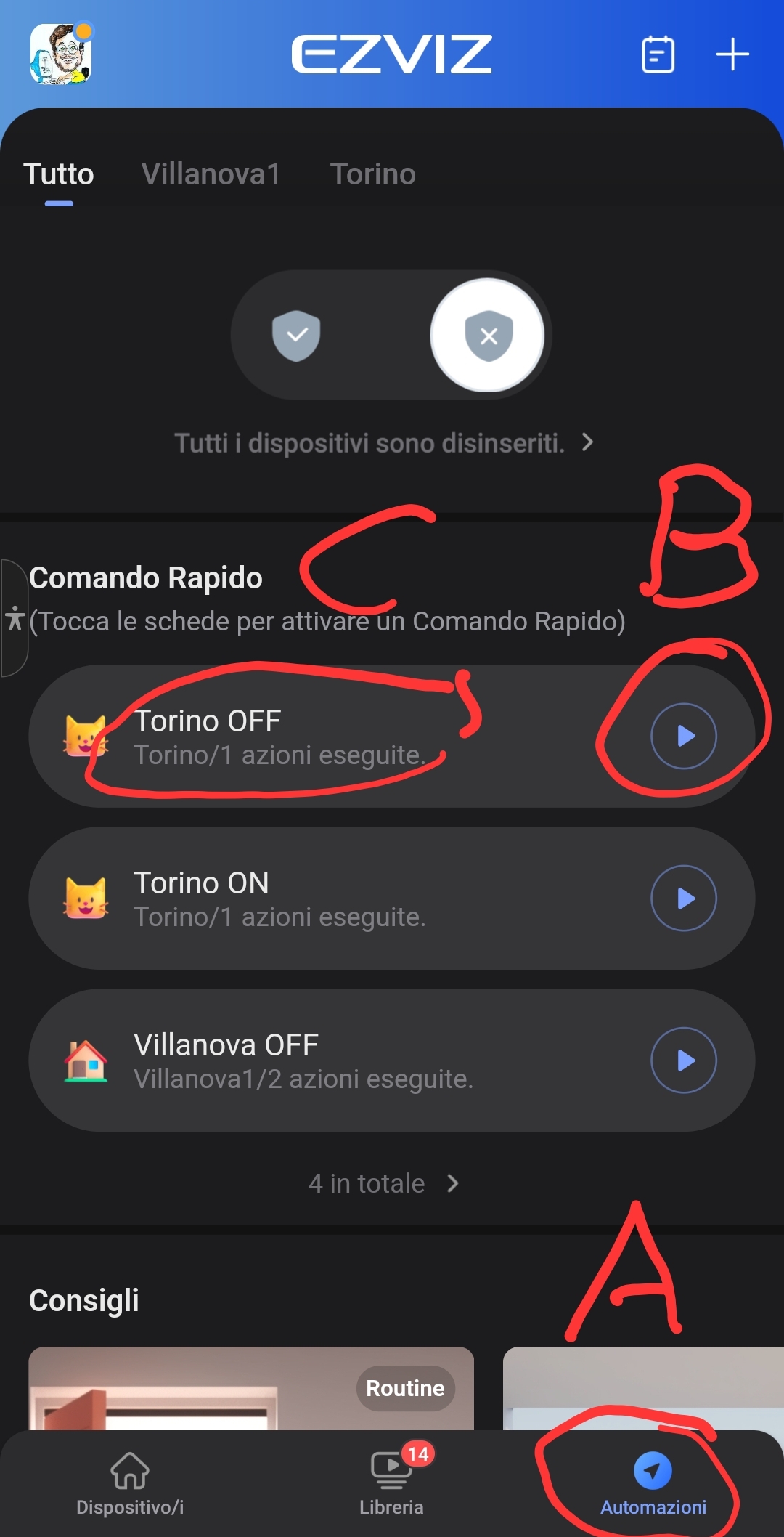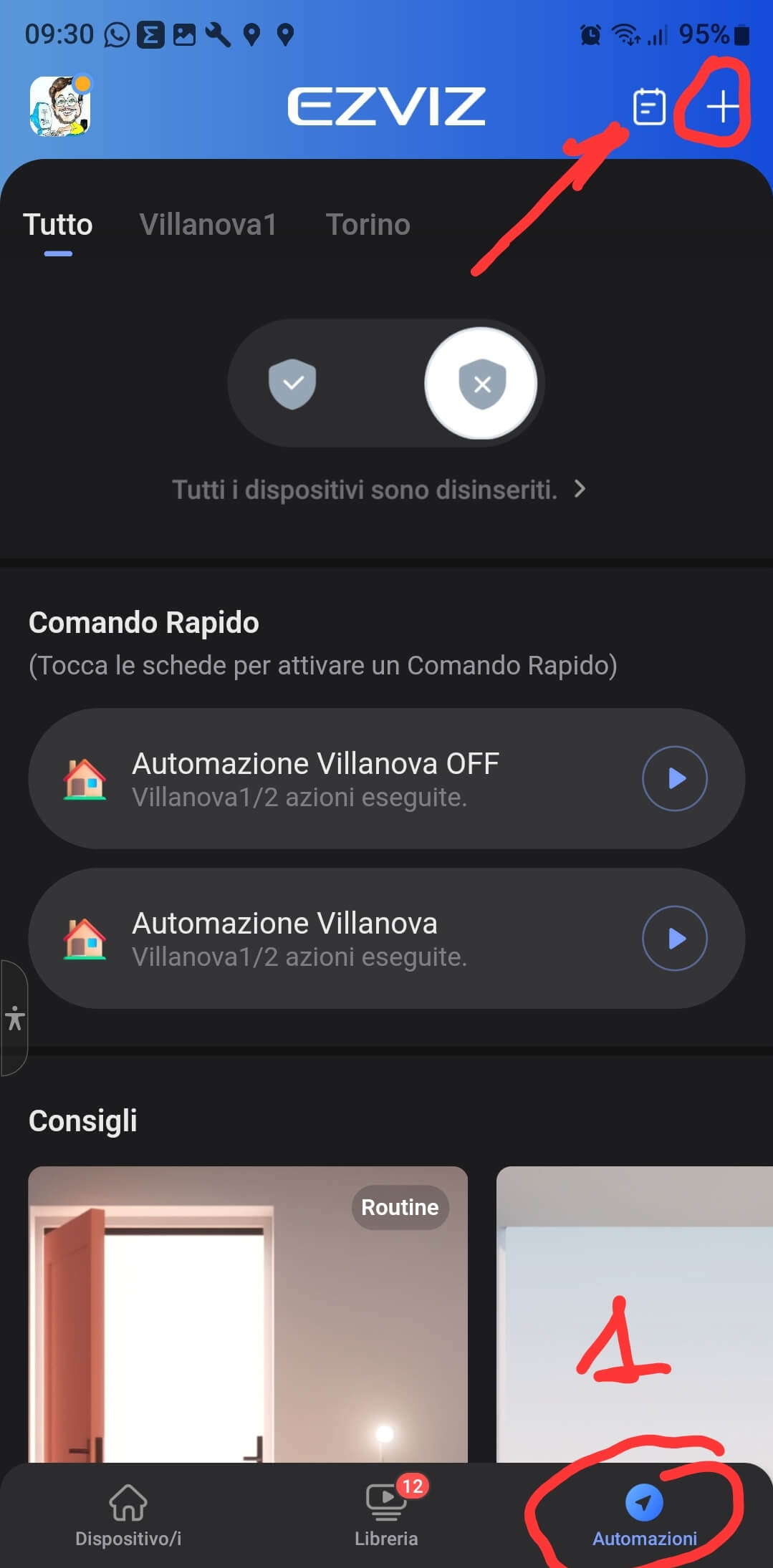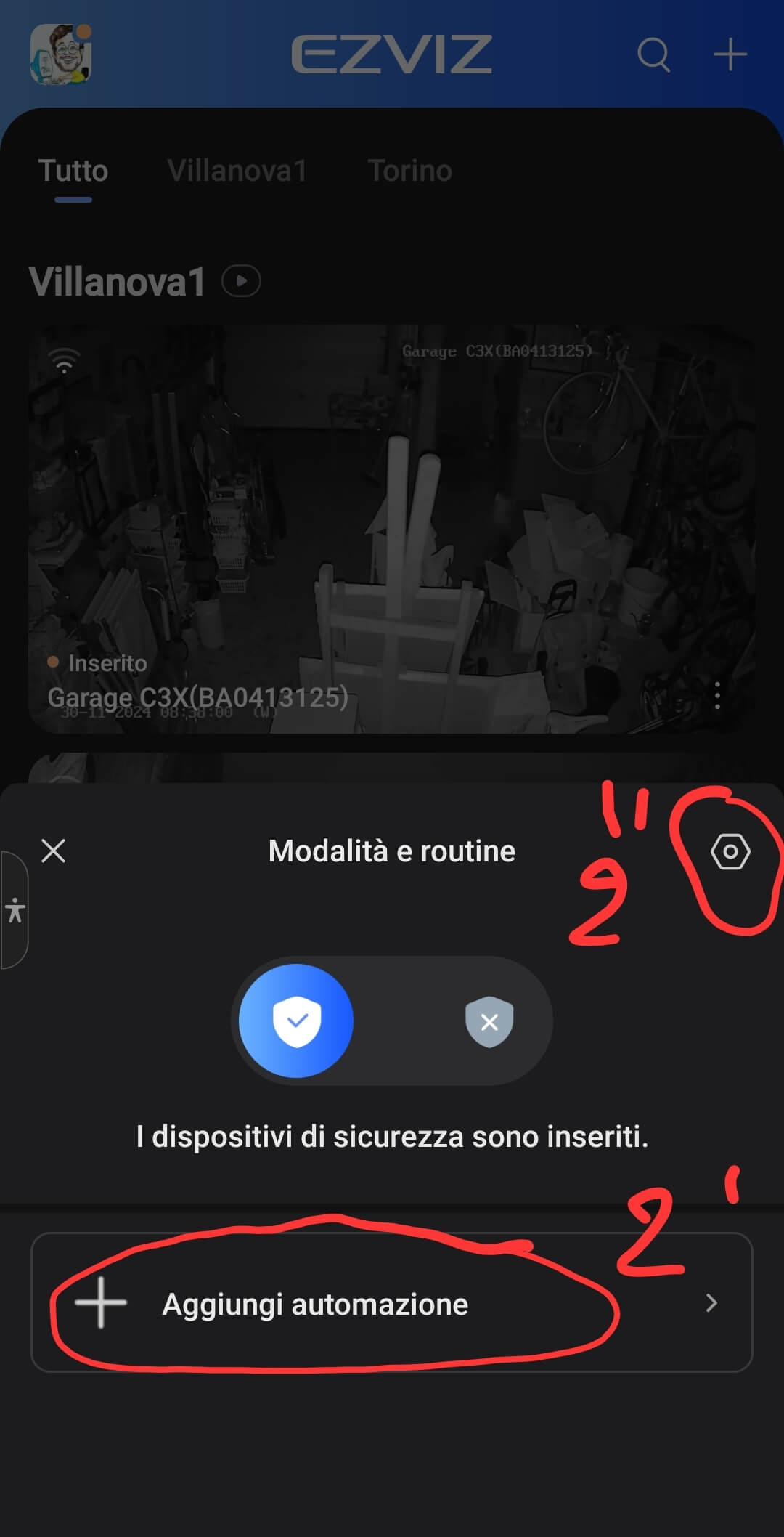 Spesso, però, può tornare utile poter agire complessivamente non su tutte le telecamera, ma solo su un sott’insieme di telecamere, procedura che attualmente non è implementata tramite l’icona di Modalità e routine sulla base del subset selezionato (Tutto, Villanova1 o Torino, nell’esempio): qualunque sia l’insieme di telecamere che uno ha visualizzato, l’azione di ON/OFF dell’allarme agisce su tutte quante! Spero che in prossinmi svipuppi modifichino questo comportamento assai comodo di quell’interruttore…