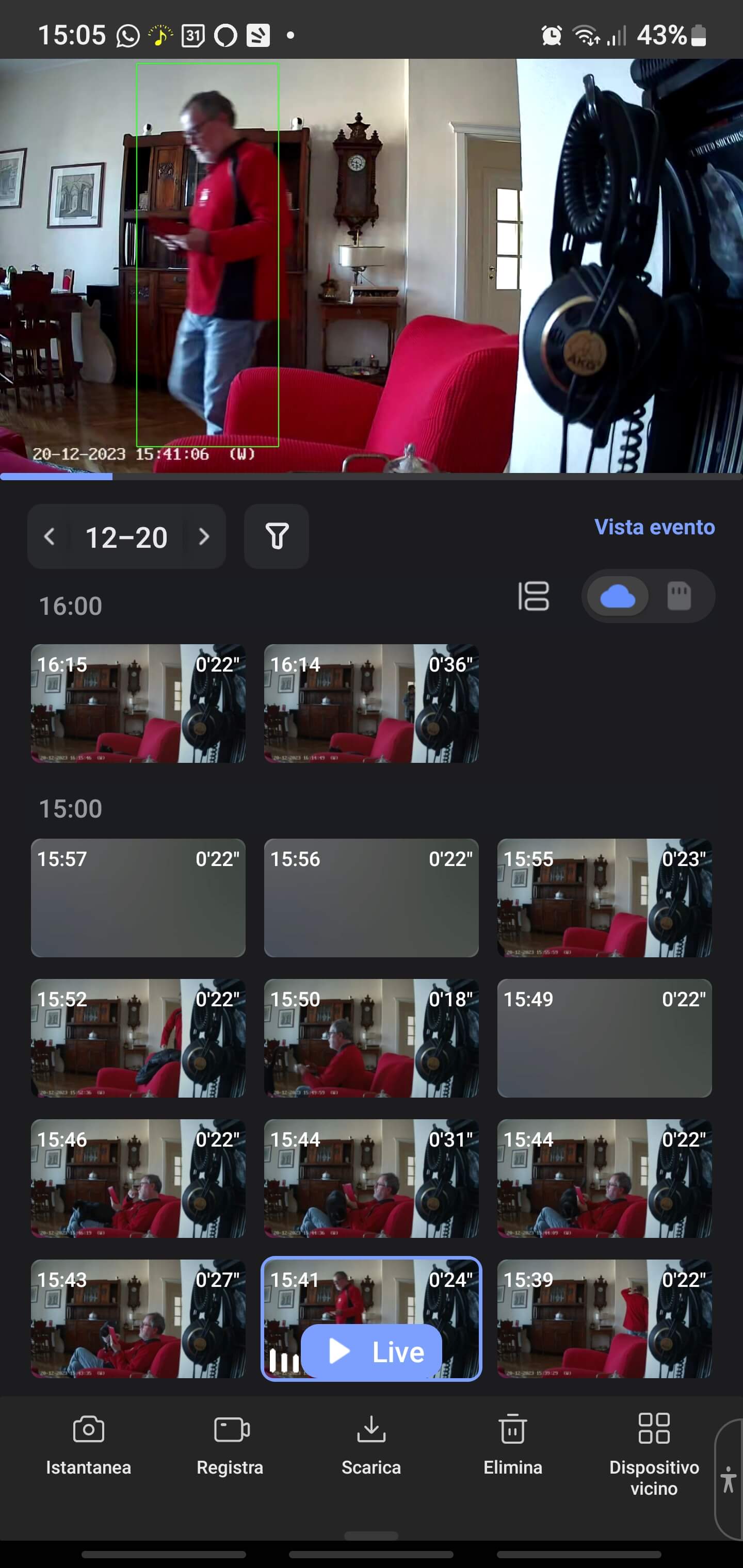 Infatti, esiste anche un’altra funzionalità molto interessante di memorizzazione dei video: oltre a poter salvare le registrazioni localmente sulla memoria SD, viene offerta gratuitamente – per tutta la vita della telecamera C3X – la possibilità di una registrazione nel cloud Ezviz dei video relativi alle registrazioni che la terecamenra ha effettuato nelle ultime 24 ore: questi video risultano quindi raggiungibili da remoto non solo accedendo alla memoria SD locale alla telecamera, ma anche accedendo al cloud Ezviz. Naturalmente è possibile avere una memorizzazione su cloud anche per una durata maggiore, ma in quel caso si deve pagare un abbonamento. Comunque avere la memorizzazione in remoto di tutte le registrazioni (e.g. attivate quando esiste una qualche modifica nell’immagine ripresa) è già molto, in quanto permette (anche qualora un ladro rubasse/manomettesse la telecamera) comunque di poter vedere le registrazioni effettuate che si possono recuperare entro le 24 ore successive l’evento: queste possono essere eventualmente salvate localmente sul proprio smartphone prima di risultare non più disponibili. Per vedere i video presenti sul cloud Ezviz è necessario innanzitutto avere posizionato la scelta sull’icona a forma di nuvoletta azzurra (e non sulla SD – icona a forma di scheda-, altrimenti si vedranno i file registrati in locale). Per salvare poi sul proprio smartphone alcuni video (sia che siano residenti sul cloud o sulla scheda SD), basta premere dal menù in basso il tasto Scarica (selezionando tutti quelli di interesse, per poi poterli poi recuperare dalla cartella Video del proprio cellulare utilizzando una qualsiasi app di gestione dei file (e.g. File Manager +). Infine, una volta memorizzati sul cellulare, si possono poi eventualmente inviare via email o condividere su un proprio cloud (e.g. OneDrive/GoogleDrive). Ssi noti che, se uno invece invia dei video tramite WhatsApp, verranno compressi e quindi perderanno in qualità: quindi, molto meglio mantenere i video originali, soprattutto se poi si desidera magari ingrandire una parte del video per poter riconoscere bene la faccia di una persona ripresa!