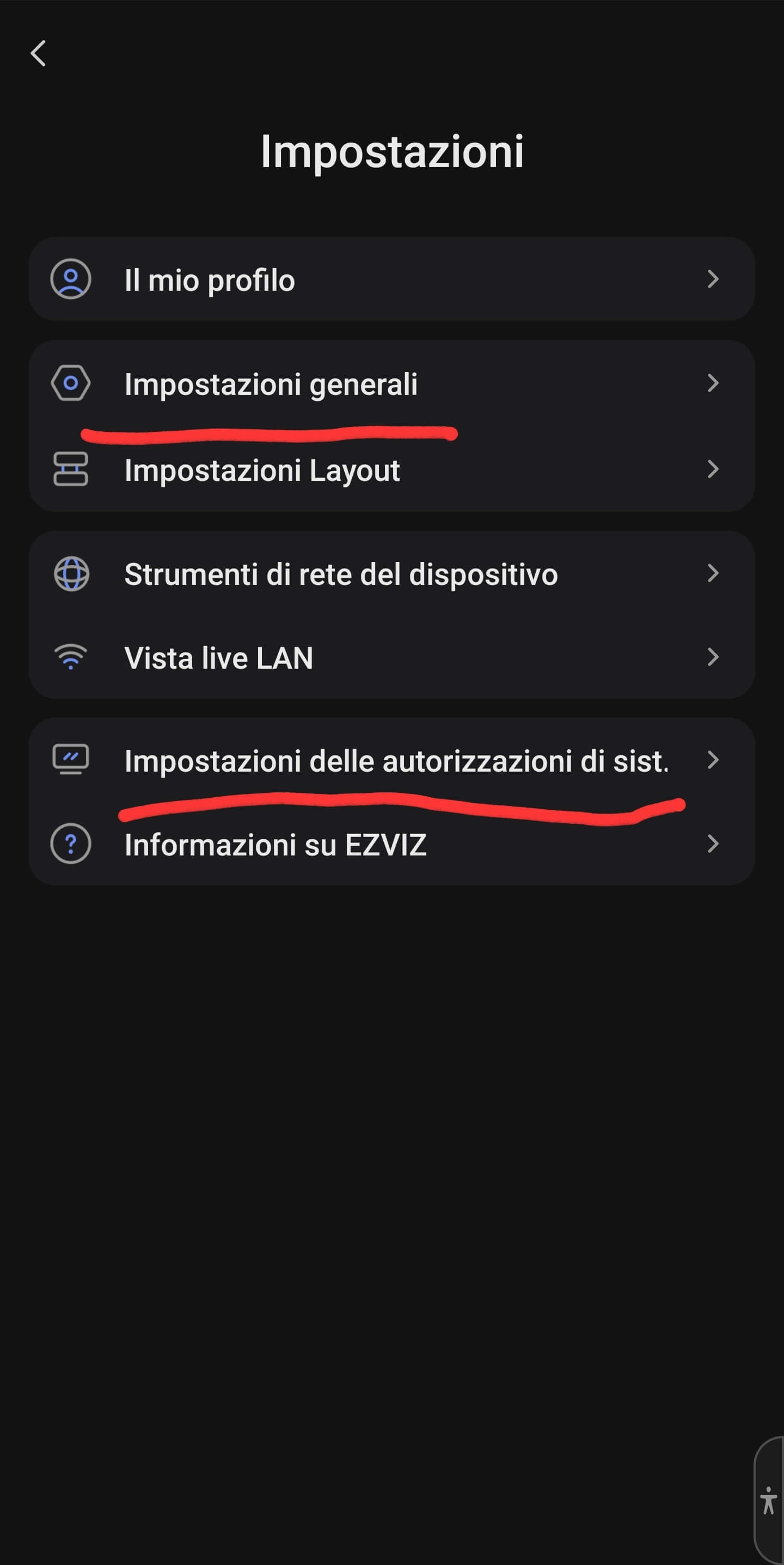 Per fare funzionare correttamente l’app Ezviz è necessario concederle diverse autorizzazioni a livello di sistema, vale a dire a livello di impostazioni dello smartphone (icona dell’utente in alto a sinistra -> Impostazioni -> Impostazioni delle autorizzazioni di sist.). Perciò, durante la configurazione iniziale o attivando una nuova funzionalità, viene esplicitamente richiesto di abilitare autorizzazioni specifiche per quell’app: