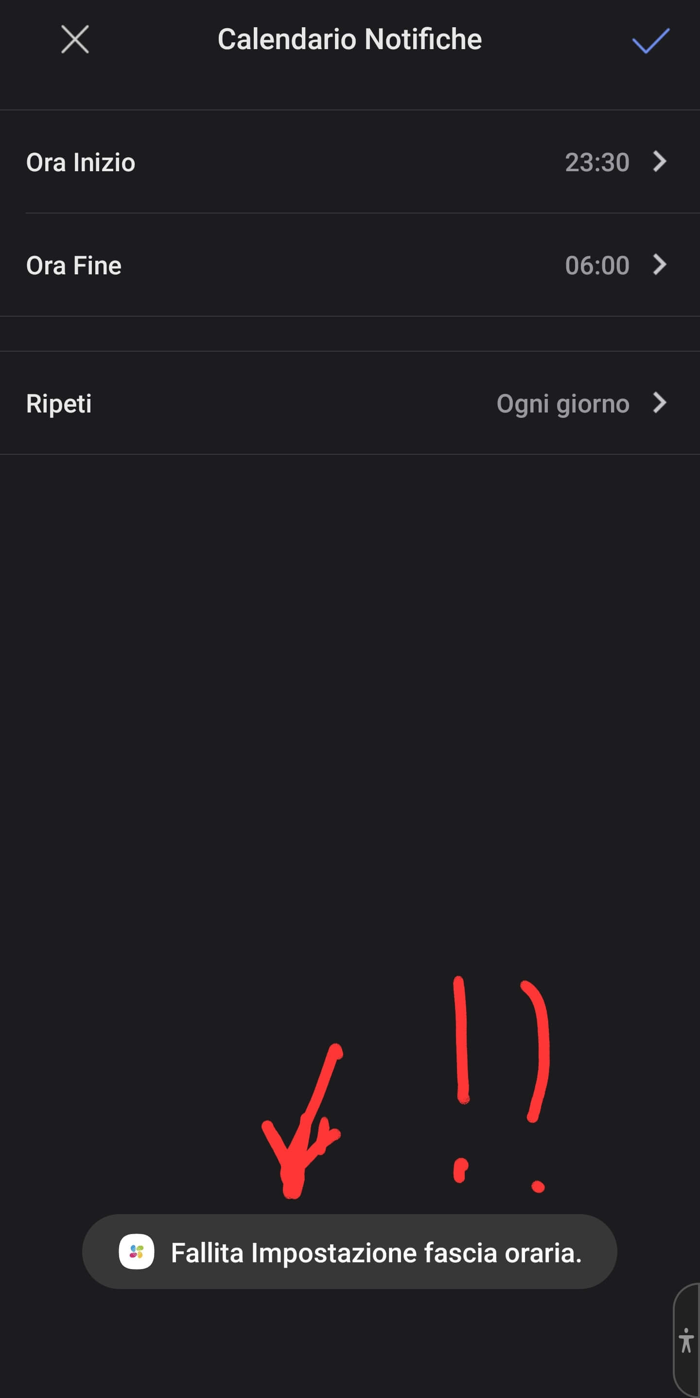 Si noti che, dovendo gestire intervalli che stiano ciascun in un giorno della settimana, non risulta possibile indicare un intervallo, ad esempio, dalle 23:00 alle 7:00 in quanto è su due giorni differenti: infatti, se uno cerca di inserire un intervallo di quel tipo, non viene consentito di confermare quelle impostazioni (cliccando il segno di spunta in alto a destra) e viene segnalato Fallita impostazione fascia oraria. Quel messaggio può giungere inaspettato all’utente e non essere compreso bene tutto subito 🙄: probabilmente sarebbe stato meglio un avvertimento che esplicitamente segnalasse che un intervallo temporale deve necessariamente essere impostato internamente ad un giorno specifico della settimana. Se si desiderasse attivare la segnalazione di allarme in quella fascia indicata come esempio, si dovrebbero quindi indicare due intervalli (uno dalle 23:00 alle 23:59 del giorno precedente, e.g. lunedì, e un altro dalle 00:00 alle 7:00 del giorno seguente, e.g. martedì) anche se in realtà rimane non contemplato il minuto prima di mezzanotte (nota: l’intervallo dalle 23:00 alle 00:00 non viene consentito in quanto la mezzanotte appartiene già al giorno successivo! 🙄).