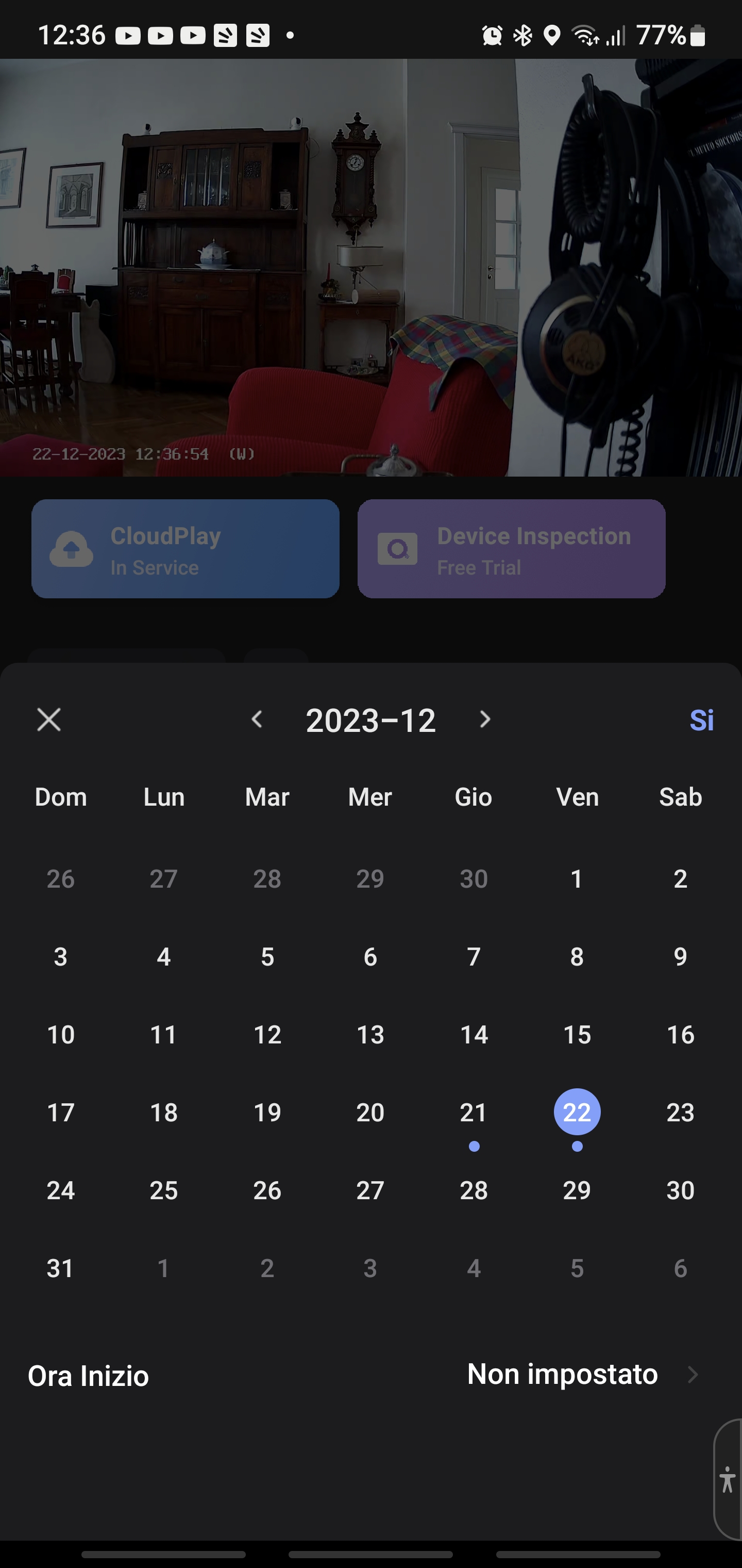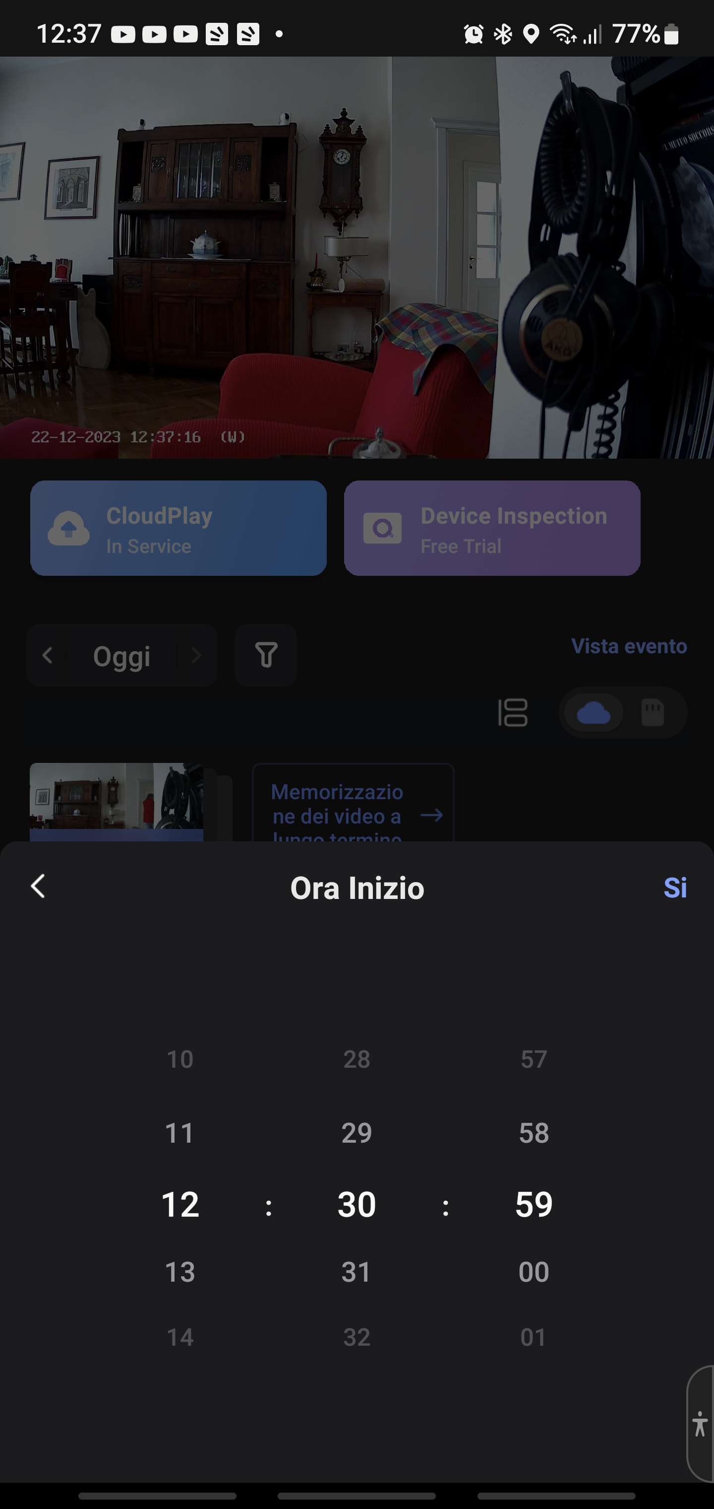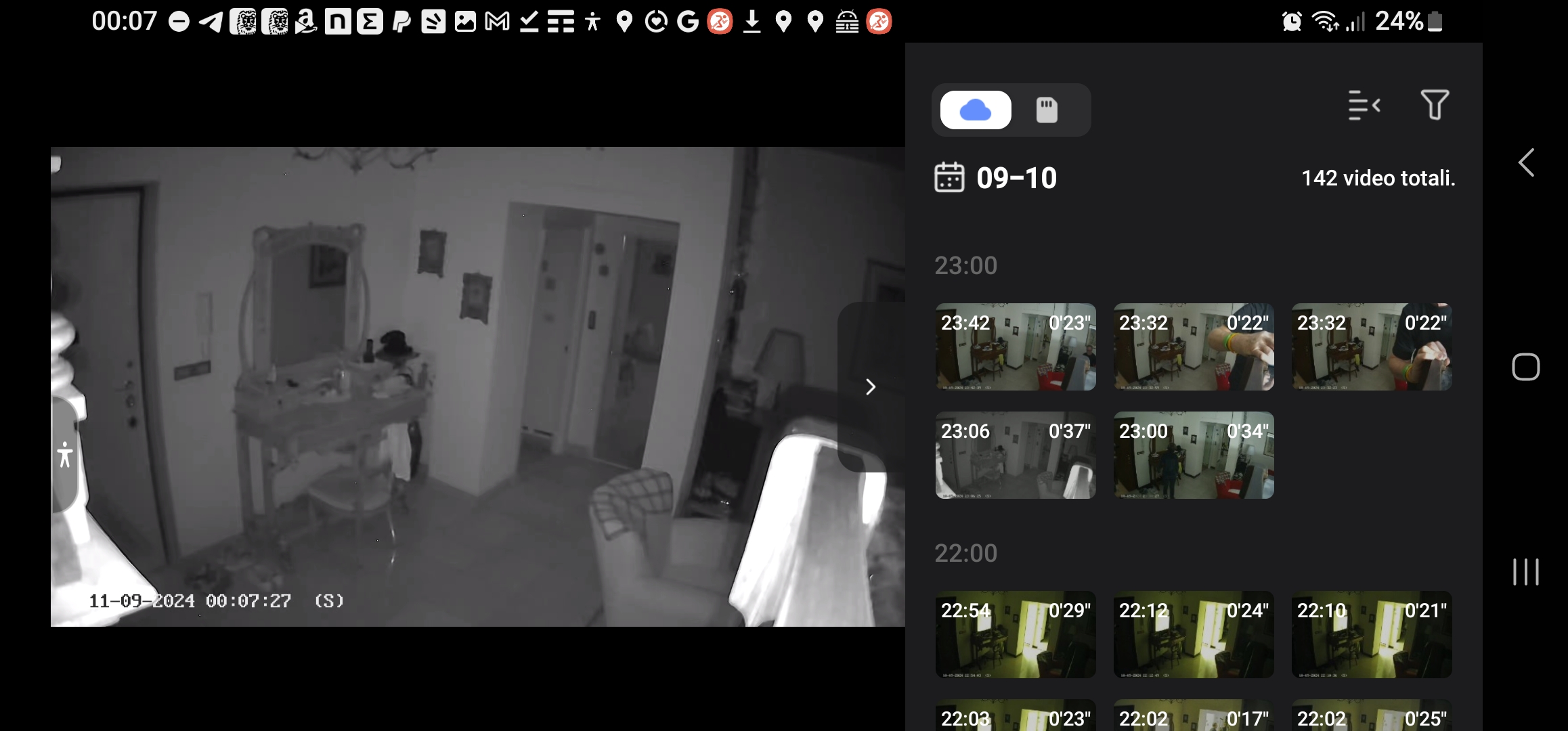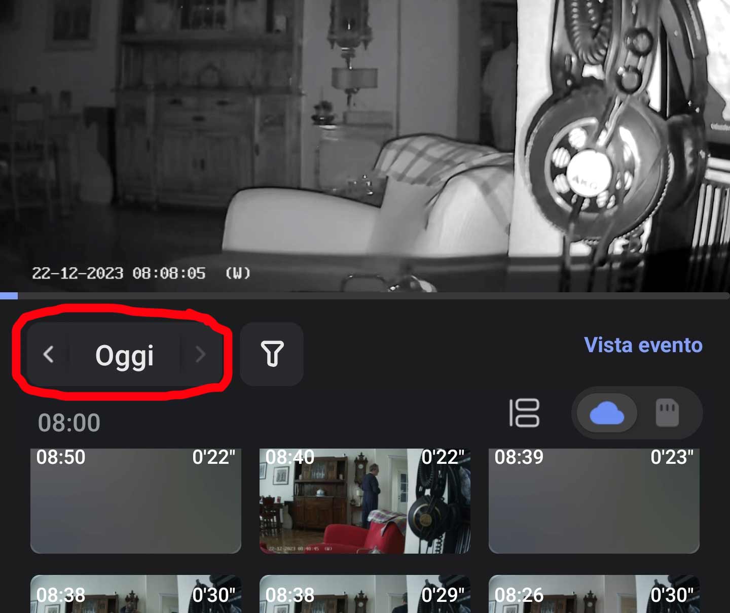 Invece, nella sezione Libreria (del menù in basso nell’homepage) ci sono solo video che si limitano a mostrare l’evento trigger che ha fatto scattare l’allarme (sono quindi di durata limitata, facendo vedere solo un po’ prima e un po’ dopo l’evento, in modo che uno possa individuarne la causa ed capire se poi conviene eventualmente approfondire o meno). Dal momento poi che generalmente uno ha impostato di non ripetere l’allarme se l’evento si ripete dopo poco tempo (e.g. come minimo si può impostare un tempo di 1 minuto, ma può essere esteso fino a 30 minuti andando nell’opzione Intervallo messaggi dispositivo presente in Impostazioni -> Notifica Allarme relativo al dispositivo stesso), qualora la causa dell’allarme sia reputata valida, per vedere meglio tutto il filmato ripreso è necessario andare nelle registrazioni specifiche di quella telecamera (e.g. dalla homepage toccare la sezione video relativo alla telecamera interessata) e visionare il video in cui è compreso l’intervallo temporale in cui è stato generato l’allarme.