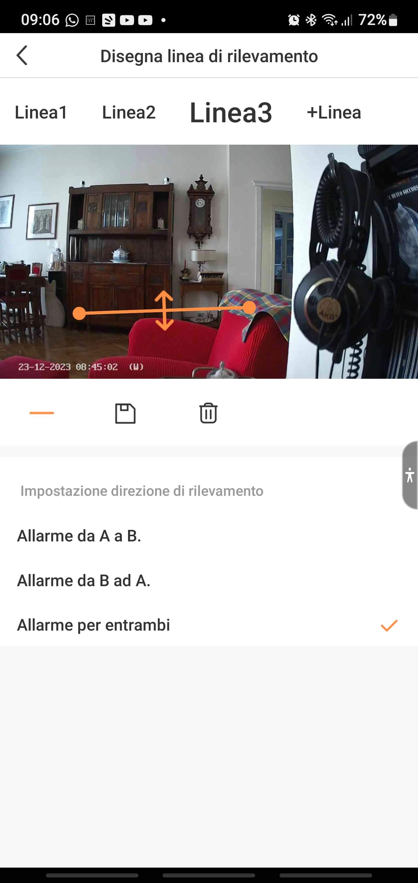 Nel caso del tracciamento di una o più linee di rilevamento, per definirne ciascuna si deve per procedere come segue: 1) Toccare la linea arancione (sotto l’immagine a sinistra) per fare comparire una linea nell’immagine ripresa; 2) Spostare e dimensionare opportunamente tale linea; 3) Scegliere la direzione per cui deve essere fatto il rilevamento [effettuando la scelta, sulla linea compare una freccia bidirezionale o monodirezionale che rende chiara la direzione scelta] ; 4) Salvare l’impostazione per quella linea premendo l’icona del dischetto.