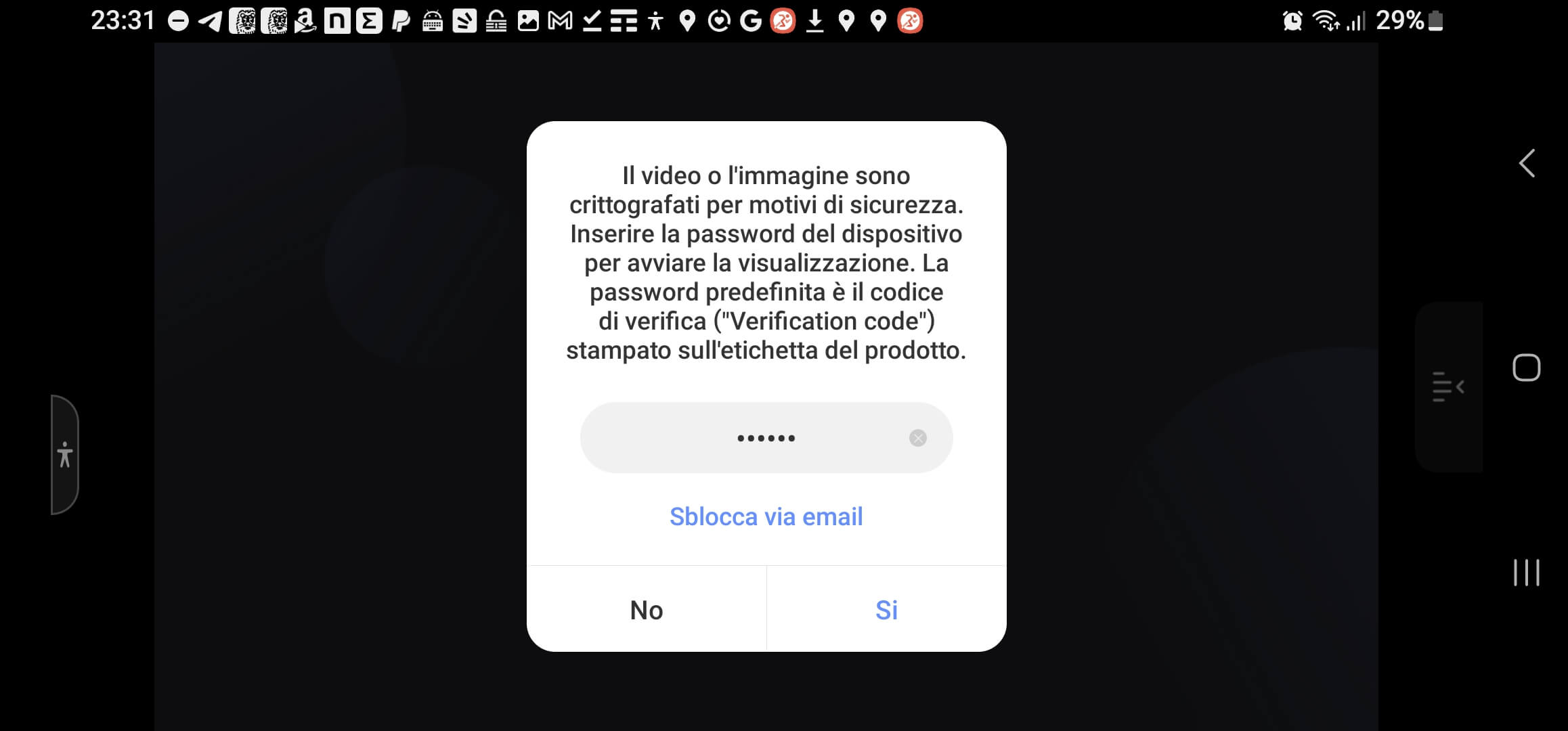 Si noti che risulta anche possibile, da uno smartphone in cui si è configurata la decriptazione correttamente (e.g. quello con cui si è inserita e conigurata la nuova telecamera leggendo il suo QR code), inserire una stringa apposita per effettuare la decriptazione dei suoi video regiatrati su cloud e su scheda SD locale: nella sezione Impostazioni della telecamera è infatti presente un a sezione apposita in cui uno può anche decidere di non criptare le immagini (sconsiglio soprattutto quando uno salva anche su cloud) e, qualora si decida di criptare (come è impostato già inizialmente), si può scegliere un codice che uno desidera (Cambia password) che si va a sostituire a quello di default presente sull’etichetta della telecamera. Quindi, volendo, una volta installate più telecamere, si può poi decidere cdi impostare per tutte il medesilo codice per decriptare i video registrati da tutte.