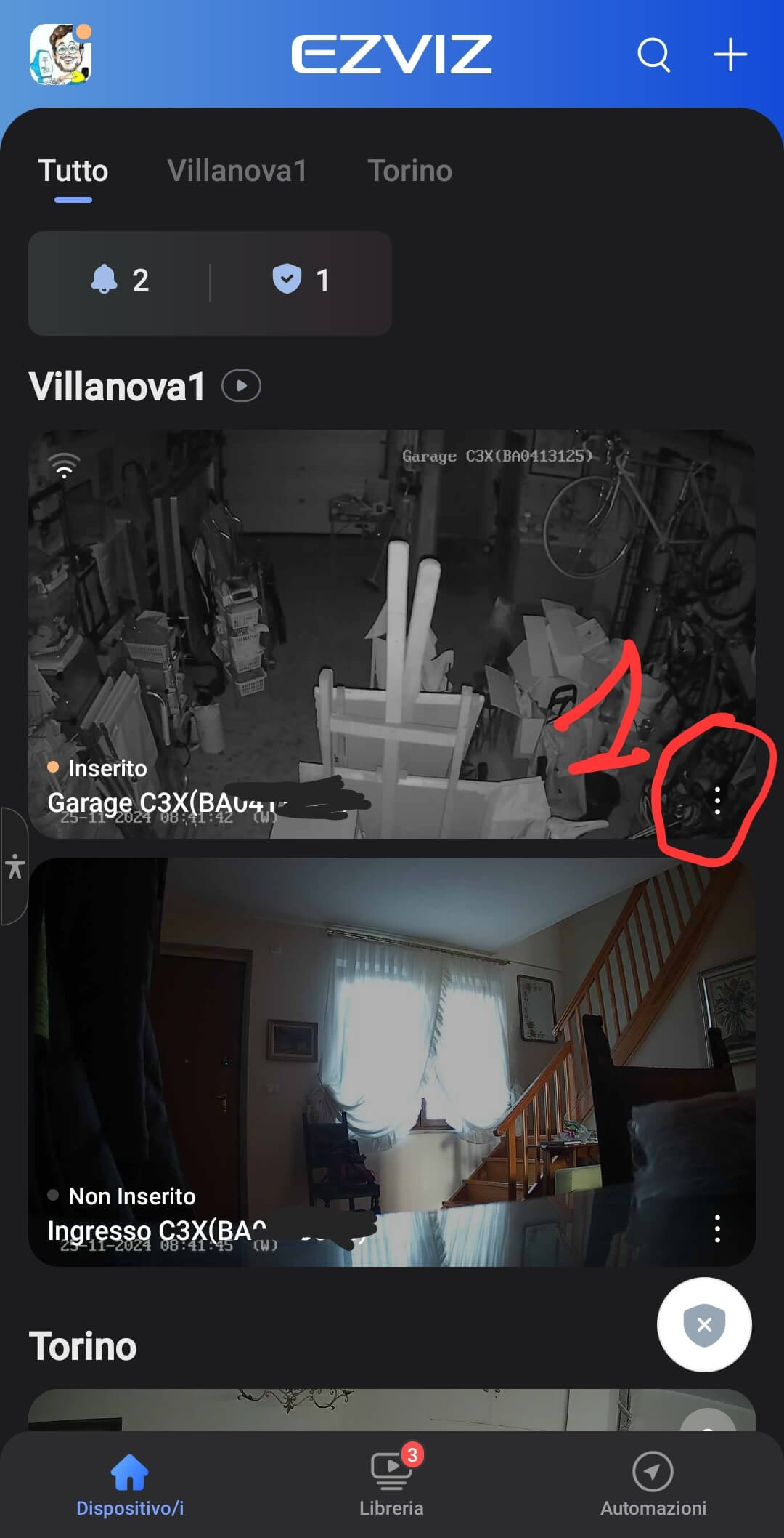 Perciò se si segue questa procedura, ma non si desiderebbe che si applicasse anche ad un sott’insieme di telecamere particolare, l’unica è poi andare a riportare per quelle lo stato opposto desiderato, modificandolo (come visto) dalle loro rispettive pagine di Impostazioni o (come vedremo ora) agendo sulla sezione raggiungibile cliccando sui 3 puntini presenti in basso a destra sulla visione della telecamera che si ha nella sezione Dispositivi del menù.
