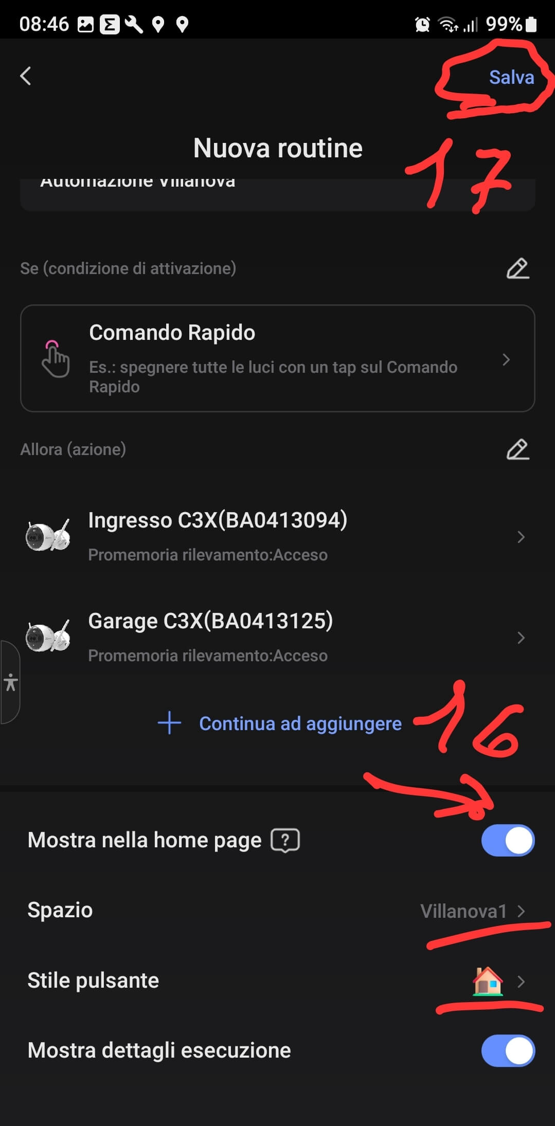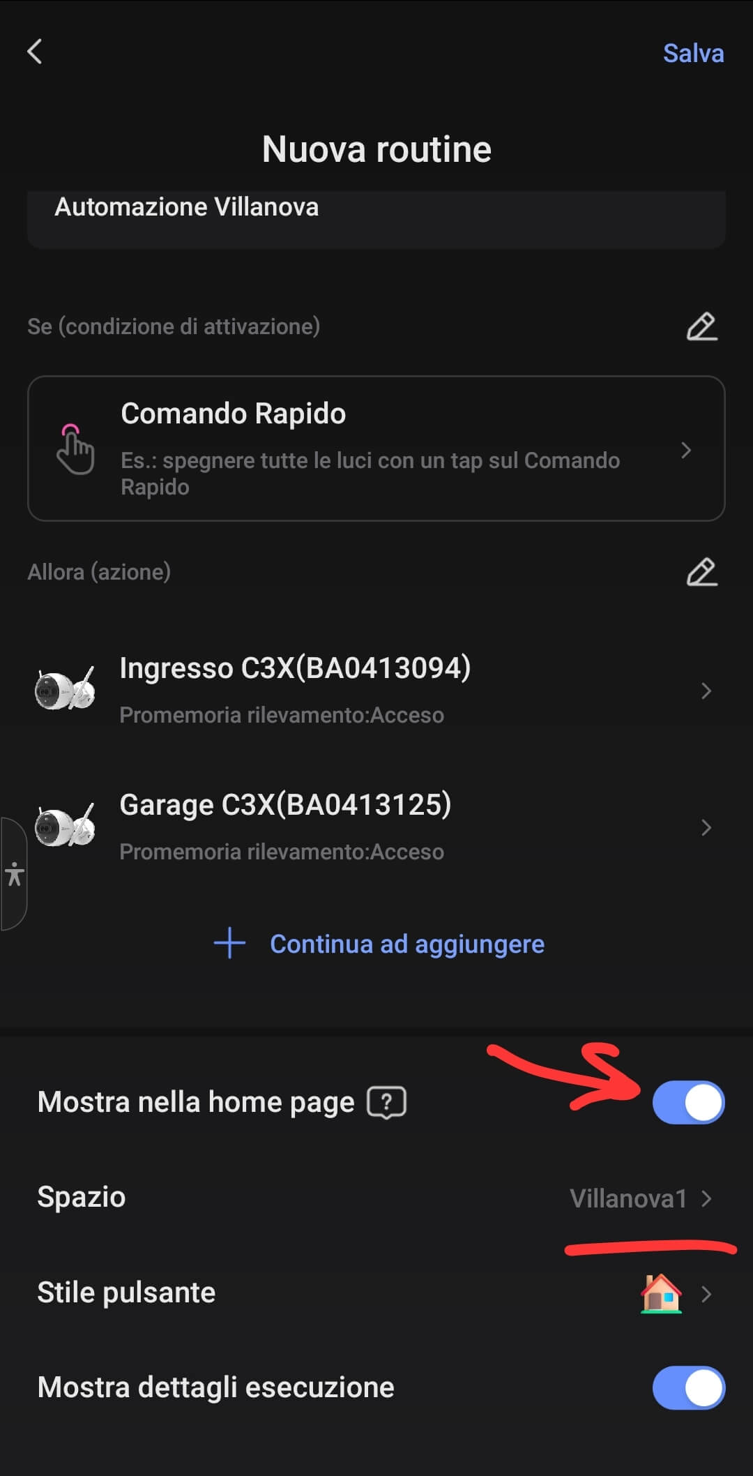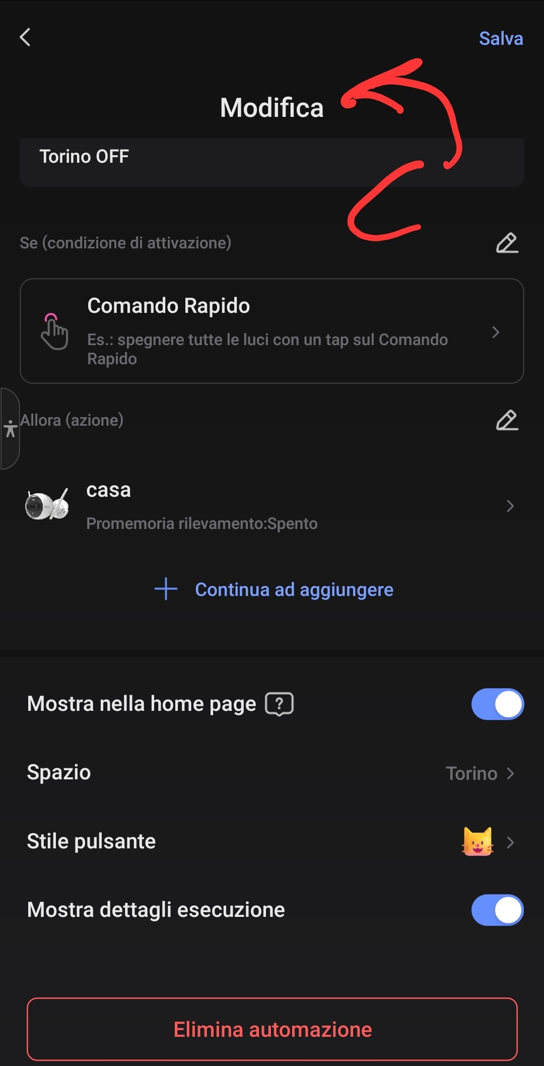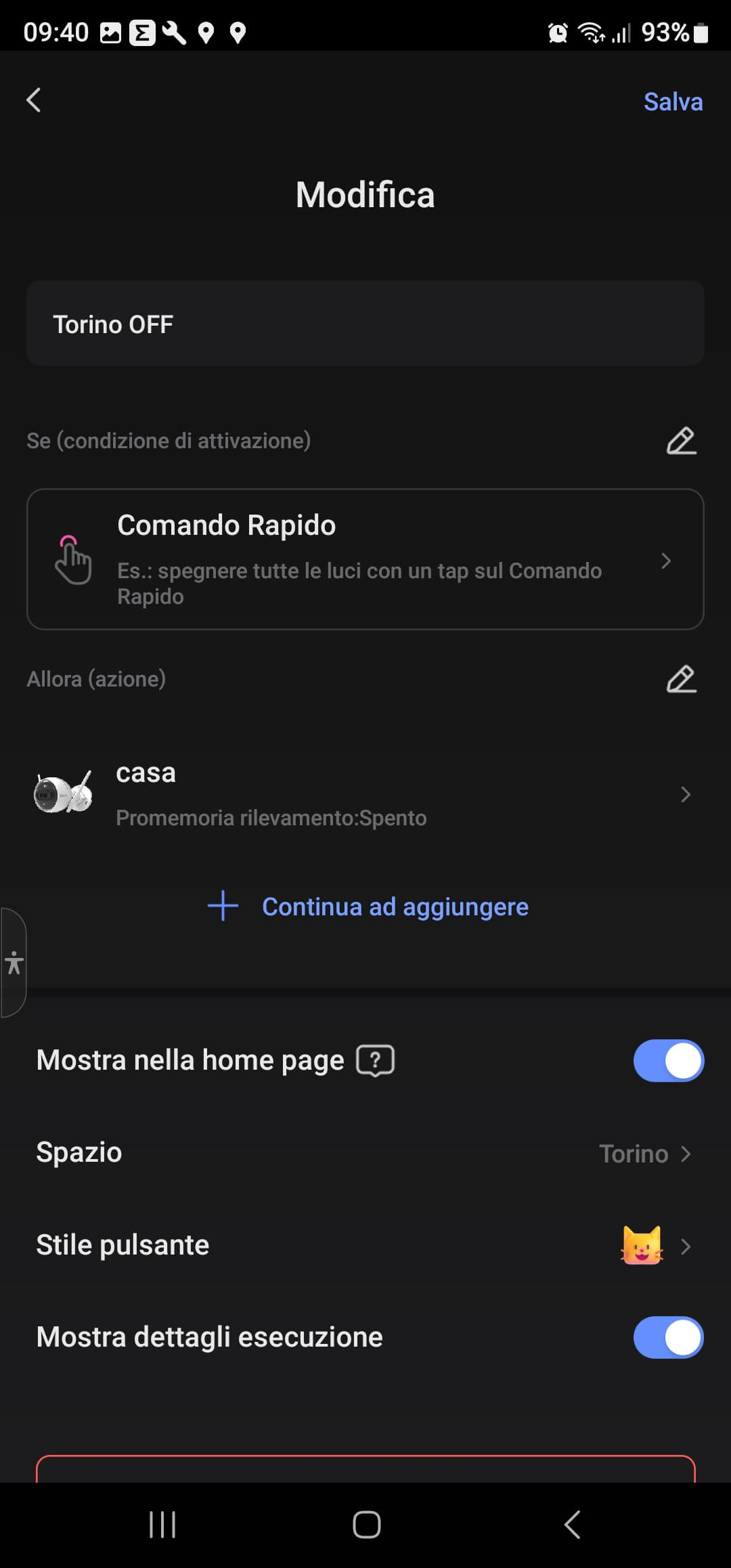 Tuttavia esiste già attualmente la possibilità di realizzare questa funzione tramite la definizione di una automazione/routine anche se se dovrà impostare una per l’attivazione dell’allarme e una per la disattivazione (non trattandosi in questo caso di uno switch ma di una automazione). Vediamo quindi come fare a impostare questa automazione, una delle molteplici possibili e che possono interessare anche altri diversi dispositivi di domotica. Per creare una nuova automazione si potrebbe partire anche direttamente dalla sezione Modalità e routine [che si raggiunge, come già visto, cliccando sull’icona a forma si scudo presente in basso a destra quando si è nella visualizzazione Dispositivo/i del menù]. Nota che, nel configurare quella automazione, utilizzando il link + Continua ad aggiungere, si possono indicare anche più telecamere sulle quali agirà. Infine, dopo avere impostato tutto, co,presa l’icona da associare a quella automazione specifica, ricordarsi sempre di premere il link Salva (in alto a dstra) in modo che venga appunto salvata!