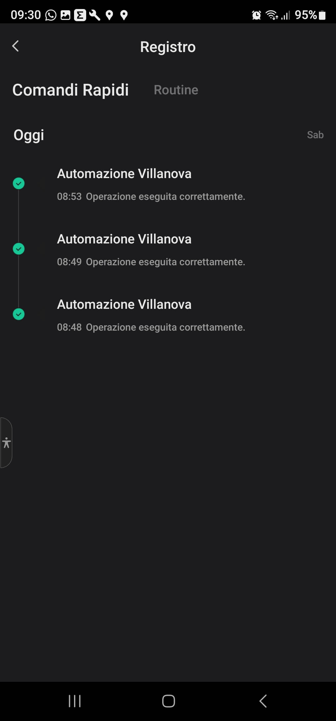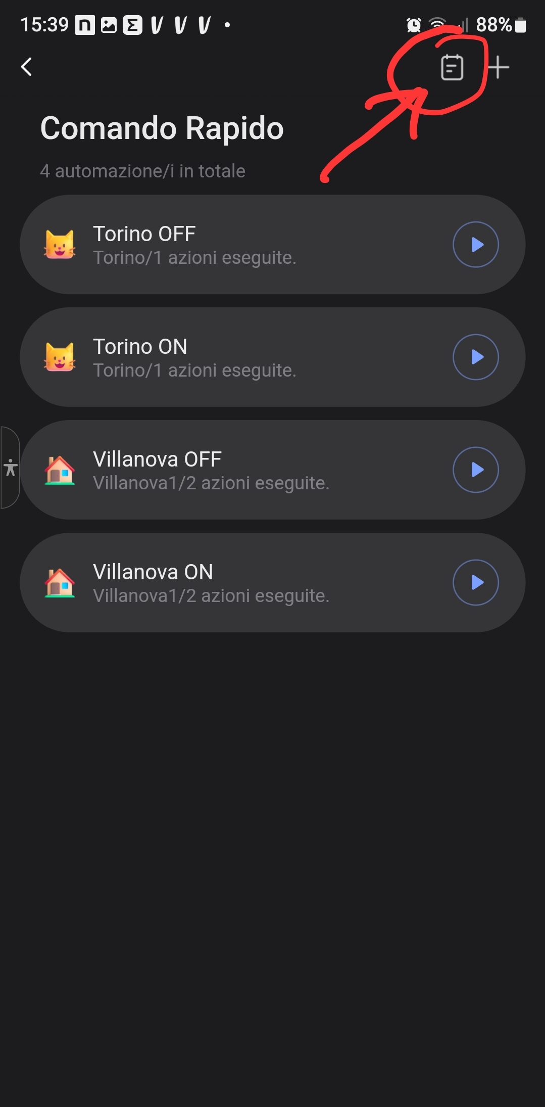 Infatti, esiste nel menù in basso una sezione Automazioni, a destra, che consente non solo di definire una nuova automazione, ma anche di effettuare una gestione completa di quelle già definite (e.g. cancellarne alcune o modificarne il nome), cosa non possibile agendo dalla pagina Modalità e routine. Partendo da qui posso quindi non solo aggiungere nuove automazioni (cliccando sul “+” in alto a destra e seguendo una procedura identica a quella già vista), ma anche sia lanciarle (in figura, azione B) sia modificarle/cancellarle (in figura, azione C). Si noti infine che nella visualizzazione di tutti i Comandi rapidi definiti, cliccando sull’icona elenco (in alto a destra), si accedere al Registro cioè alla lista di tutti i Comandi rapidi e Routine eseguiti.