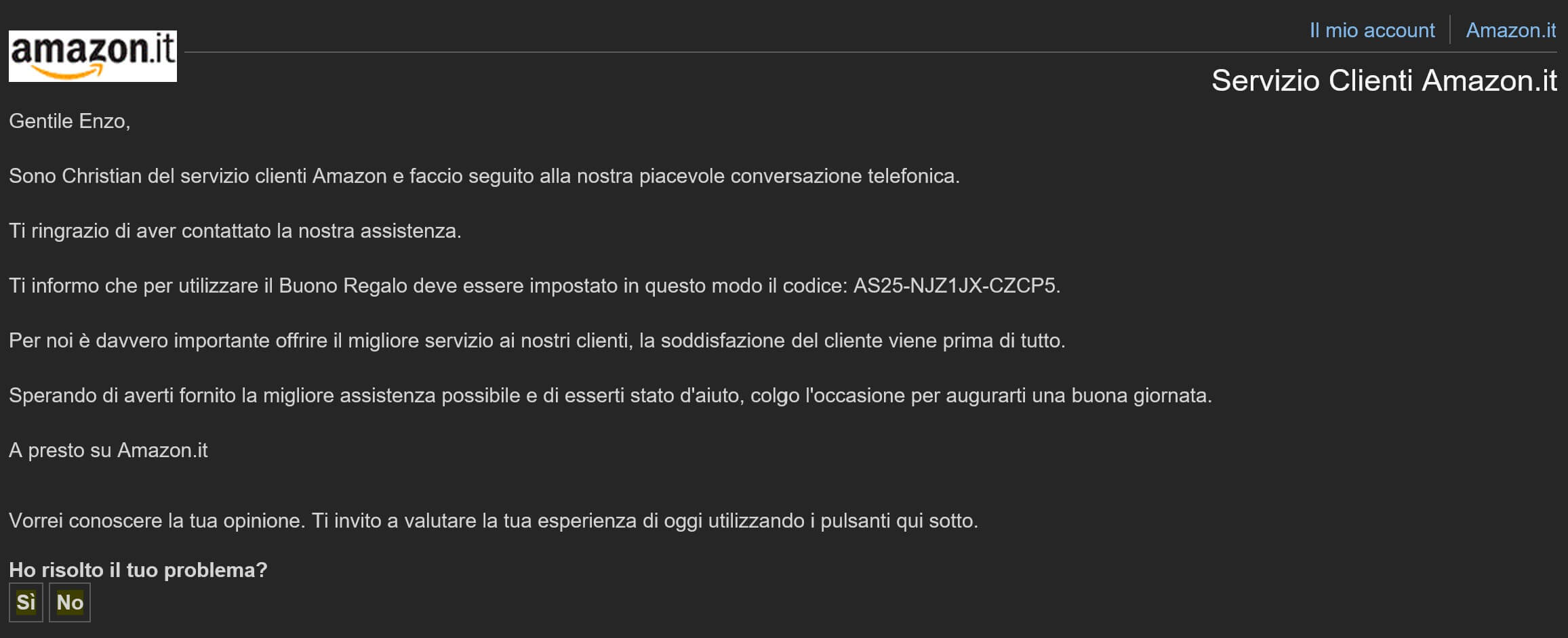 Ho contattato quindi il servizio clienti Amazon spiegando di avere ricevuto un Buono regalo acquistato in un supermercato, di quelli appesi che si trovano alle casse, e anche quell’assistenza, in genere molto efficiente non ha saputo aiutarmi più di tanto dicendomi che dovevo vedere o nel buono o negli scontrini un codice alfanumerico di 15 cifre… della tipologia che mi avrebbe inviato via email con un codice di esempio tipo quello che avrei dovuto trovare da qualche parte nel buono o negli scontrini. Mi ha suggerito infine di andare nel supermercato dove era stato venduto per verificare che fosse stato attivato/generato il codice di attivazione! 😦