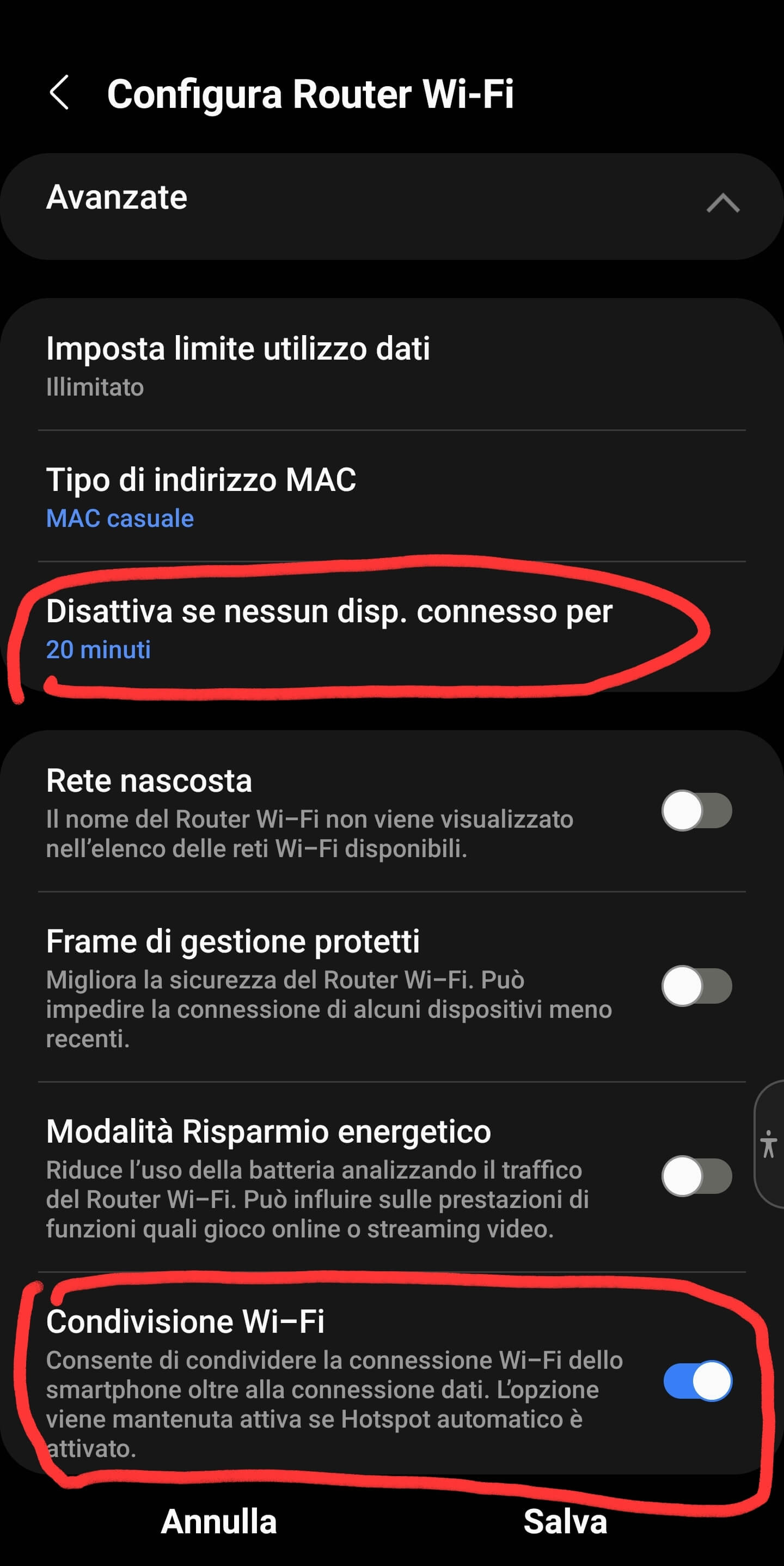 Toccando in modo continuativo quell’icona, si altre la pagina di configurazione seguente (se la si tocca si attiva semplicemente quel servizio e l’icona diventa azzurra, ma la prima volta che la si usa è necessario impostare alcune cose per cui è necessario toccarla in modo continuativo): selezionando Configura si accede poi a una ulteriore pagina che consente sia di personalizzare il nome da assegnare alla rete Wi-Fi generata dal cellulare, sia di definire una password (conviene sempre impostarne uno!) in modo tale che possa essere utilizzata solo da chi uno vuole. È possibile impostare anche la frequenza della rete generata, 2,4GHz o 5GHz: in genere conviene utilizzare 5GHz in quanto il collegamento Wi-Fi risulta più veloce (anche se si estende per una regione più ridotta, ma tanto il cellulare sarà probabilmente collocato vicino al dispositivo che utilizzerà il suo Wi-Fi), ma talvolta certi dispositivi (e.g. telecamere) utilizzano solo Wi-Fi a 2,4GHz. Andando poi nella sezione Avanzate, si possono impostare ulteriori parametri quale la disattivazione del Wi-Fi qualora nessun dispositivo risulti più connesso a esso per un certo periodo di tempo (e.g. 20 minuti): infatti quando uno smartphone offre questo servizio consuma molta batteria e conviene perciò collegarlo alla rete elettrica in ricarica se il Wi-Fi non lo si usa per un periodo breve. Può anche convenire impostare a ON l’opzione Condivisione Wi-Fi che consente di condividere la connessione Wi-Fi dello smartphone oltre alla connessione dati. Ovviamente dopo avere impostato tutte le opzioni è necessario premere Salva per memorizzarle e renderle permanenti. Infine il Wi-Fi si attiva impostando a ON l’opzione Attiva.