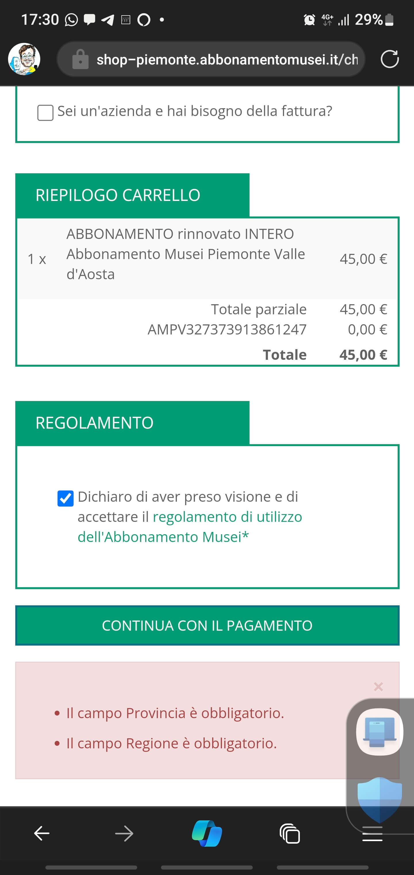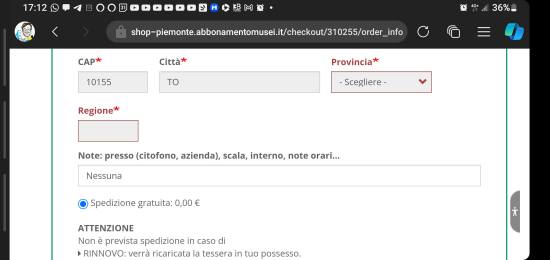 Dal momento che la sezione relativa alla spedizione era tra l’altro inutile in quel caso di rinnovo (non essendo prevista la spedizione di alcunché!) e non riuscendo comunque a valorizzare quei due campi (seppur fossero segnalati con un asterisco a indicarne l’obbligatorietà) ho deciso comunque di provare a procedere con l’inoltro del modulo di acquisto, essendo tra l’altro abilitato il pulsante apposito preposto a tale scopo. Tuttavia, premendolo si veniva bloccati con una segnalazione in rosso di errore per via dei campi Provincia e Regione (considerati come obbligatori) da valorizzare per poter completare quella procedura di acquisto!