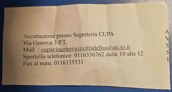 Al termine della visita, verso le 9:30, la situazione dei punti gialli non era cambiata: andando allo sportello almeno per incominciare a prenotare la prossima visita di controllo, l’impiegata mi dice che per quella tipologia di servizio è necessario attendere fino alle 10… prima solo accettazione!! Tuttavia mi consegnava un pezzo di foglio (tagliato a mano!) con le indicazioni su come poter effettuare la prenotazione anche da remoto, telefonicamente o via email: