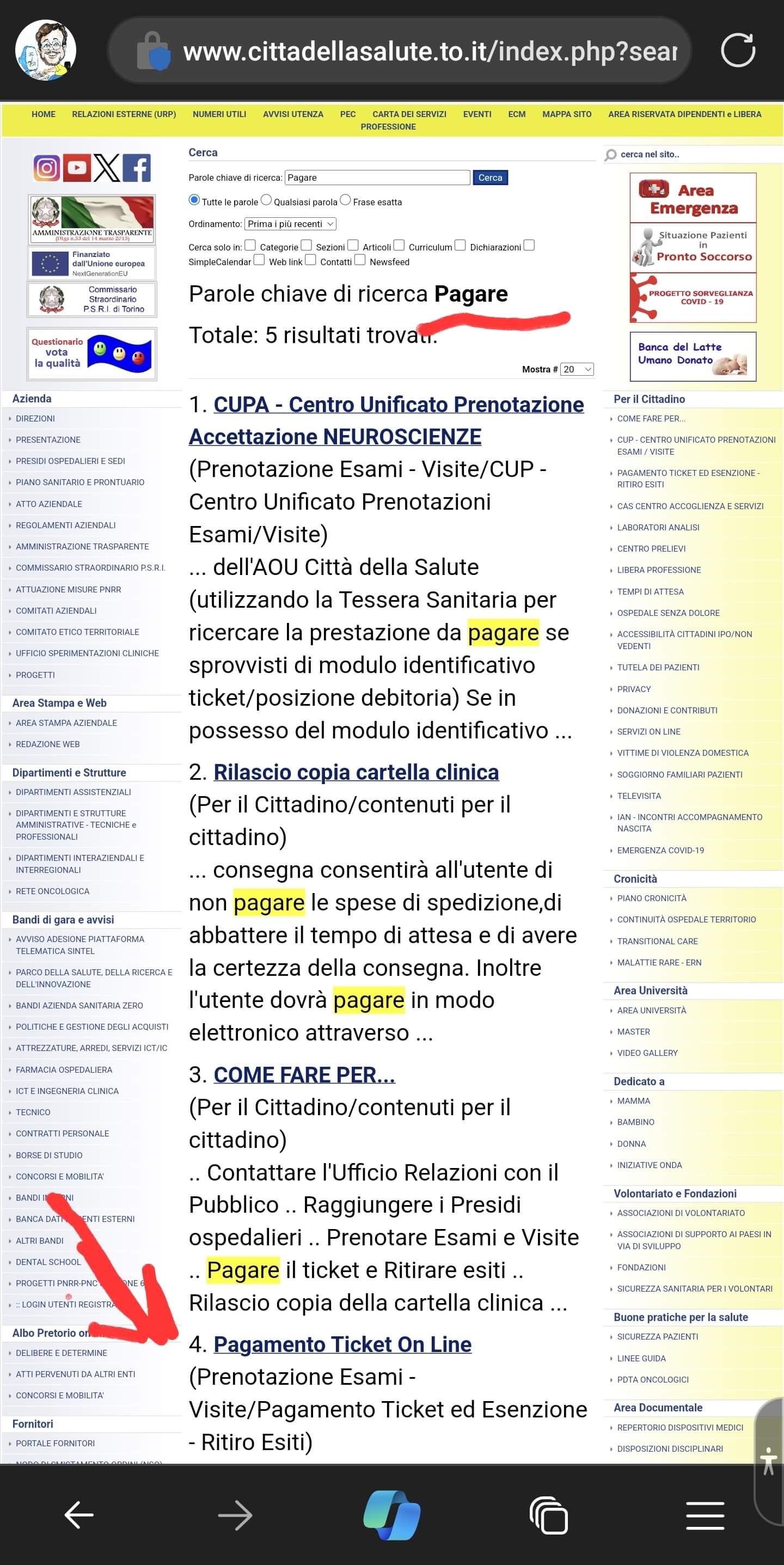 Anche se quella forma di pagamento non mi era stata indicata dall’impiegata dell’accettazione (che anzi mi aveva detto di portarle la ricevuta cartacea del pagamento effettuato!) provo comunque ad andare in quel sito: la sezione per effettuare il pagamento ticket non la trovo agevolmente dalla sua homepage per cui effettuo una ricerca di “pagamento” da cui trovo allora una pagina che riporta come fare Pagamenti Ticket On Line (ho visto poi che si può arrivare anche dal menù a destra Per il cittadino -> Come fare per… -> Pagare il ticket e ritirare gli esiti -> Pagamento ticket online).