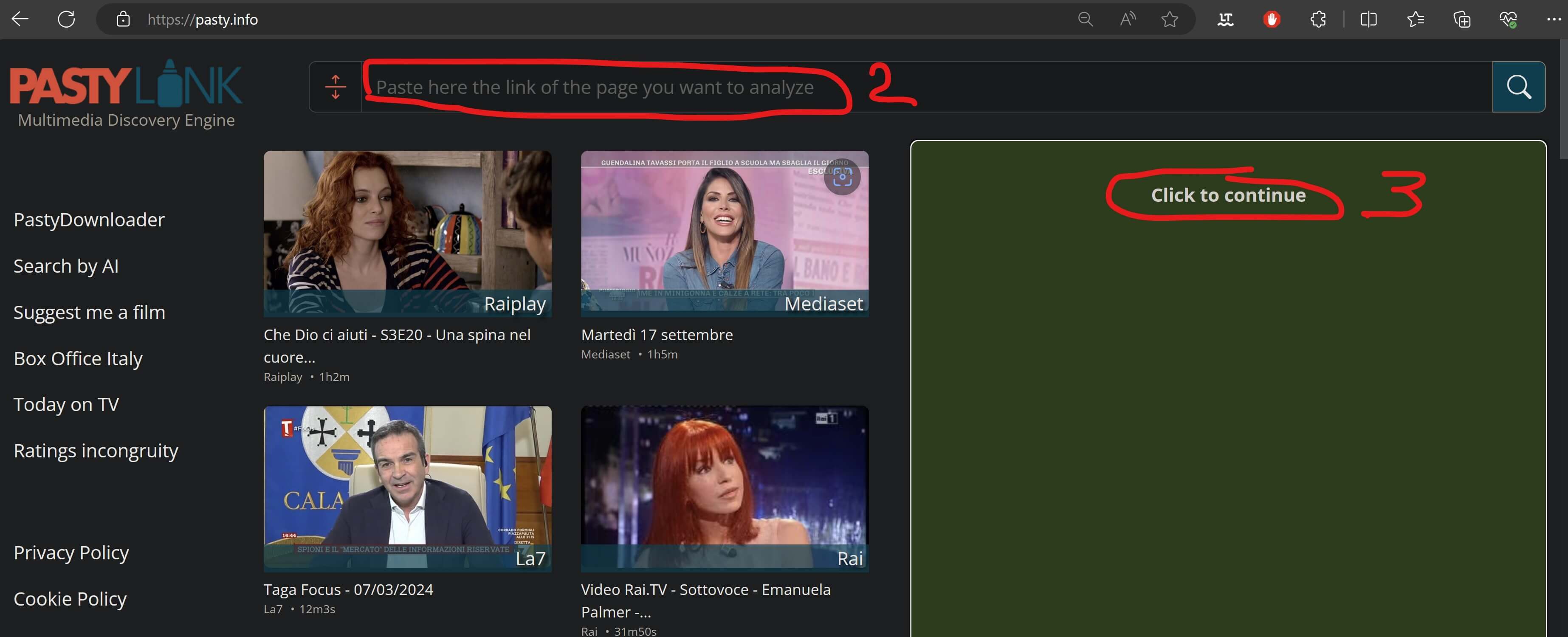 - Inserirla nel campo apposito del sito https://pasty.info/ e premere sul link Click to continue che comparirà nella finestra verde a destra. Il sito esaminerà la pagina che uno ha indicato estraendo il link dei video presenti (e.g. https://creativemedia9-rai-it.akamaized.net/podcastcdn/raiuno/aTuttoCuore/22387726_1800.mp4; https://creativemedia9-rai-it.akamaized.net/podcastcdn/raiuno/aTuttoCuore/22387726_2400.mp4): si noti che entrambi i video contengono TUTTO il concerto (3h5m), ma hanno una dimensione e definizione differente (il primo 2651Mb, 1024×576 e il secondo 3536Mb, 1280×720. Conviene quindi scaricarsi il secondo, cioè quello a definizione maggiore!! Avendo quei link si può anche utilizzare il programma ByClick di cui ho parlato positivamente in Come scaricare gratuitamente da YouTube, sul proprio PC, tutti i video/audio presenti in una playlist (o anche solo un audio/video) seppur in questo caso non riesca a estrapolare il link del video fornendogli l’URL della pagina di RaiPlay…