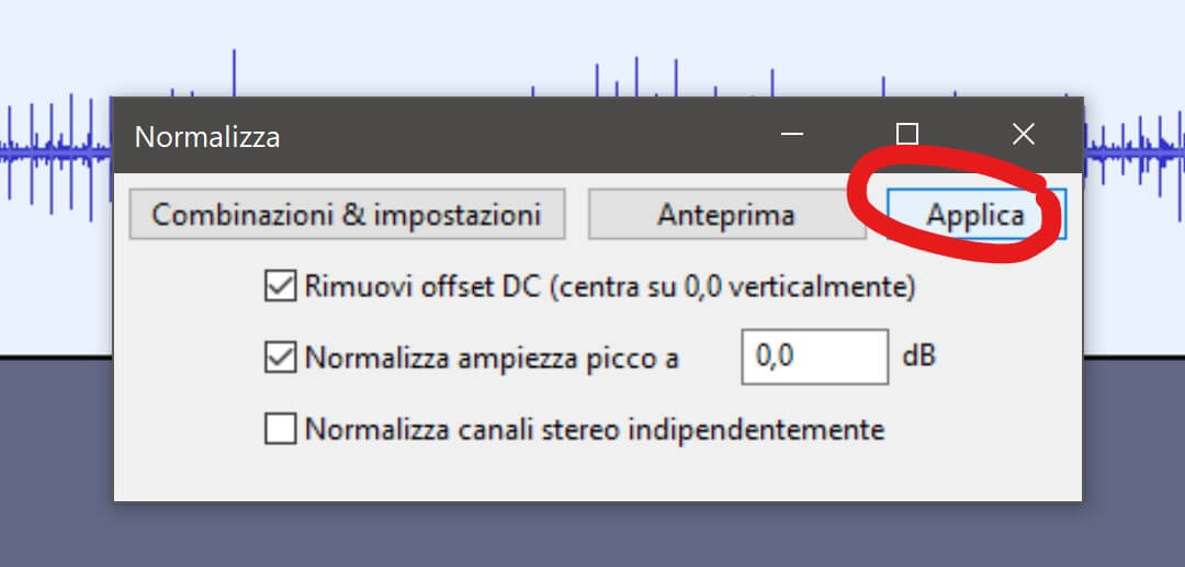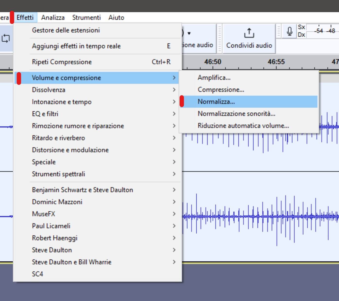 3) Si seleziona nuovamente tutta la traccia e si normalizza Effetti -> EQ e filtri -> Normalizza e premere il tasto OK lasciando i valori predefiniti.