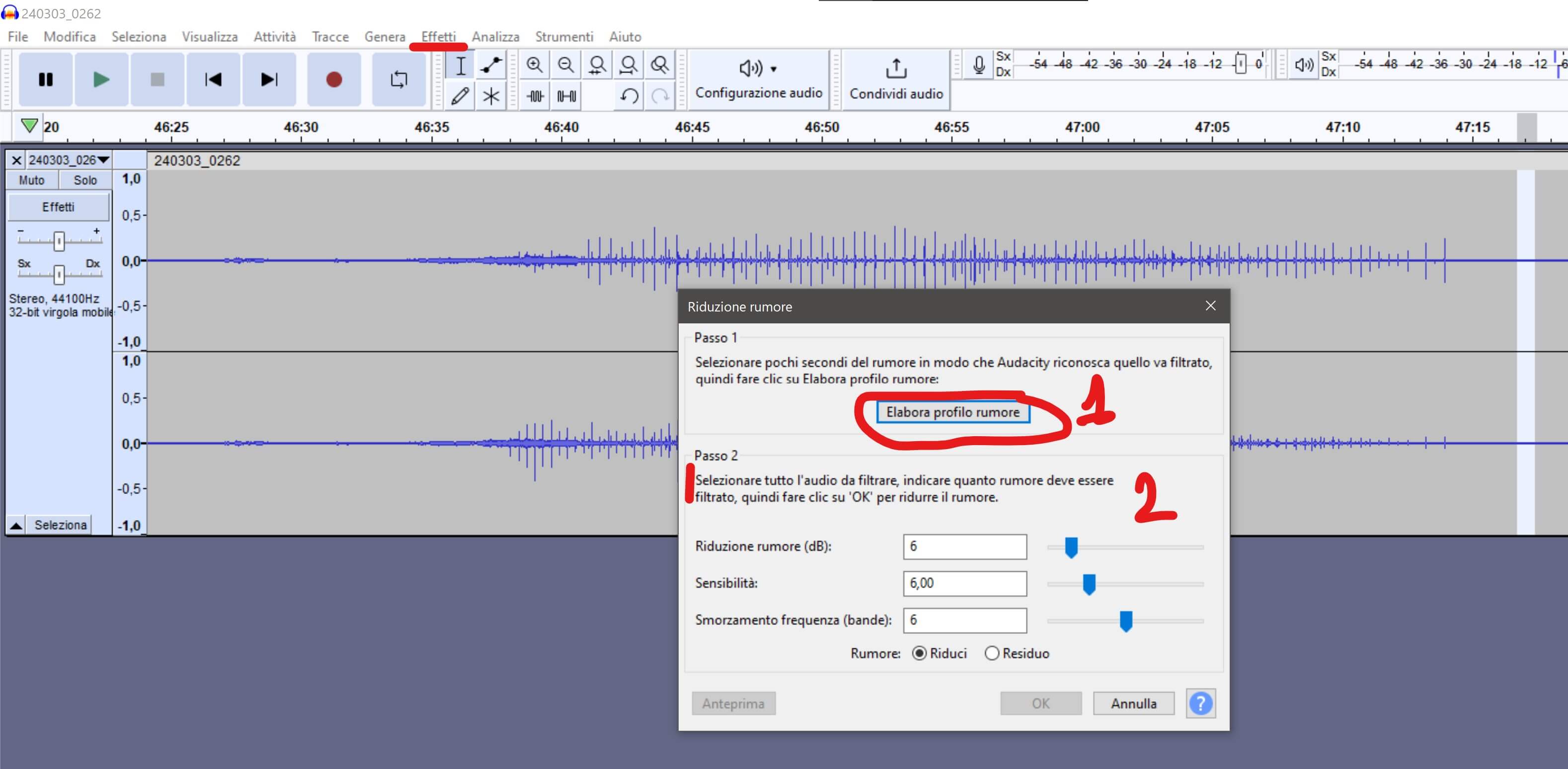 Dopo avere selezionato quell’area, andare su Effetti -> Rimozione rumore e riparazione e premere il pulsante Elabora profilo rumore. Questa procedura consente ad Audacity di individuare il suono di sottofondo che si desidera eliminare del tutto.