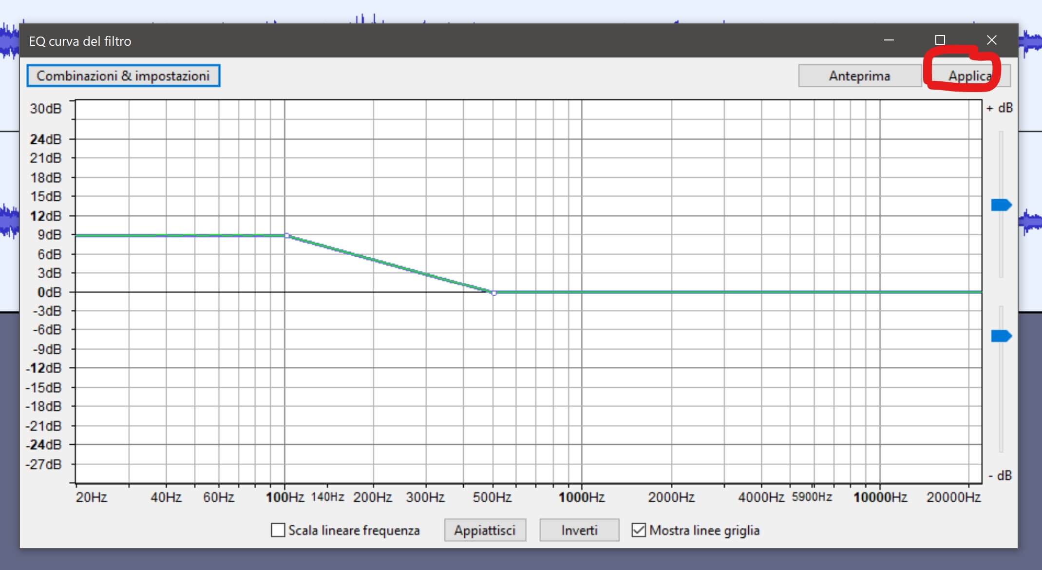 4) Il passo successivo è quello di dare un po’ di colore ai bassi. Sempre con tutta la traccia selezionata, si opera su Effetti -> EQ e filtri -> EQ curva del filtro e andando poi sul pulsante Combinazioni & impostazioni per scegliere Combinazioni predefinite -> Esalta i bassi.