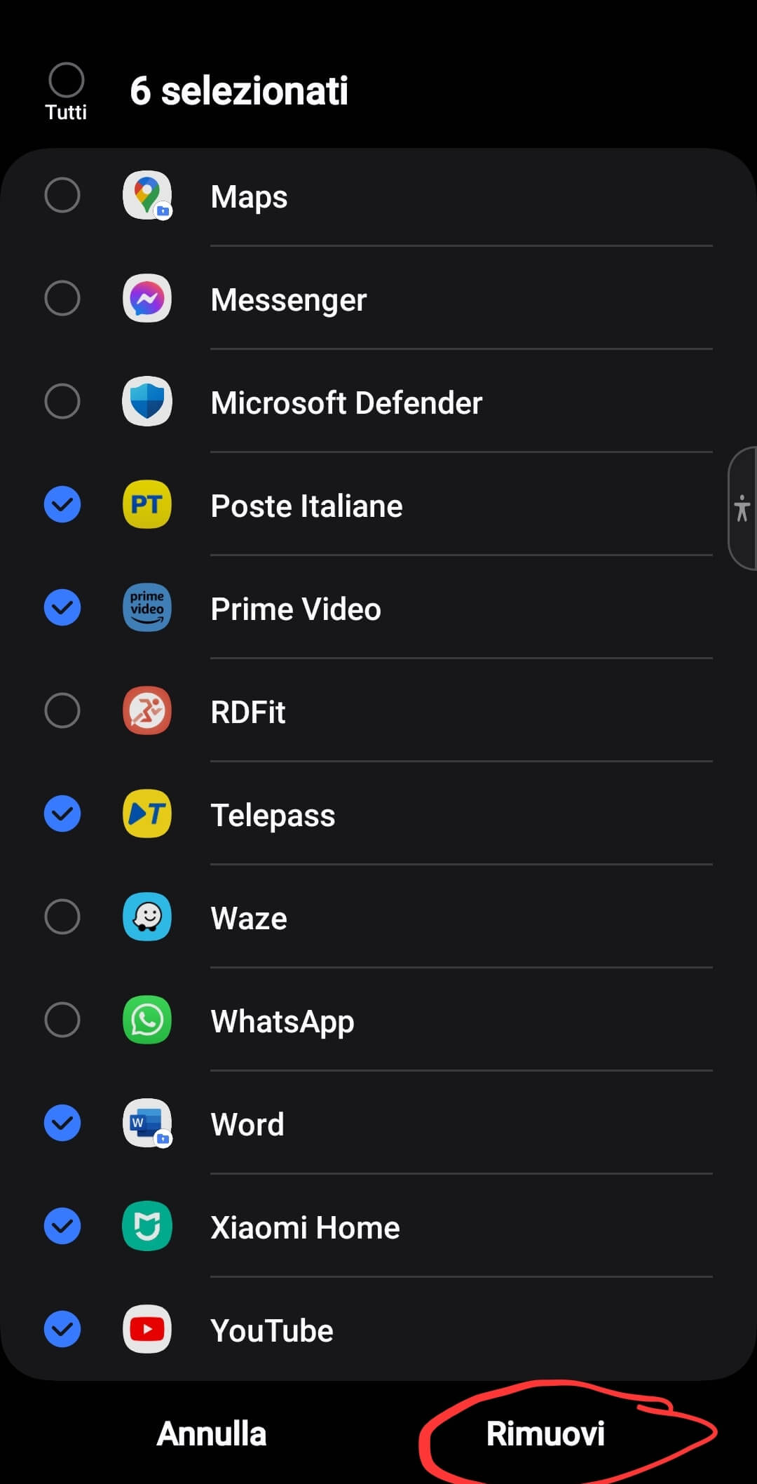 Qualora infine uno desiderasse successivamente togliere da quella lista una o più app (e.g. si nota che non funziona più correttamente per cui quella modalità risulta essenziale), è sufficiente selezionarla in modo lungo (tenendo premuto il dito per un po’) dalla lista per andare nella pagina in cui poter selezionare quelle che si desiderano togliere e premere quindi il tasto Rimuovi: in tal modo le app che erano state selezionate potranno tornare a operare in background.
