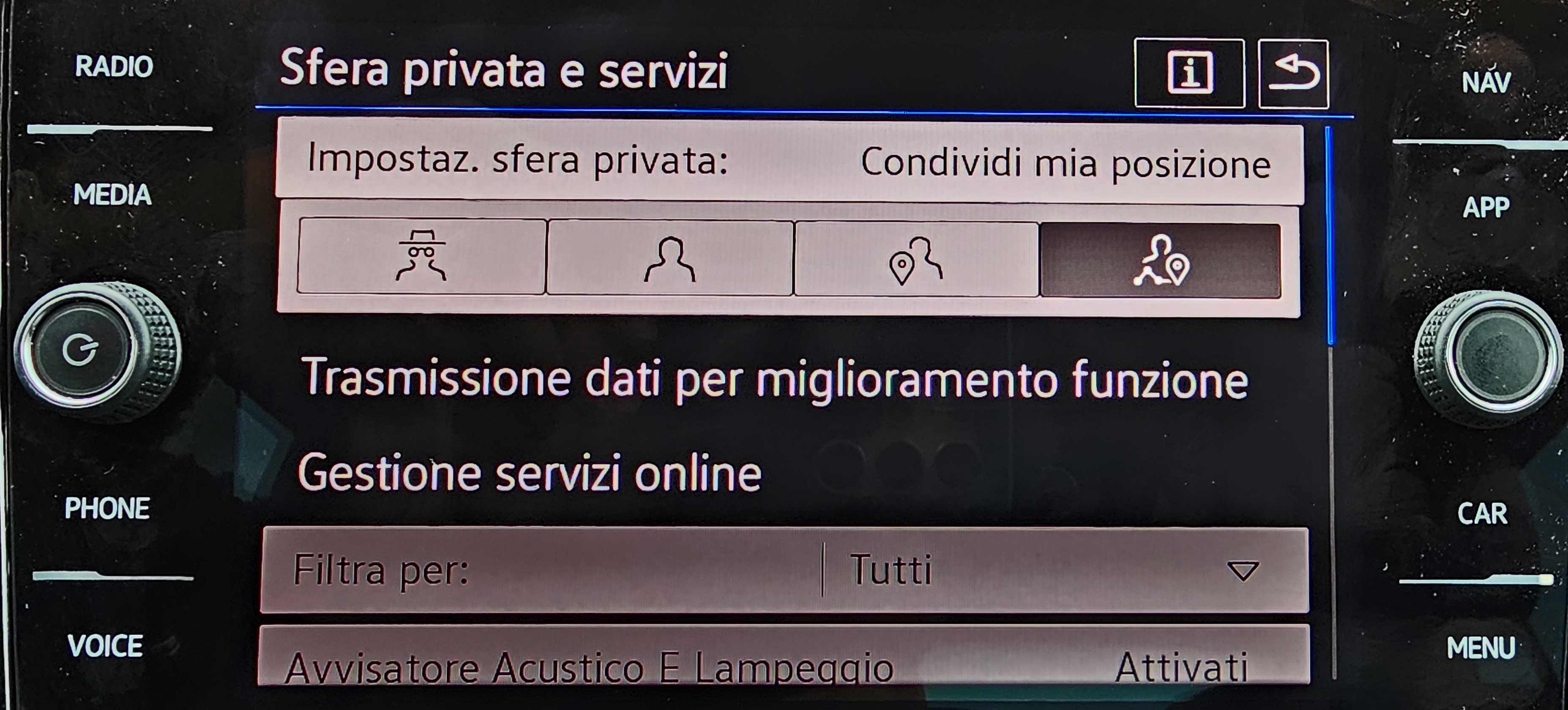 Avevo da tempo impostato il tutto opportunamente e tutti i servizi remoti risultavano funzionanti tramite quell’app. Tuttavia, dopo un aggiornamento del software del veicolo, inspiegabilmente la localizzazione dell’auto non risultava più presente e, all’accensione del veicolo veniva mostrato sul display una finestra che anziché ricordare il livello basso di privacy indicava nuovamente una sfera privata massima.