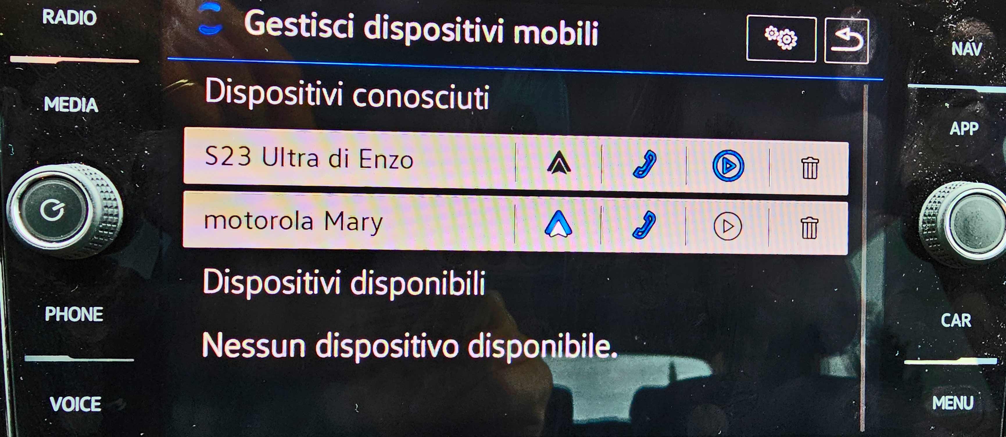 Se si desidera poi aggiunger/gestire il collegamento di uno o più smartphone, è necessario andare su Menù -> Setup -> Gestisci dispositivi mobili. Si noti che si può attivare il collegamento per chiamate anche per più dispositivi contemporaneamente. Inoltre per modelli di smartphone generalmente vecchi (e.g. 2018), per poterli collegare alla macchina (e quindi ad esempio poter vedere il navigatore o altre app sul display dell’auto) può essere necessario dover collegare il dispositivo a una delle prese usb-c dell’auto e non semplicemente attivare il bluetooth.