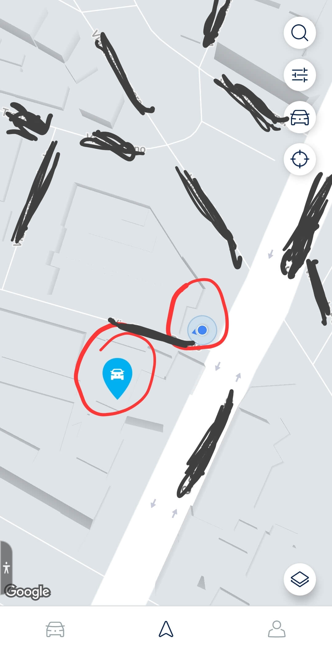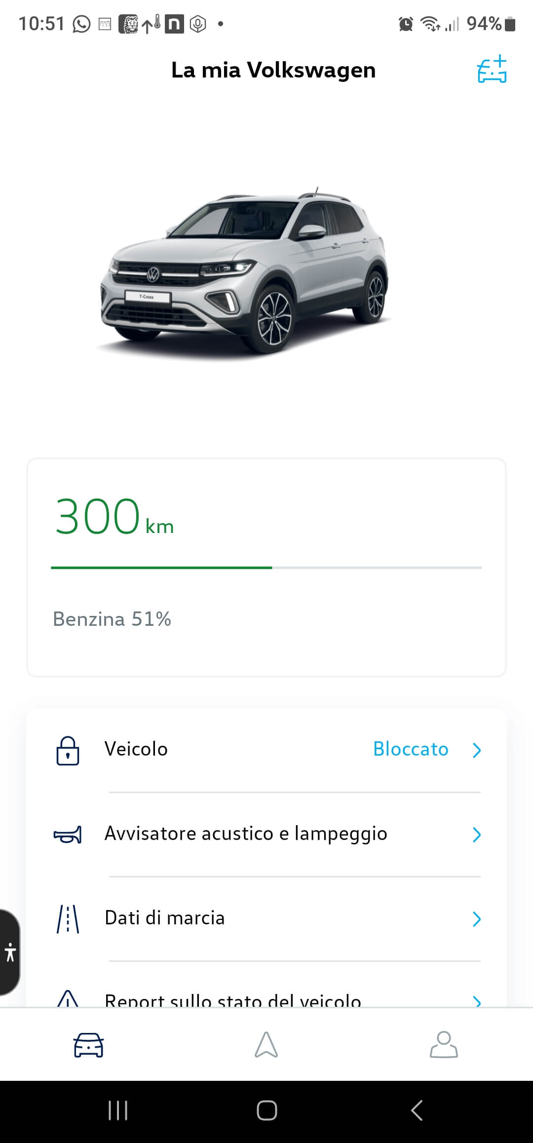 Si noti che nella mappa viene indicata non solo la posizione del veicolo ma anche la propria posizione attuale in modo da rendere più agevole raggiungerla sebbene non sia presente una funzionalità di navigazione ma solo una freccina che suggerisce la direzione (per vederla è necessario ingrandire la mappa opportunamente con due dita).