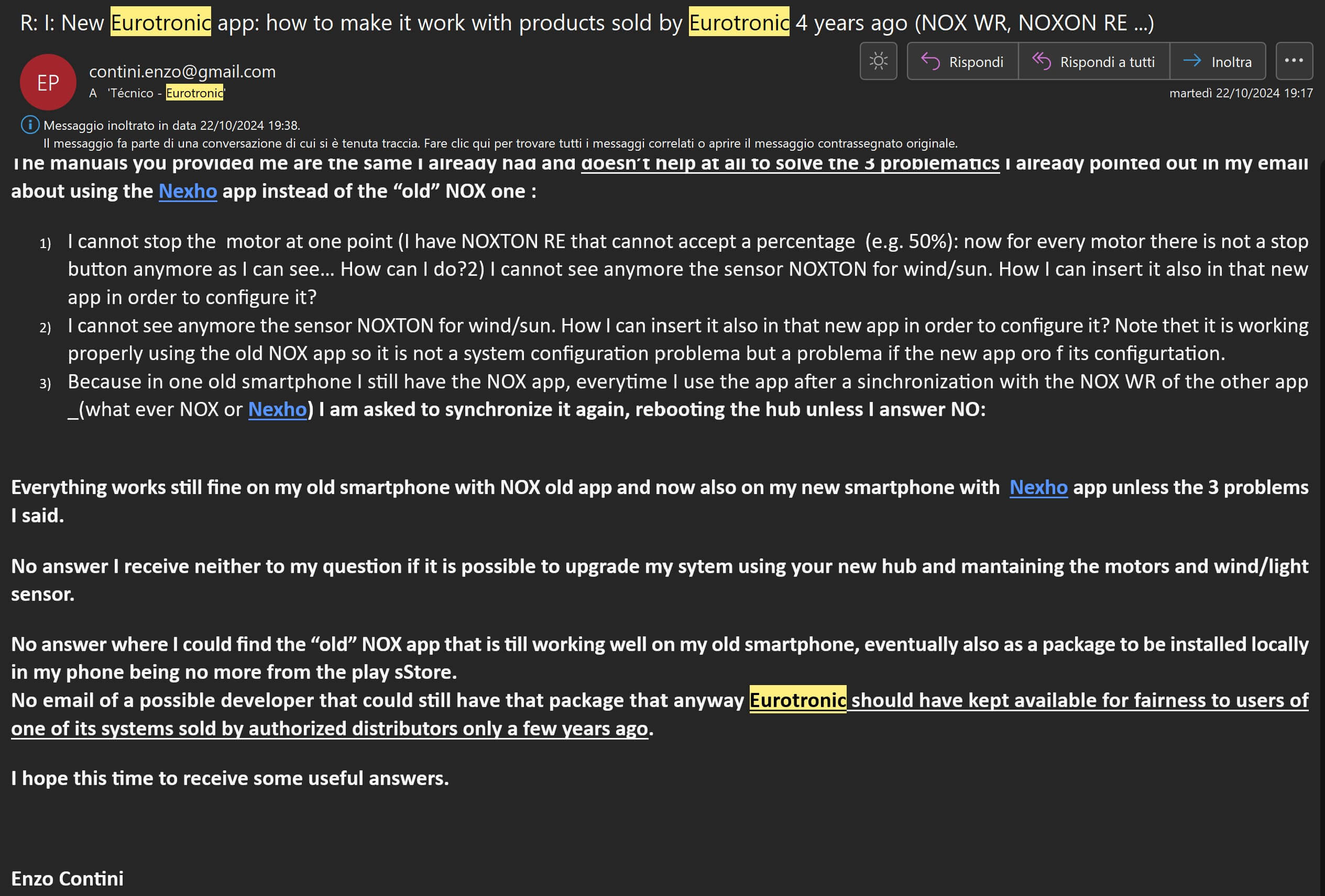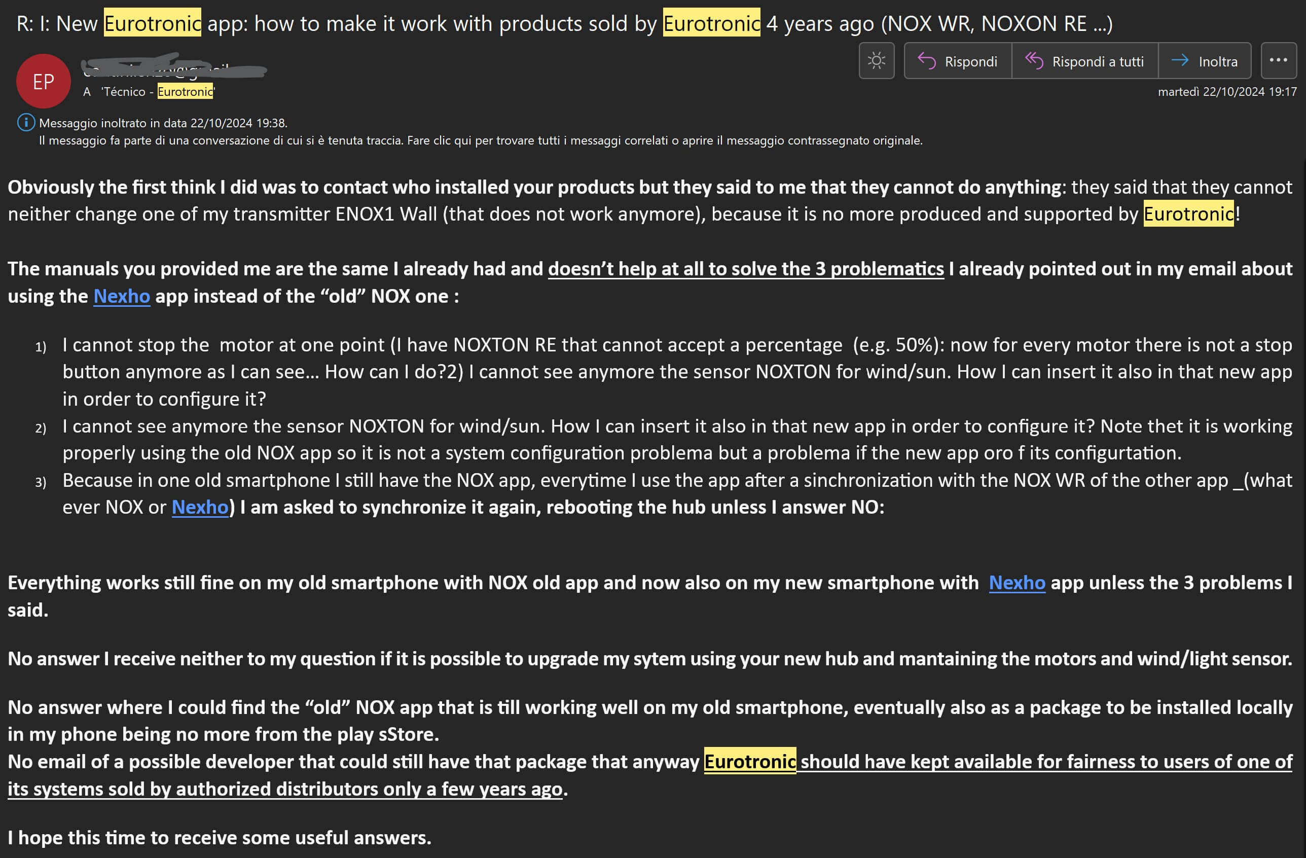 Infine, non ho più ricevuto risposta ad una successiva mia email finale, in cui concludevo dicendo: “No answer I received neither to my question if it is possible to upgrade my system using your new hub and maintaining the motors and the wind/light sensor I have, nor where I could find the “old” NOX app that is still working well on my old smartphone, eventually also as a package to be installed locally in my phone being no more available from the Play Store.