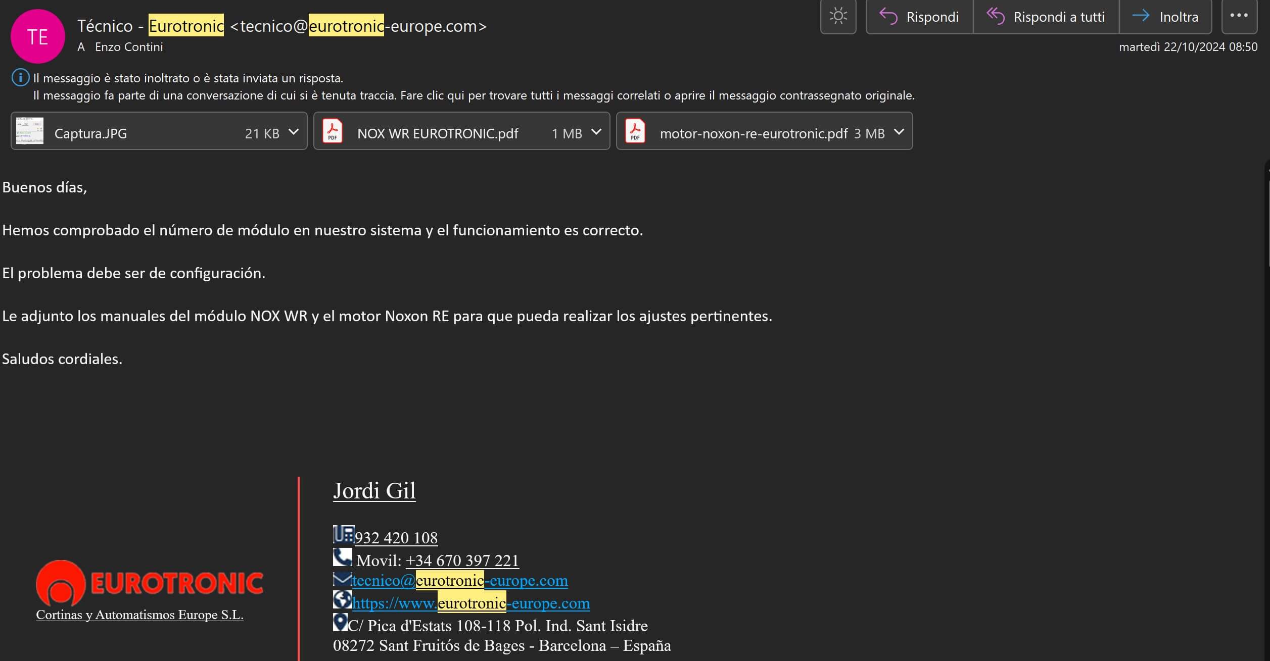 Non ho potuto che scrivergli nuovamente (questa volta in italiano e con traduzione automatica in spagnolo! 🙄) che ovviamente la ditta autorizzata che me lo aveva installato è stata la prima da me contattata ed è stata proprio quella a dirmi che la Eurotronic non produceva più quel sistema di domotica e non offriva più supporto per quella che mi avevano installato solo 4 anni fa: nemmeno il mio telecomando ENOX WALL rotto si poteva sostituire con uno nuovo funzionante!!