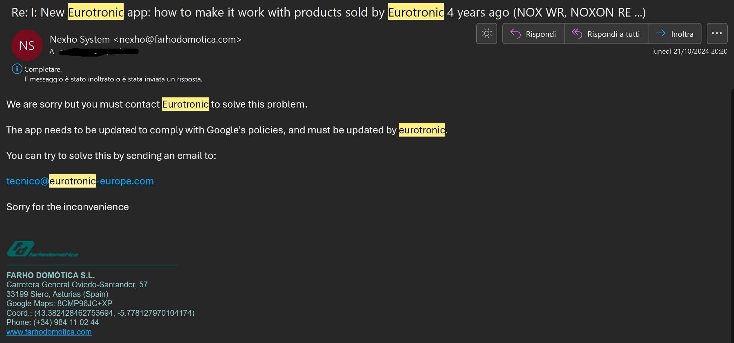 Non avendo quindi più speranza di trovare un aiuto dalla EUROTRONIC, ho provato allora a ricontattare la Farho Domotica SL (indicata come la ditta sviluppatrice dell’app Nexho e quella stessa che mi aveva fornito l’email tecnica della EUROTRONIC): essendo quella loro app assai simile a quella NOX, ho immaginato che probabilmente fosse stata quella medesima ditta a sviluppare anche l’app NOX o che comunque sarebbe forse stata in grado di risolvere le problematiche riscontrate utilizzando la loro app Nexho con il mio sistema di domotica della Eurotronic.