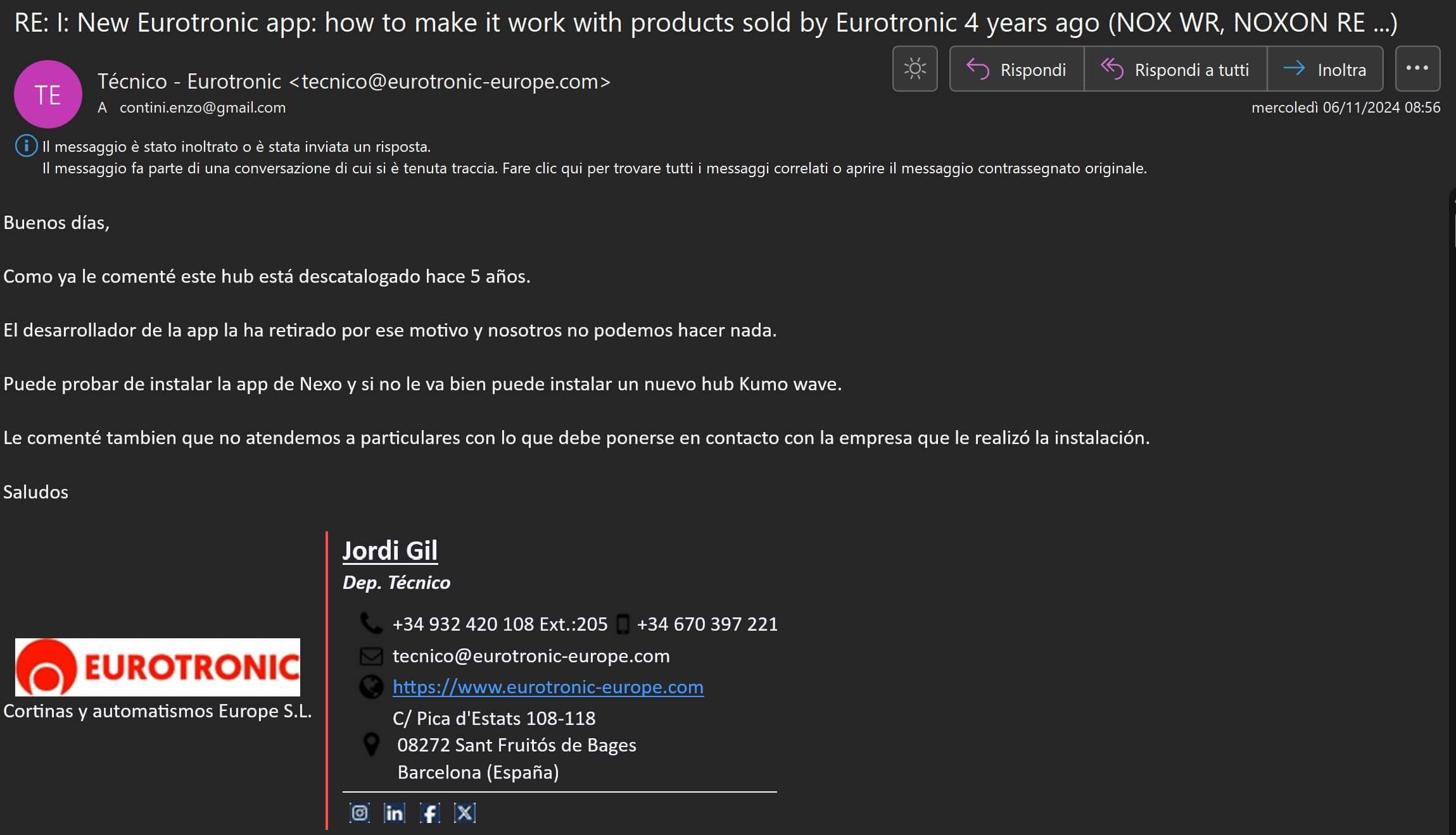 Contattata quindi la EUROTRONIC tramite quella email, pur ricevendo ora finalmente da loro delle risposte (seppur in spagnolo, pur inviando io mail in inglese!), queste non fornivano assolutamente informazioni utili per risolvere quelle problematiche da me evidenziate in modo chiaro! Nella prima risposta mi si allegavano i manuali dei prodotti, che già avevo ed erano ovviamente inutili al mio fine (quel sistema di domotica era evidentemente ben configurato a casa mia, dal momento che funzionava correttamente con l’app “vecchia” presente nel precendente mio smartphone!), poi alle successive mie email si fornivano brevi risposte inutili e di circostanza di cui fornisco traduzione (anche la richiesta di poter almeno avere l’apk della “vecchia” app NOX rimaneva inevasa): “Trattandosi di un modulo fuori produzione di anni fa, l’app non è stata aggiornata. Lo sviluppatore dello stesso è colui che può avere una soluzione“. Chiedendo allora un contatto di quello sviluppatore (evidentemente esterno alla ditta), mi si rispondeva unicamente: “Ti abbiamo fornito i manuali in modo che tu possa effettuare le relative operazioni e abbiamo verificato che il modulo sia online, quindi non presenta malfunzionamenti. Poiché non vendiamo né serviamo privati, sarebbe consigliabile lei contattasse l’azienda che ha effettuato l’installazione“… come se io non l’avessi ovviamente già fatto come primo tentativo di soluzione della problematica in questione!
