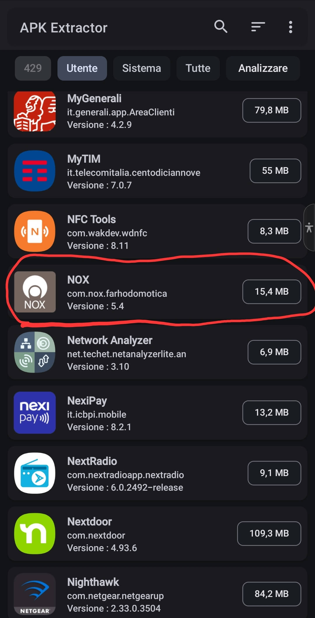 Si noti che, una volta saputo sia come mai l’app NOX non fosse più presente nel Play Store sia che l’app Nexho non era completamente compatibile con il sistema EUROTRONIC in mio possesso (NOX WR), avrei comunque potuto estrarre l’apk di quella “vecchia” app, prendendolo dal vecchio smartphone in cui è ancora installata e funzionante. A tal scopo avrei potuto utilizzare, ad esempio, l’app App APK Extractor che consente, appunto, di estrarrne il pacchetto di installazione di un’app presente nel medesimo smartphone, salvandolo in una apposita cartella che uno indica durante tale processo (e.g. la cartella APK SALVATI da me creata): ho infatti provato personalmente a usare questa procedura e l’apk che è stato salvato si è dimostrato identico a quello fornitomi dalla Farho Domotica SL, vale a dire la versione 5.4: tramite l’app APK Extractor si scopre anche che quell’ultima versione dell’app NOX ha come target Android 9.0, cioè una versione del 2012 di quel sistema operativo (ora gli smartphone recenti hanno Android 14):