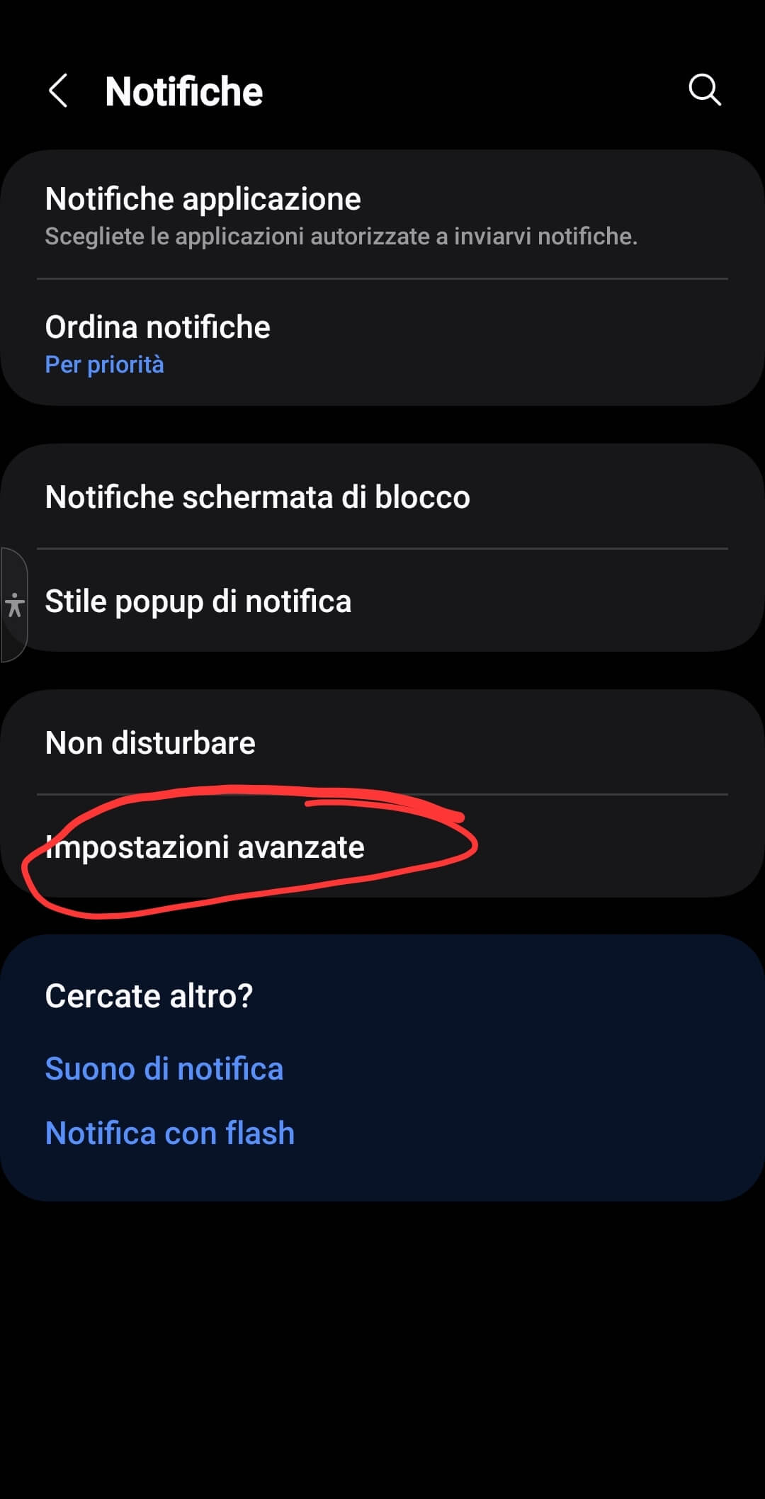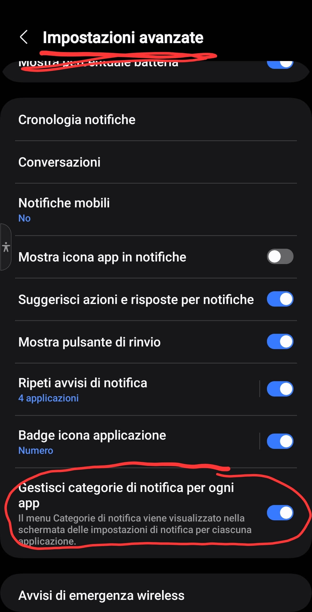 Dopo probabilmente qualche aggiornamento del sistema operativo o dell’interfaccia utente delle impostazioni di Samsung, ora è necessario, per poter configurare un suono specifico per un’app, andare ad attivare (essendo disattivato per default) “Gestisci le categorie di notifiche per ogni app” da Impostazioni/Notifiche/Impostazioni avanzate“.