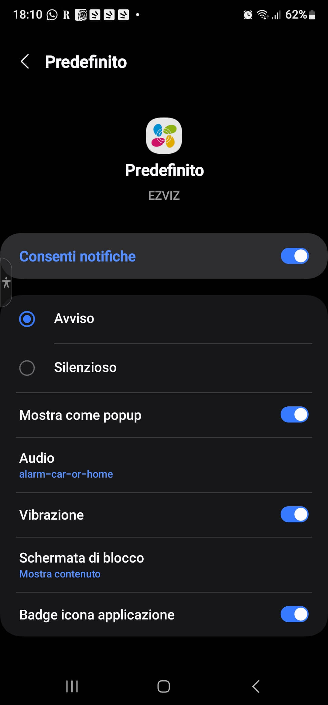 A questo punto si puoi vedere in ciascuna app specifica (e.g. Ezviz) le opzioni per poter selezionare il suono più opportuno per quello Predefinito: nel caso specifico mi compaiono due Predefinito nella Categoria di notifiche di quell’app che ho entrambe impostato con il medesimo file personalizzato alarm-car-or-home-.mp3.