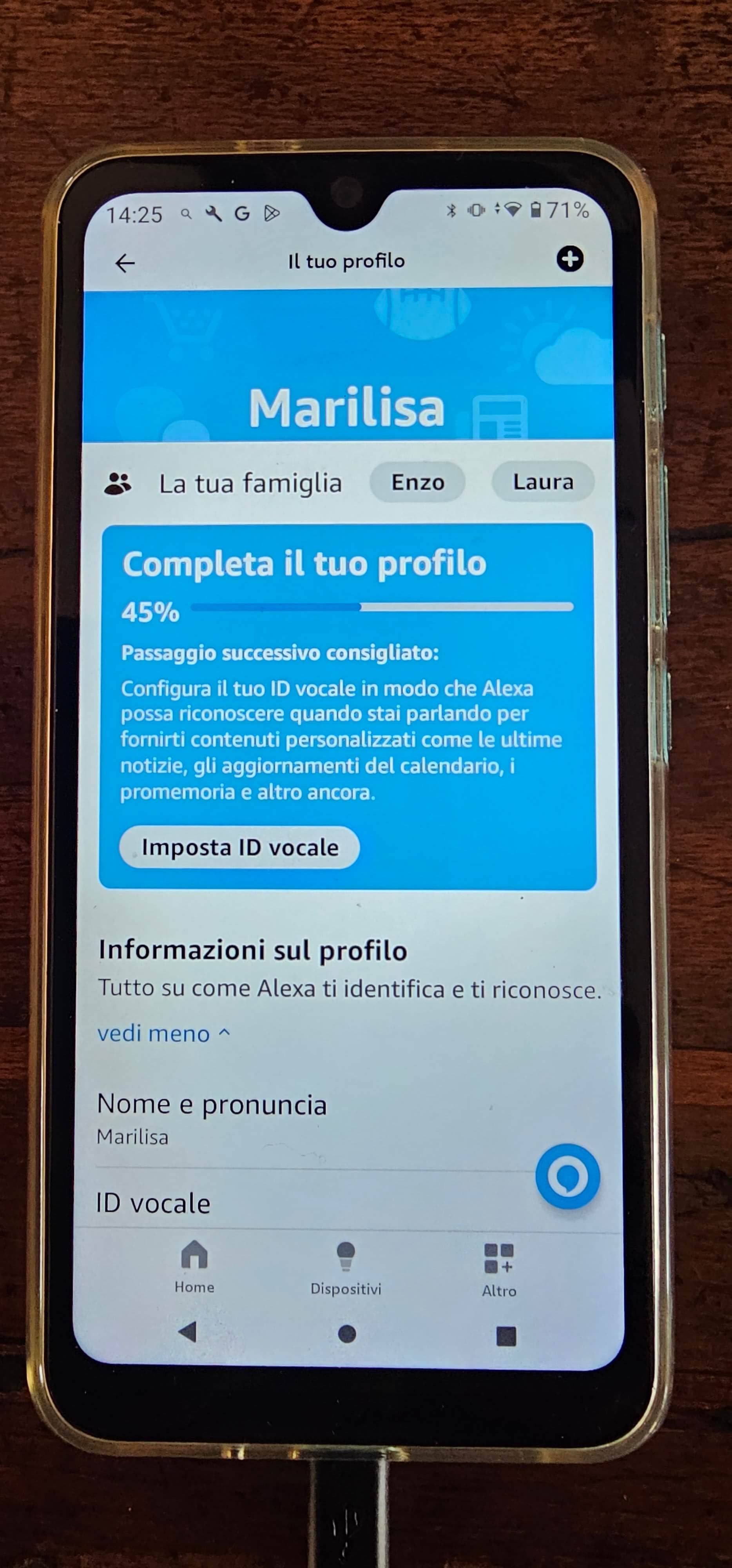 Premendo quel tasto Imposta ID vocale, se si acconsente alla creazione del proprio profilo vocale, verrà proposta di leggere alcune frasi da parte del familiare proprietario dello smartphone, informazioni che verranno utilizzate da Alexa per riconoscerlo. Per verificare che il processo sia effettivamente andato a buon fine, si può, ad esempio, chiedere a un qualsiasi dispositivo Alexa: “Alexa, dammi le ultime notizie“. Risponderà: “Ciao – il nome della persona –. Ecco le tue notizie!“. Il riconoscimento della voce della specifica persona servirà ovviamente poi anche per rispondere adeguatamente a tutte quelle domande che necessitano una specializzazione in base a chi le richiede (e.g. “Alexa metti della musica che mi piace“).
