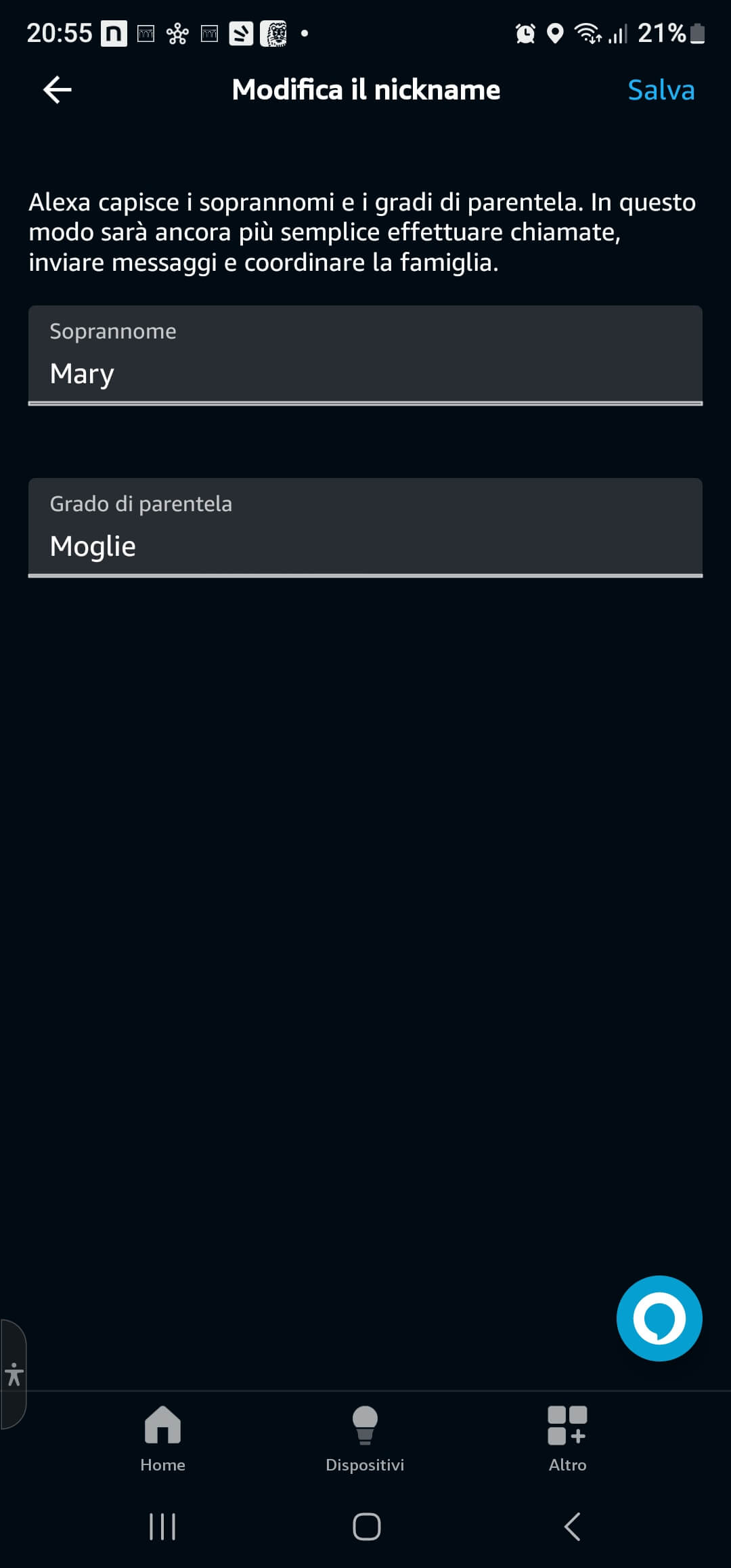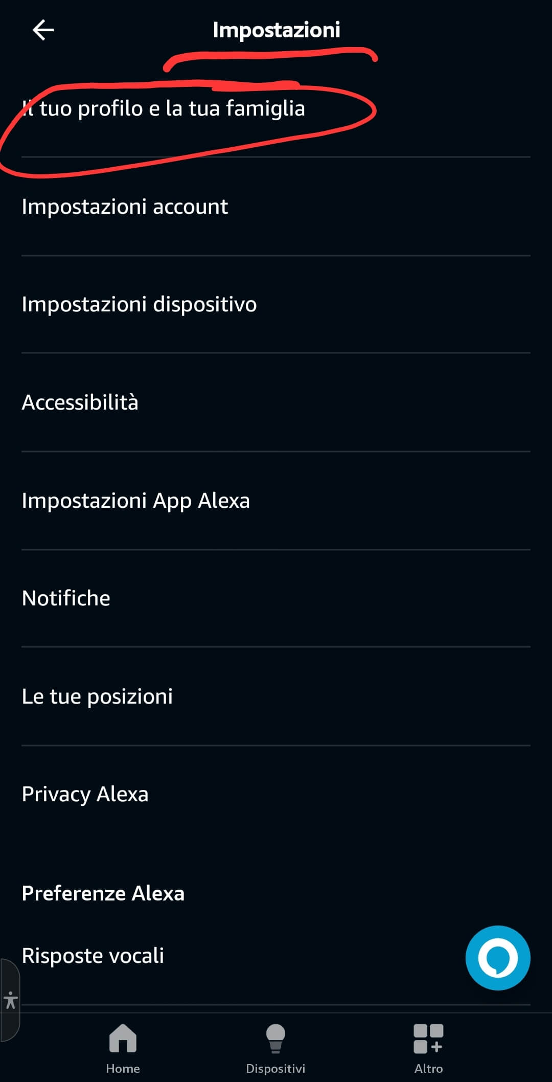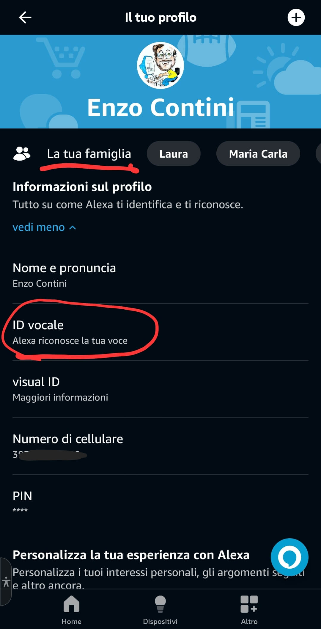 Come fare quindi a fare riconoscere da Alexa la voce di una delle persone che uno ha inserito nel definire la propria famiglia (in alto nella sezione Altro del menù in basso e poi scegliendo Impostazioni/Il tuo profilo e la tua famiglia)? Si noti che premendo il tasto “+Aggiungi un’altra persona” è possibile appunto aggiungere un nuovo nominativo di un familiare… ma non sembra esistere dall’app Alexa un modo per cancellarne uno inserito precedentemente e neppure modificarne il nome! 🤔