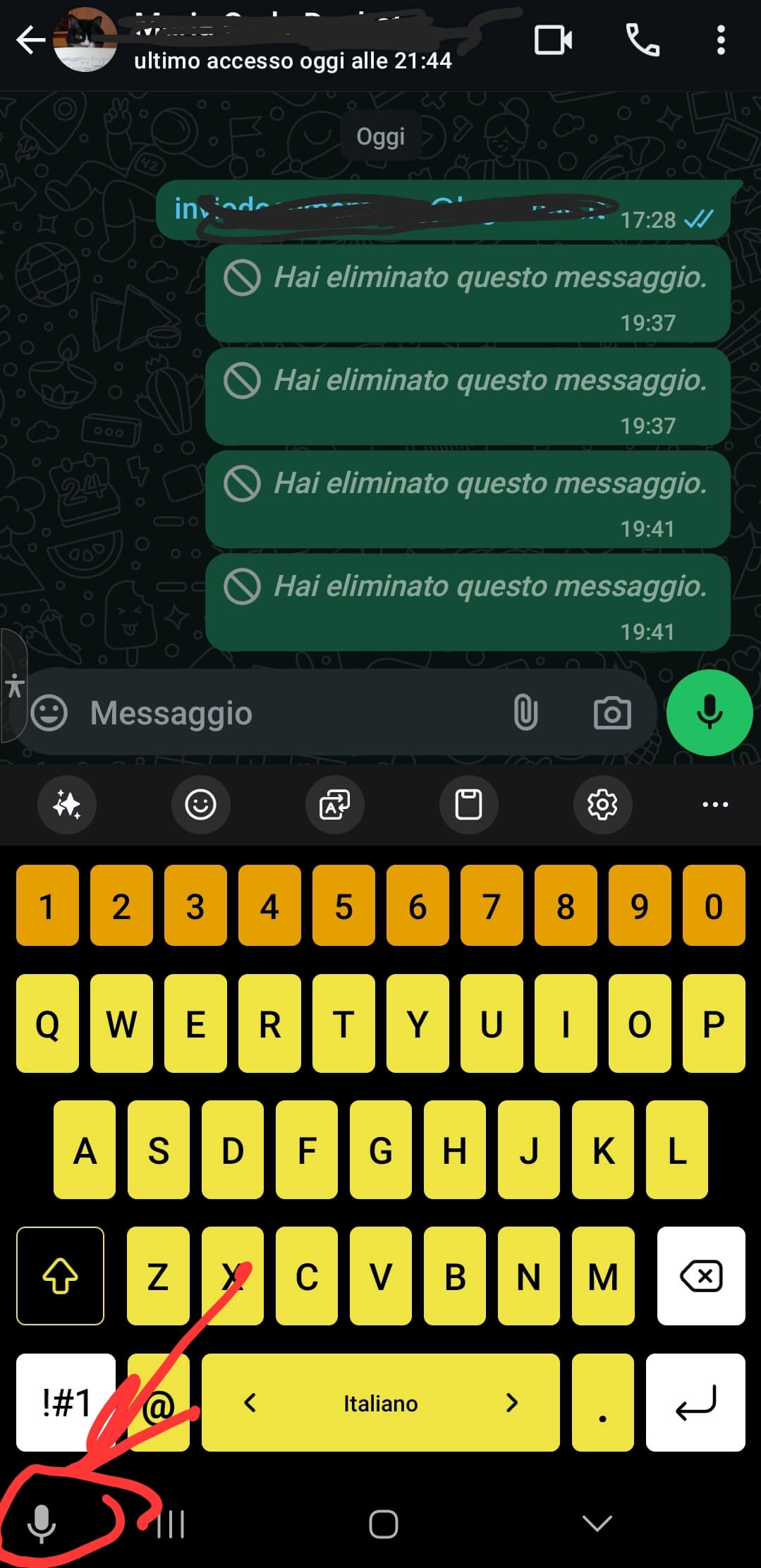 - Toccare il campo di immissione di un nuovo messaggio: viene aperta automaticamente la tastiera che consentirebbe appunto la scrittura del testo che ora invece verrà inserito automaticamente trascrivendo ciò che detteremo, tramite riconoscimento vocale.