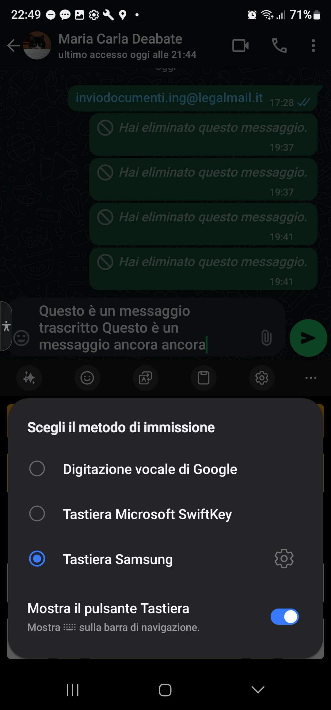 Si noti che, se uno tiene premuto quell’icona di microfono per un 3″ al posto di toccarlo normalmente, anziché attivarsi la trascrizione compare una finestra di popup che consente di selezionare Inserimento vocale o Metodo di inserimento: selezionando quest’ultima scelta, vengono proposte le diverse la tipologia di tastiera installate (e.g. Tastiera Microsoft SwiftKey, Tastiera Samsung) o appunto la Digitazione vocale di Google: