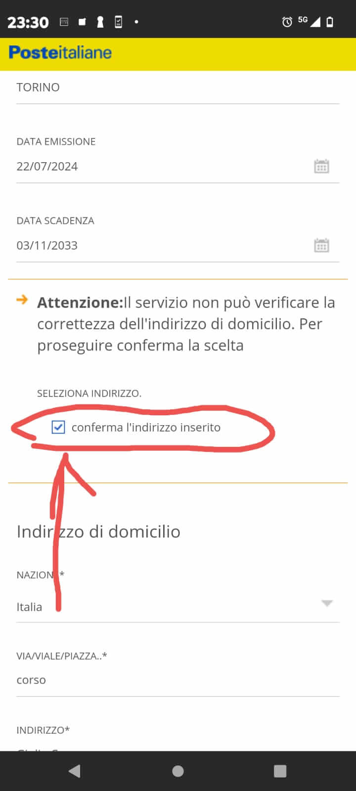 Tuttavia, cercando di inoltrare i dati inseriti dopo averli ben verificati, la procedura si blocca inaspettatamente con questa segnalazione: “Attenzione: Si sono verificati degli errori in fase di compilazione. Verifica la correttezza dell’indirizzo prima di proseguire“. Scorro il modulo per raggiungere la sezione dell’indirizzo che verifico essere corretto, ma in cui è stata inserita questa segnalazione: Attenzione: il servizio non può verificare la correttezza dell’indirizzo di domicilio. Per proseguire conferma la scelta… con una checkbox per confermare appunto la correttezza dell’indirizzo inserito. 🙄
