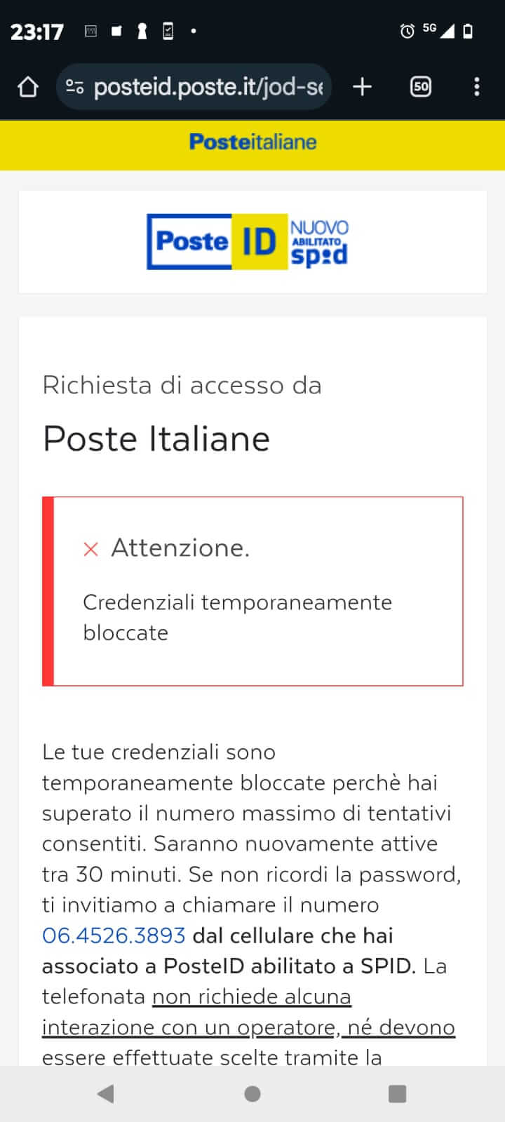 Ora non so bene se fosse dovuto al fatto che io avessi tentato di autenticarmi con l’app PosteID diverse volte prima di leggere attentamente il messaggio di motivazione di quella Autorizzazione fallita e avessi compreso il da farsi, ma cercando di autenticarmi poi sul sito posteid.poste.it mi era stato segnalato: Attenzione. Credenziali temporaneamente bloccate.