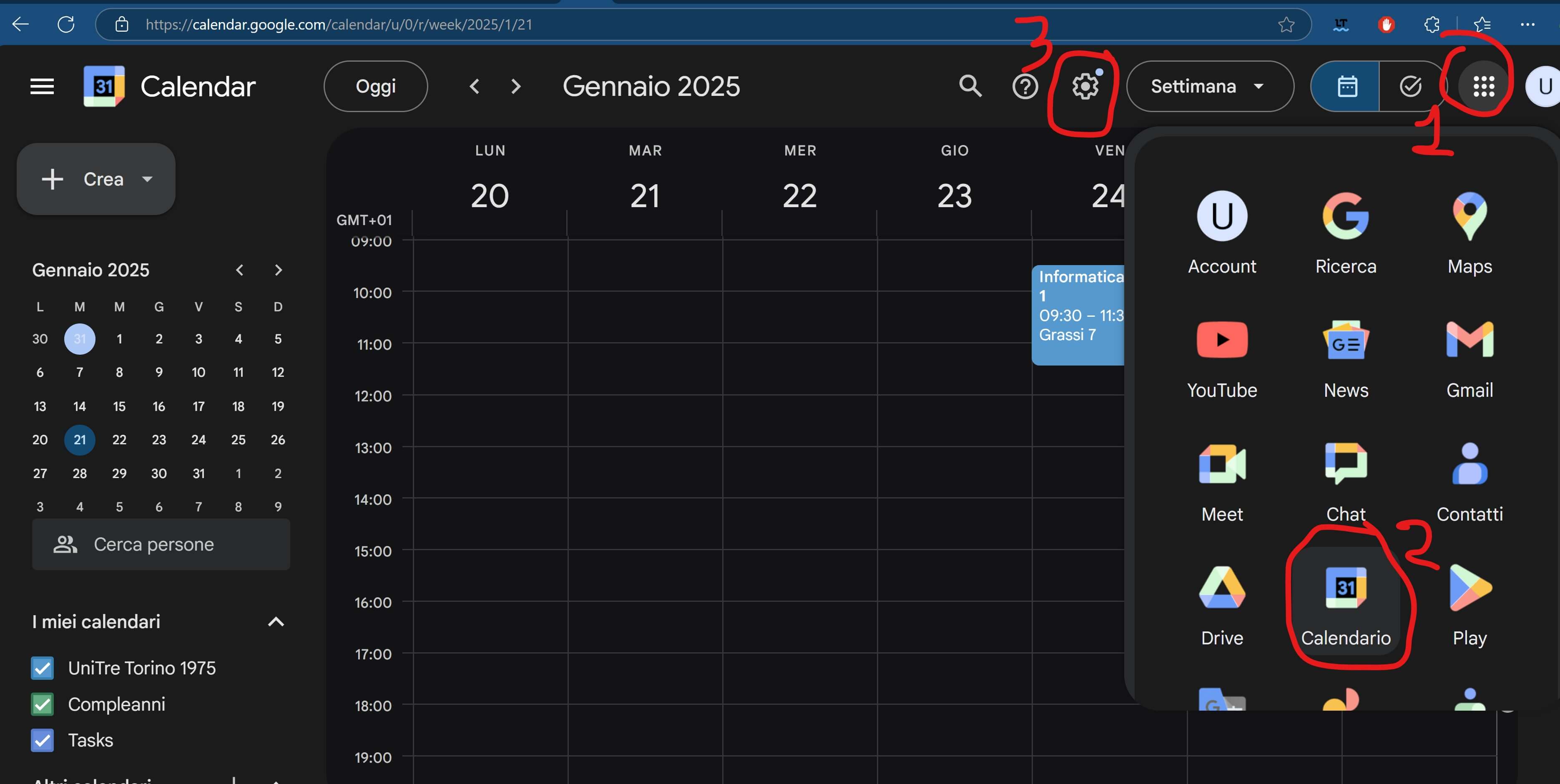 - Selezionare l’icona con i puntini (in alto a destra) per visualizzare tutti i servizi offerti da Google e scegliere Calendario;