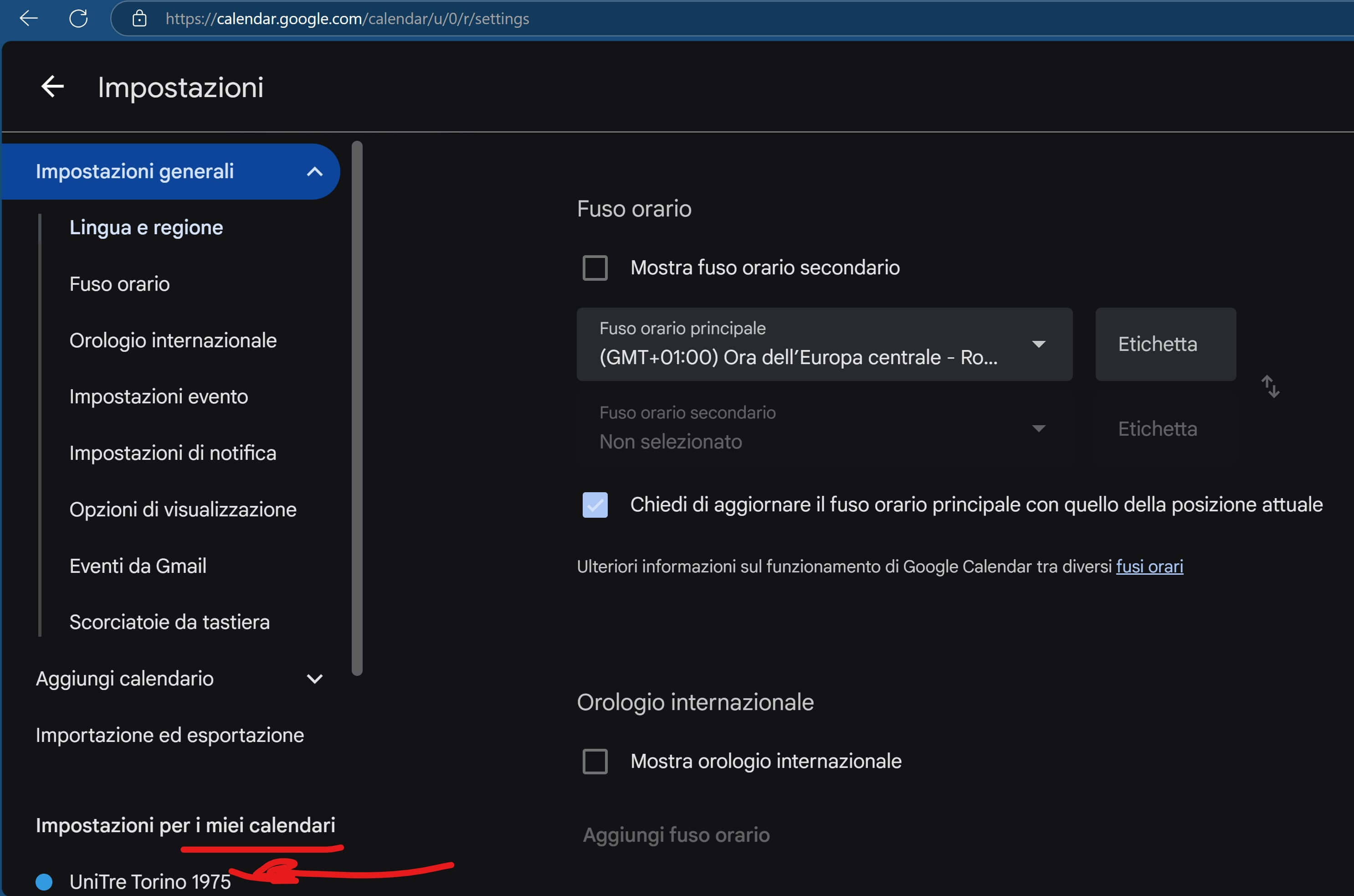 - Le impostazioni specifiche a ciascun calendario associato a quell’utente si visualizzano cliccando sul calendario specifico (e.g. UniTre Torino 1975) tra quelli elencati (a sinistra in fondo) nella sezione azioni per i miei calendari.