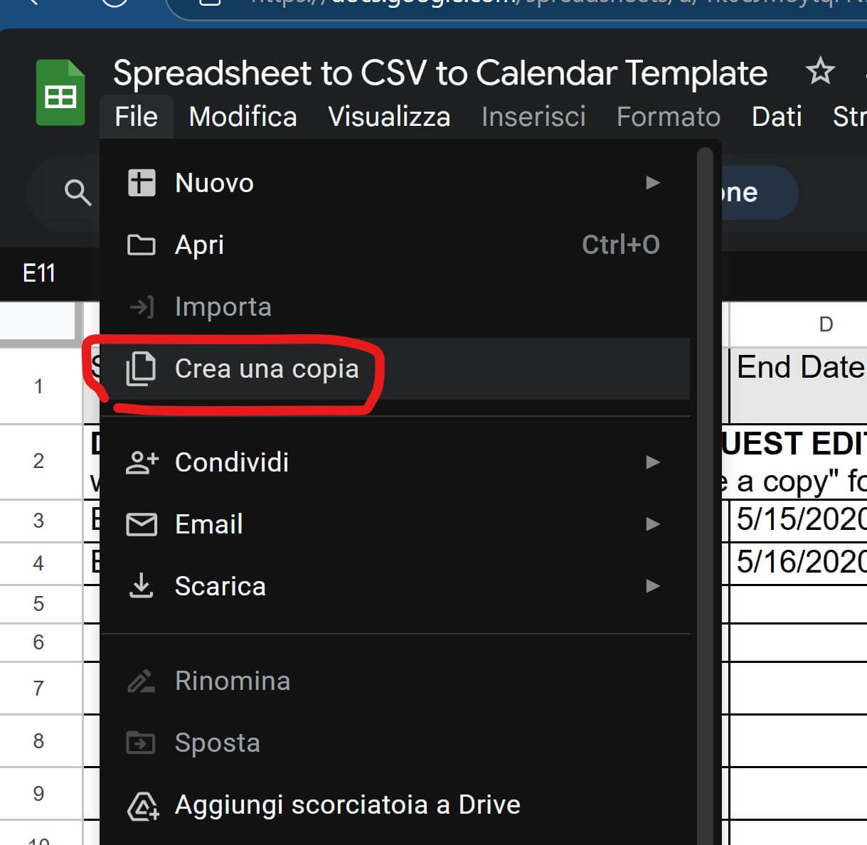 - Importazione degli eventi presenti in un foglio di calcolo (e.g. spreadsheet Excel o Google Sheets) opportunamente configurato e salvato (e.g. formato .csv). Si può trovare un file di esempio, già con i campi richiesti da quel Calendario di Google, andando in questo link: quel template si può duplicare e salvare nella propria area del cloud Drive di Google (cartella Il mio Drive), per poi modificarlo a piacere online, inserendo i propri eventi; si può quindi scaricare sul proprio PC nel formato .csv per poi essere importato nel Calendario agendo dalla sezione Importazione ed esportazione -> Importa delle Impostazioni del Calendario online.