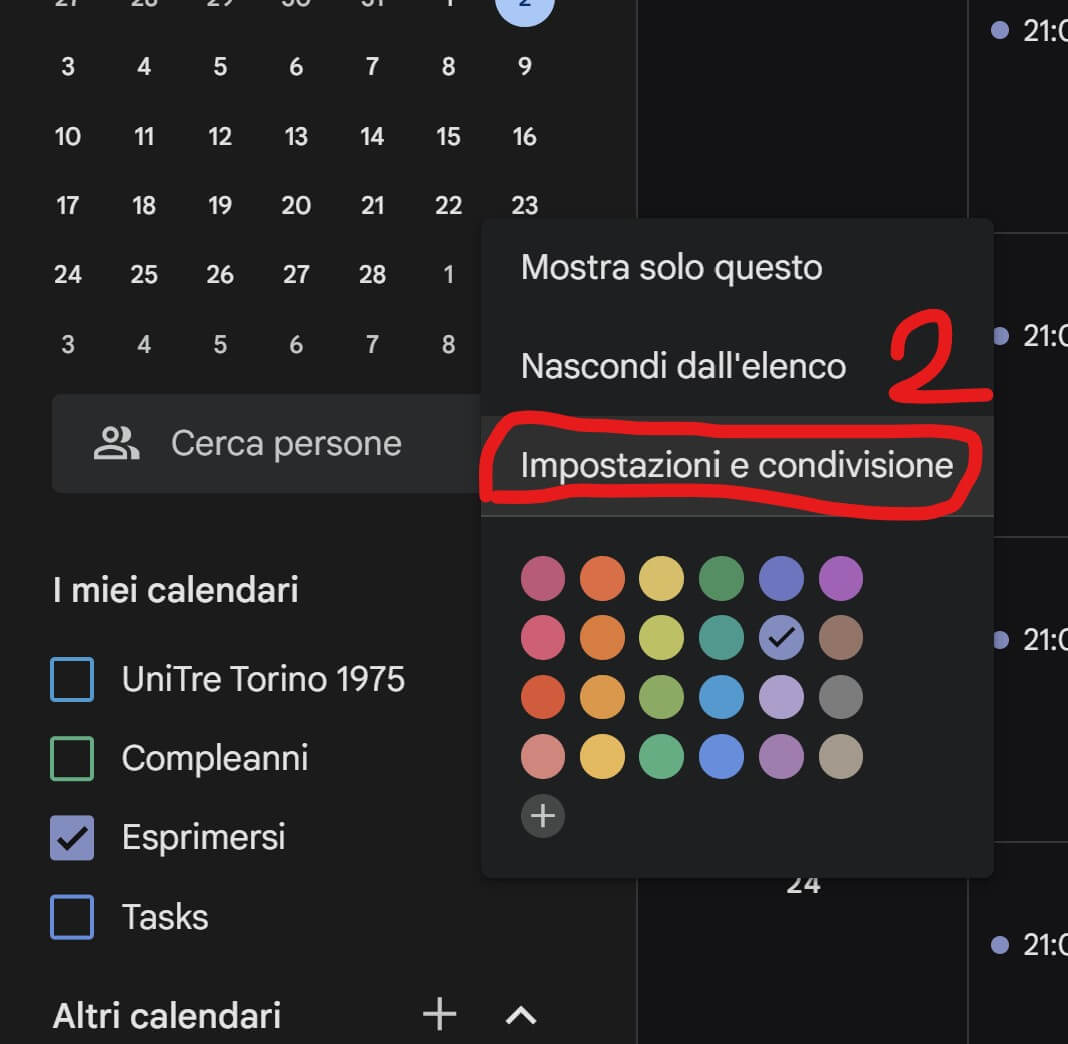 Se poi si vuole caricare gli eventi del calendario in un campo che richiede la URL di un calendario impostato come pubbico con formato iCal (e.g. https://calendar.google.com/calendar/ical/…/public/basic.icso) oppure il codice per incorporarlo in una pagina web (e.g. ), è sufficiente andare a copiare tali informazioni accedendo alla pagina che si può raggiungere anche semplicemente cliccando sui tre puntini a destra del nome del calendario selezionato che si desidera utilizzare (e.g. Esprimersi) e poi selezionando Impostazioni e condivisione dal nel menù a tendina che compare: nel caso di incorporazione del codice come <iframe> si può poi andare a personalizzare la stringa per la visualizzazione del calendario (in lista, settimanale o mensile) premento l’apposito pulsante Personalizza.