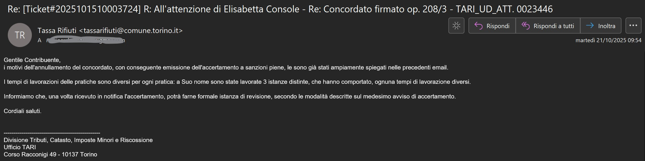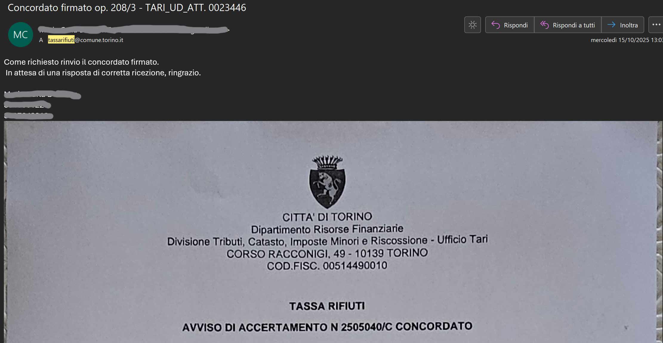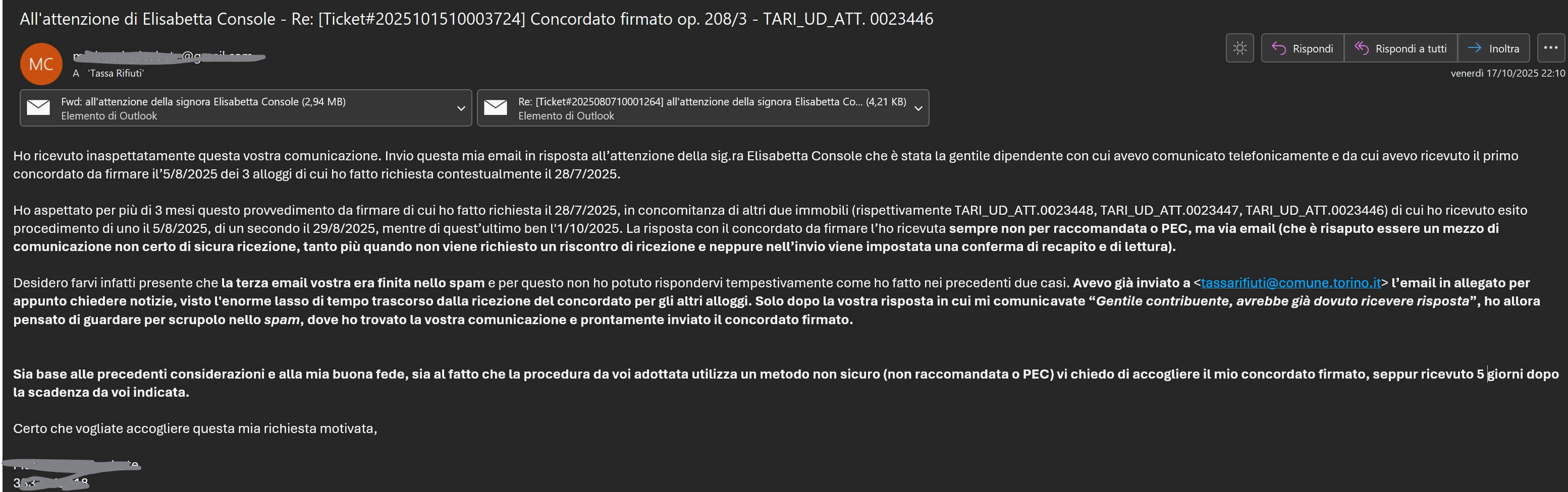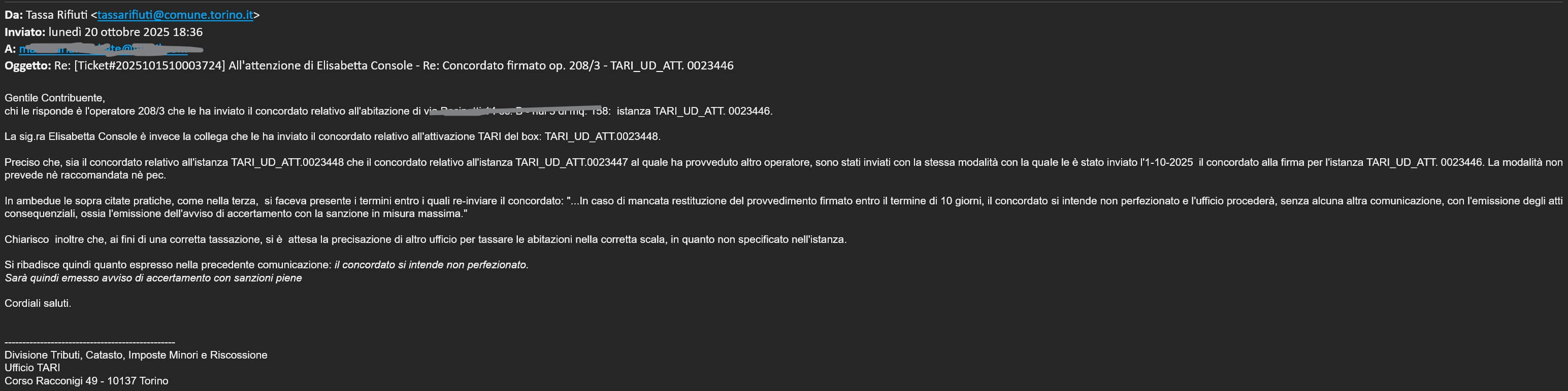 Si è dovuto aspettare più di 2 mesi per ricevere il terzo concordato da firmare di cui si è fatto appunto richiesta il 28/7/2025 (in concomitanza degli altri due immobili di cui si è ricevuto l’esito del procedimento – con allegato il concordato da restituire firmato – il 5/8/2025 per uno e il 29/8/2025 per l’altro): per quest’ultimo la e-mail è stata inviata da tassarifiuti@comune.torino.it ben il 1/10/2025.