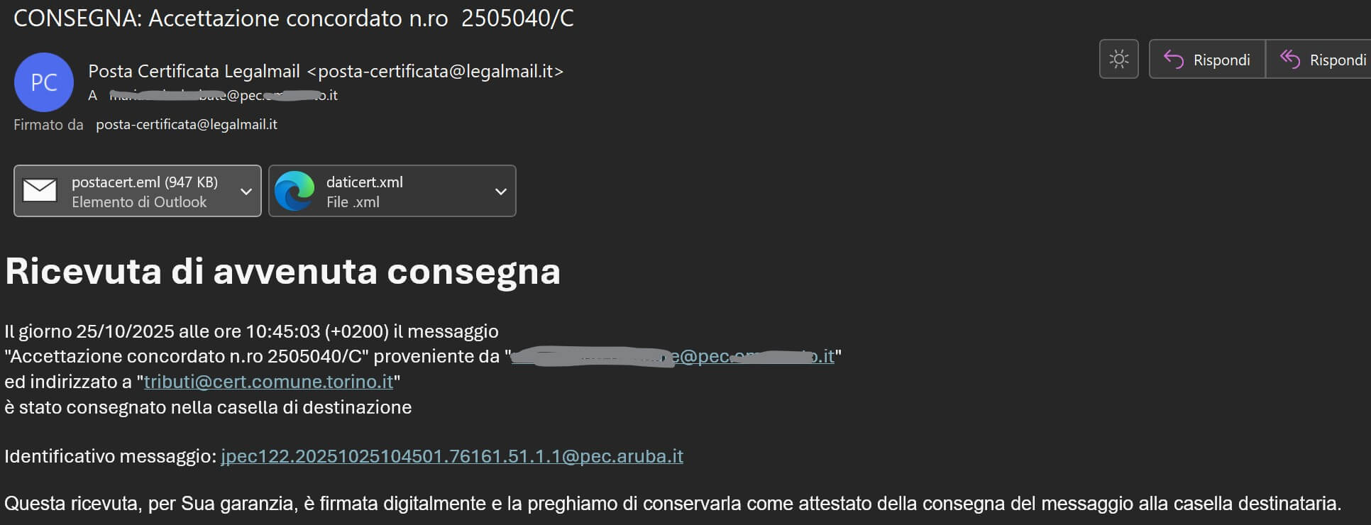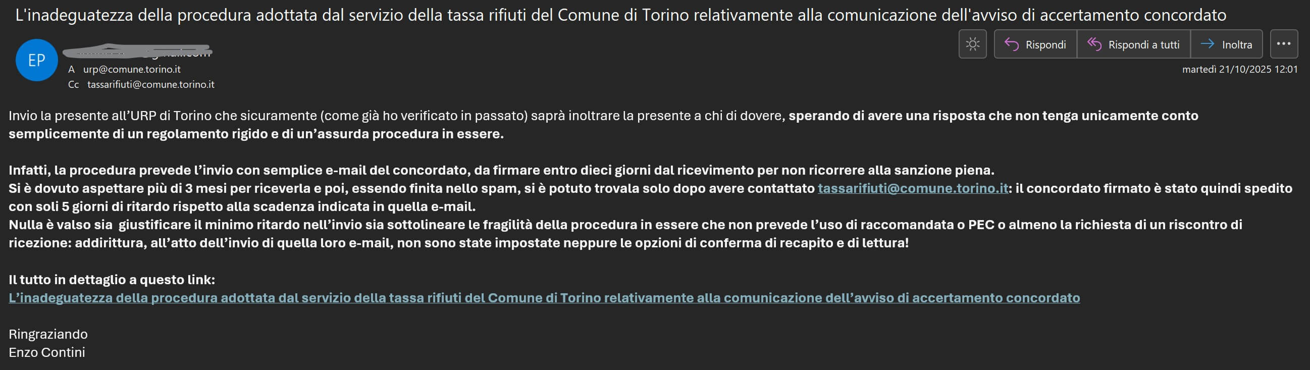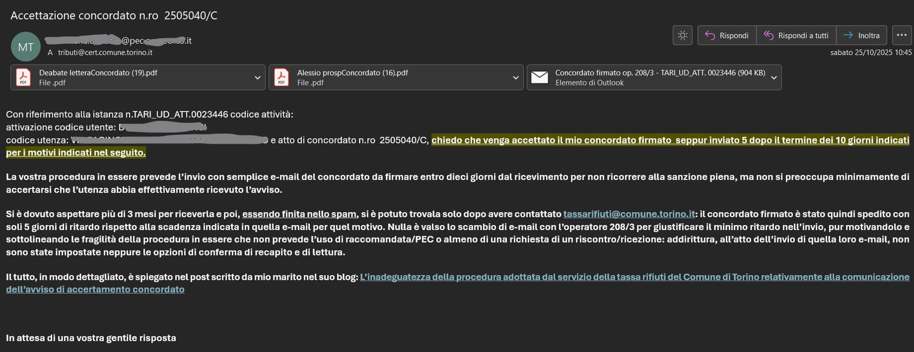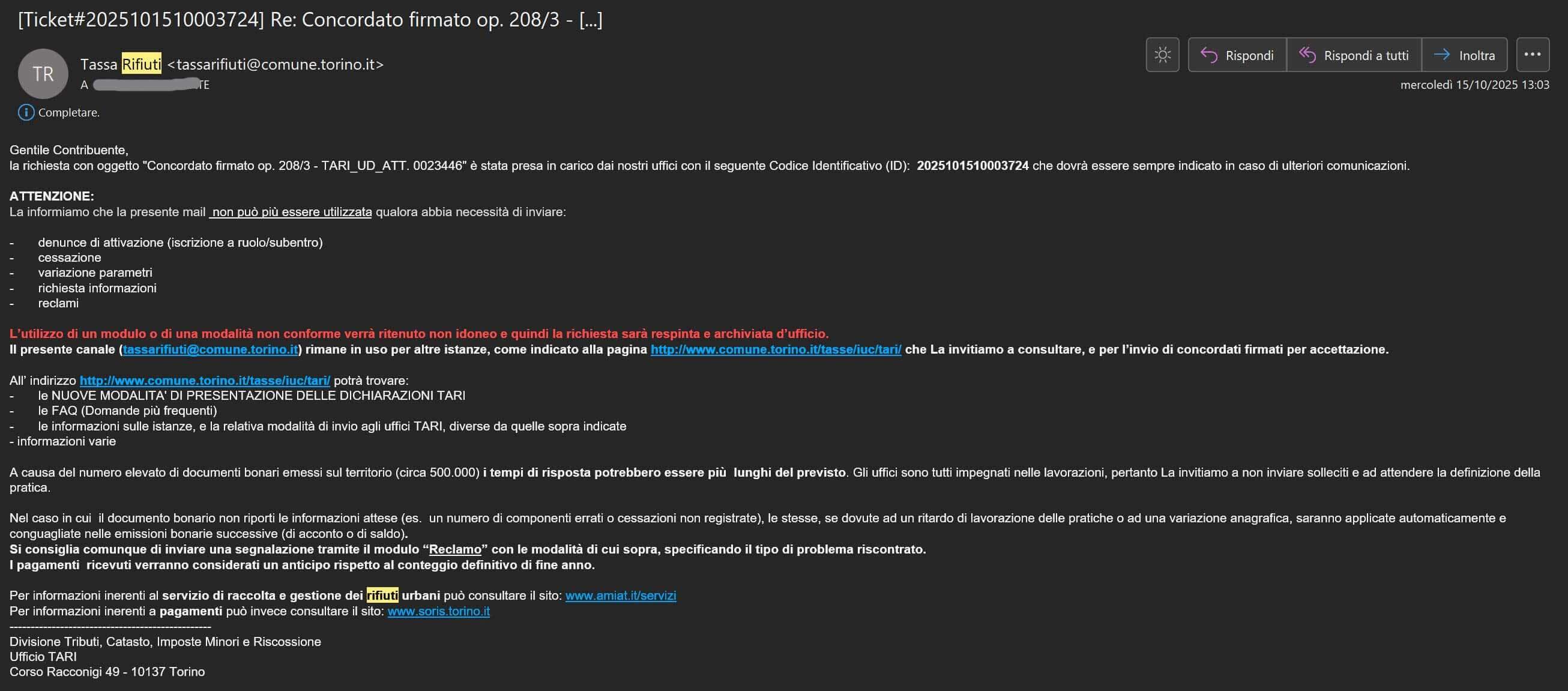 Si è dovuto aspettare più di 2 mesi per ricevere il terzo concordato da firmare di cui si è fatto appunto richiesta il 28/7/2025 (in concomitanza degli altri due immobili di cui si è ricevuto l’esito del procedimento – con allegato il concordato da restituire firmato – il 5/8/2025 per uno e il 29/8/2025 per l’altro): per quest’ultimo la e-mail è stata inviata da tassarifiuti@comune.torino.it ben il 1/10/2025.