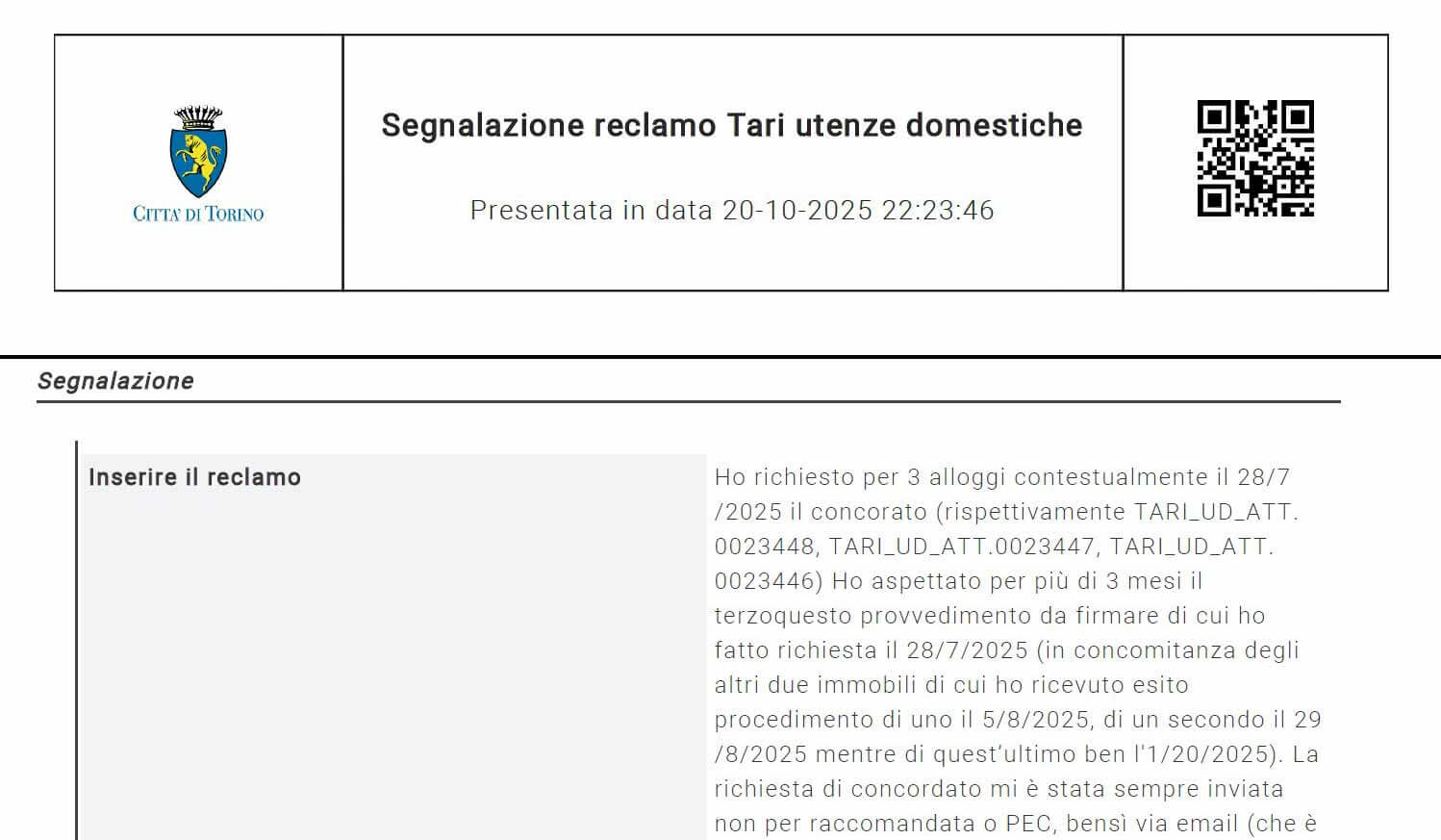 P.S. 25/10/2025 – Non avendo ad oggi ricevuto ancora riscontri se non quello dell’URP, ho inviato il tutto anche alla posta certificata tributi@cert.comune.torino.it: