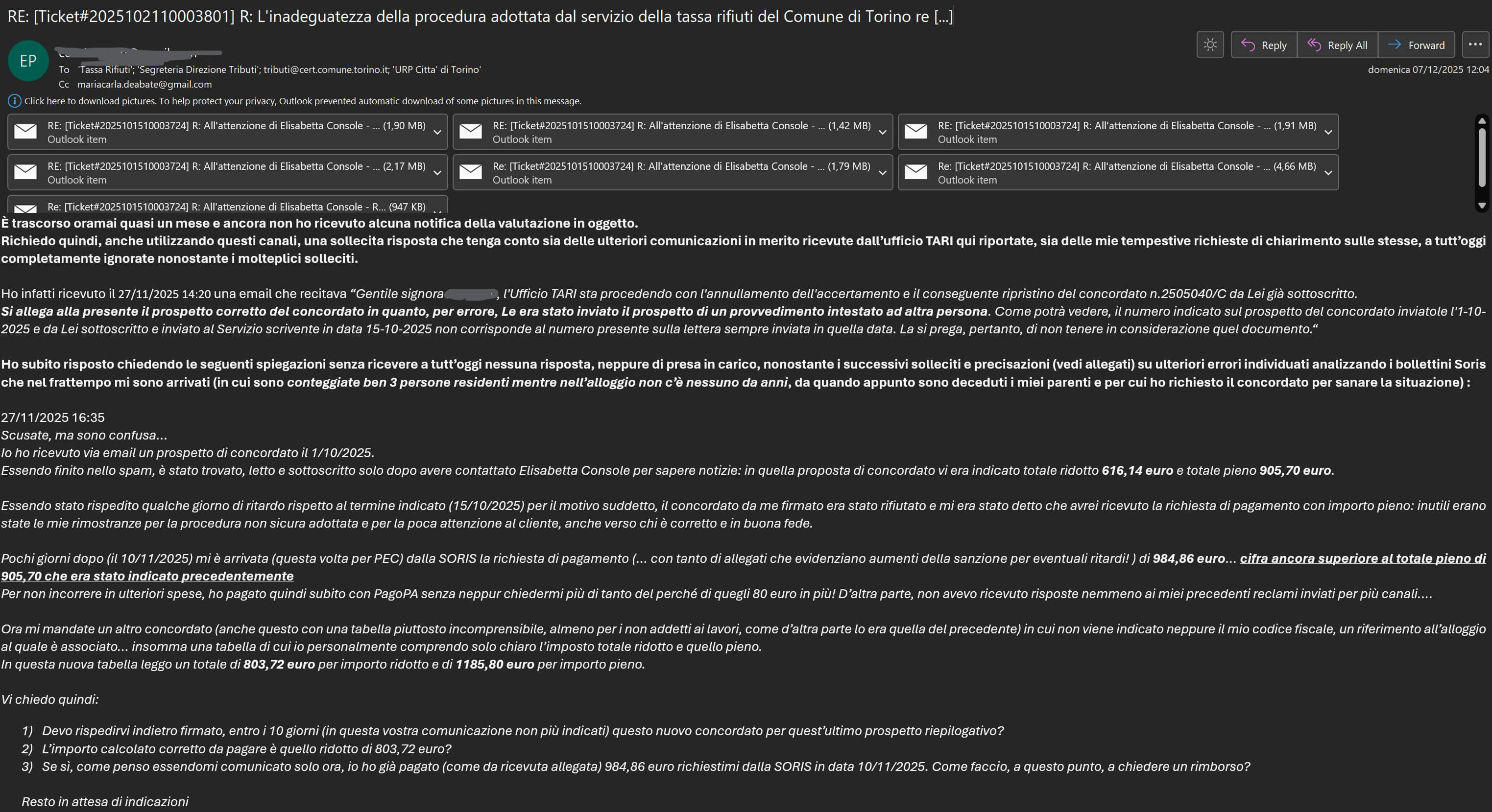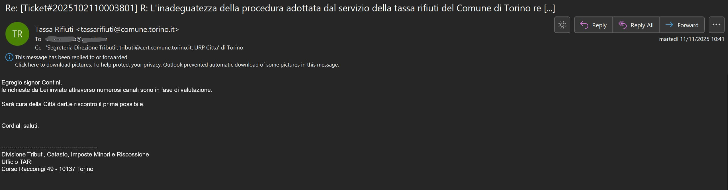 Non avendo ricevuto alcun riscontro, in risposta a quella email dell’11/11/2025 in cui mi veniva detto che le mie richieste erano in fase di valutazione e sarebbe stato cura della Città dare un riscontro il prima possibile, ho inviato (a ‘Tassa Rifiuti’ tassarifiuti@comune.torino.it; ‘Segreteria Direzione Tributi‘; tributi@cert.comune.torino.it; ‘URP Citta’ di Torino‘) la seguente email, sperando che almeno ci sia una tempestiva risposta di ricezione e presa in carico: