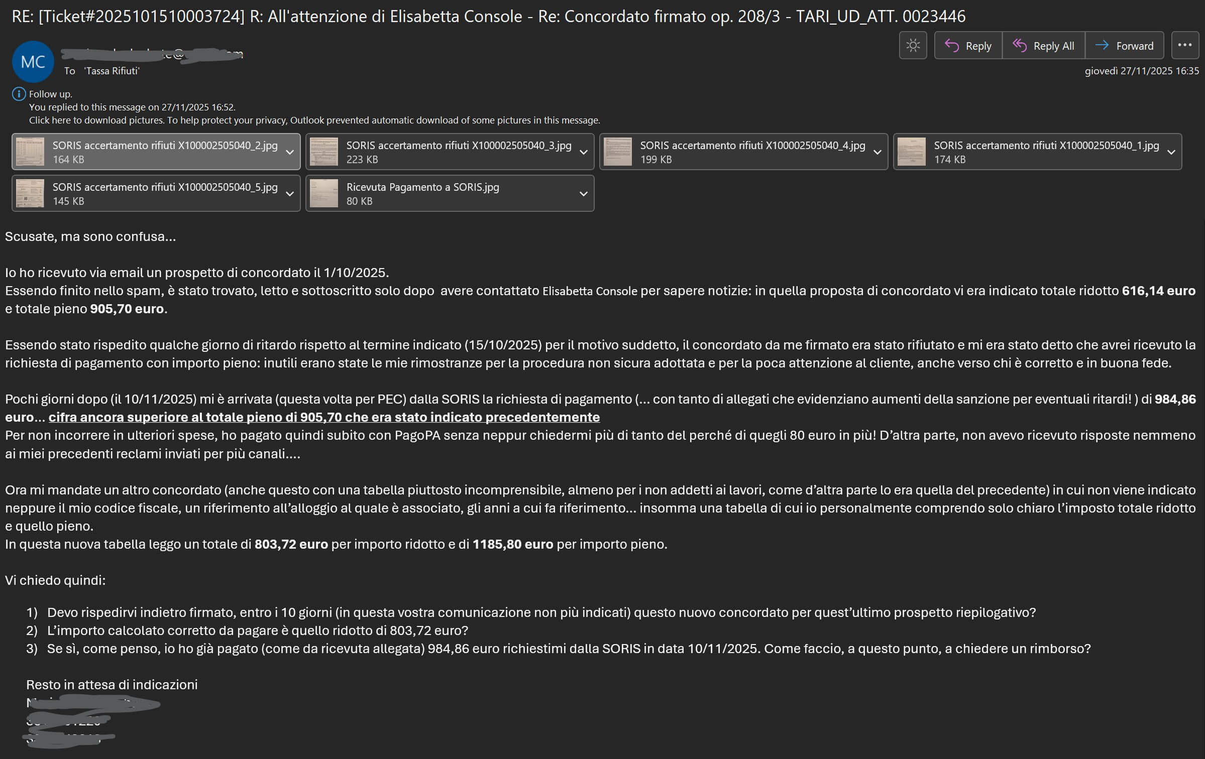 Ho infatti ricevuto il 27/11/2025 14:20 una email che recitava “Gentile signora XXXX, l’Ufficio TARI sta procedendo con l’annullamento dell’accertamento e il conseguente ripristino del concordato n.2505040/C da Lei già sottoscritto.